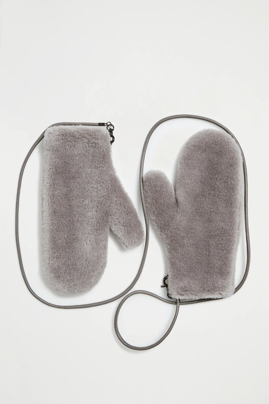 Mănuși din lână teddy bear, cu căptușeală din lână, cu un singur deget și curea detașabilă din piele. Culoarea gri.