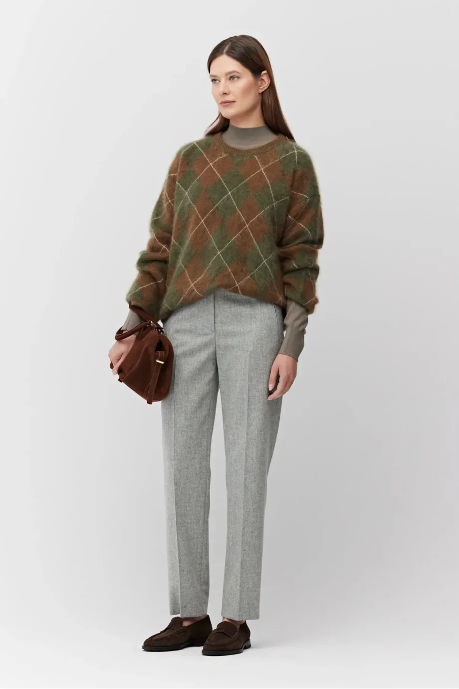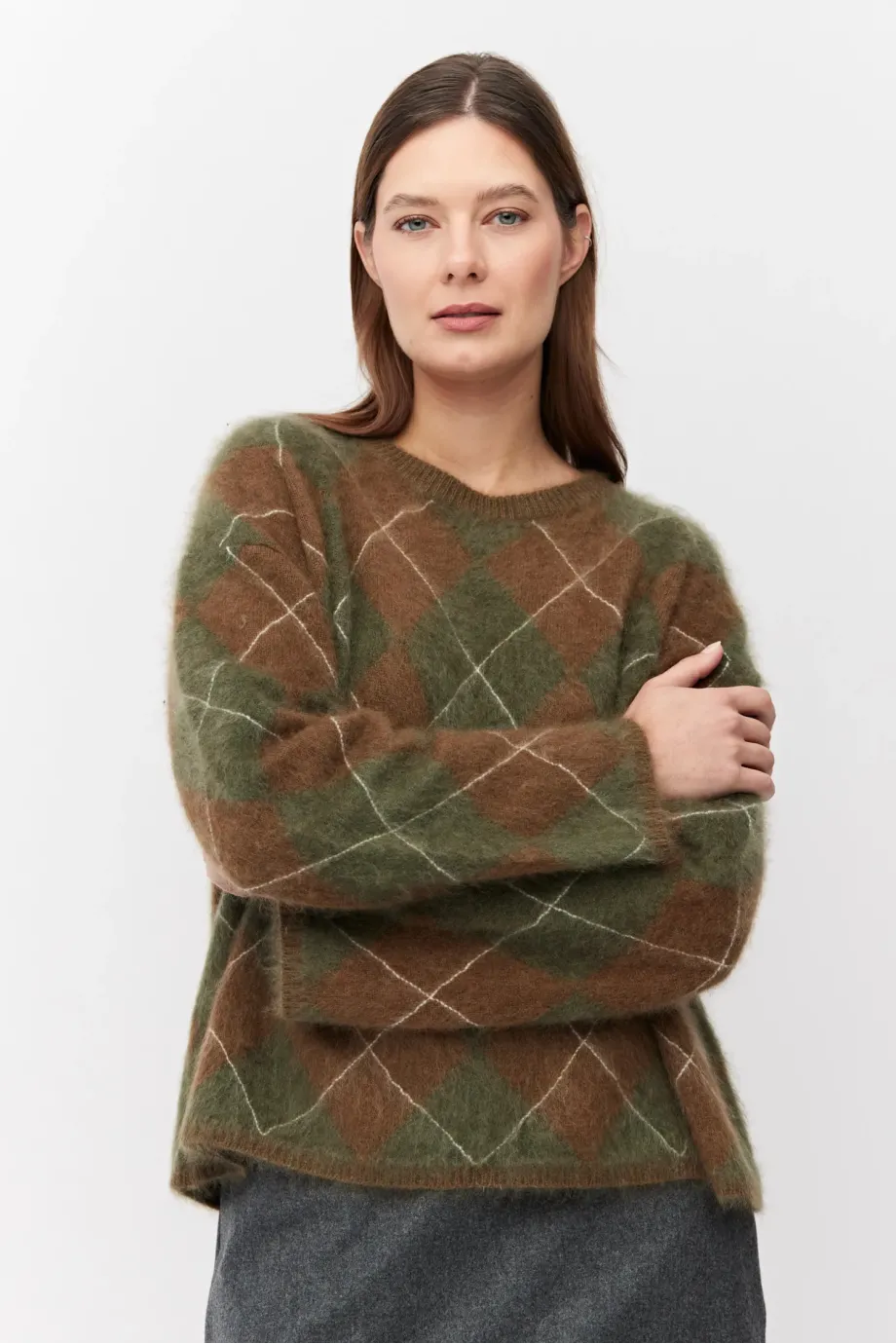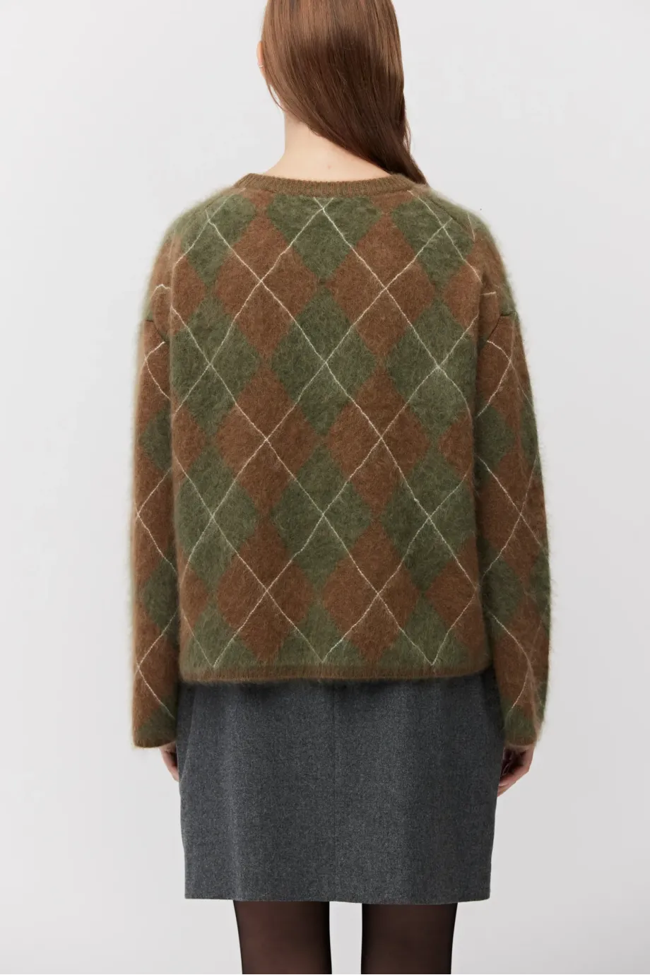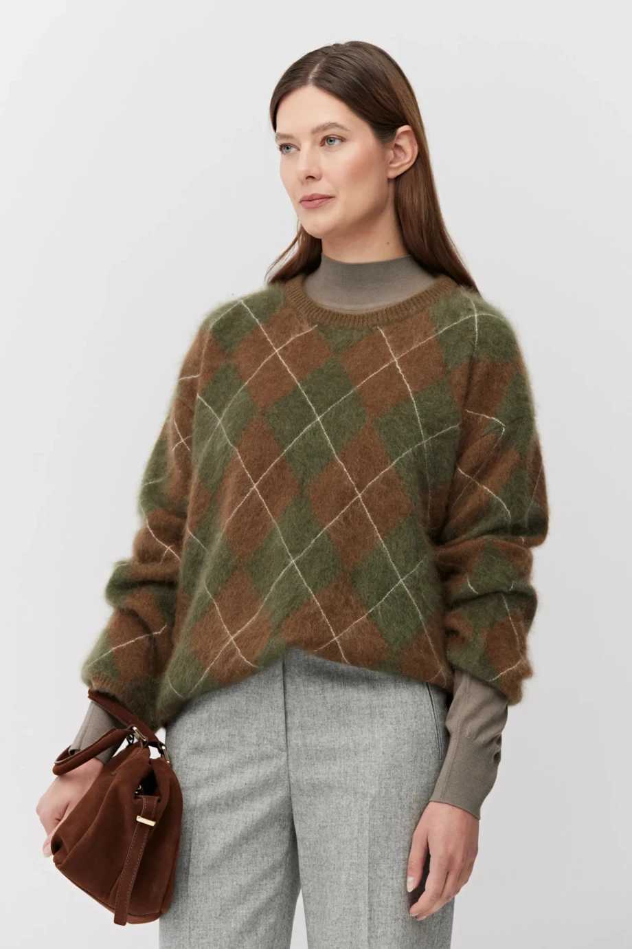 Pulover din cașmir, în nuanțe de maro și verde. Decolteu rotund, mâneci lungi, lejere. Tricot moale, lejer, în tehnică intarsia, confecționat la mașină de calibru 7 GG.