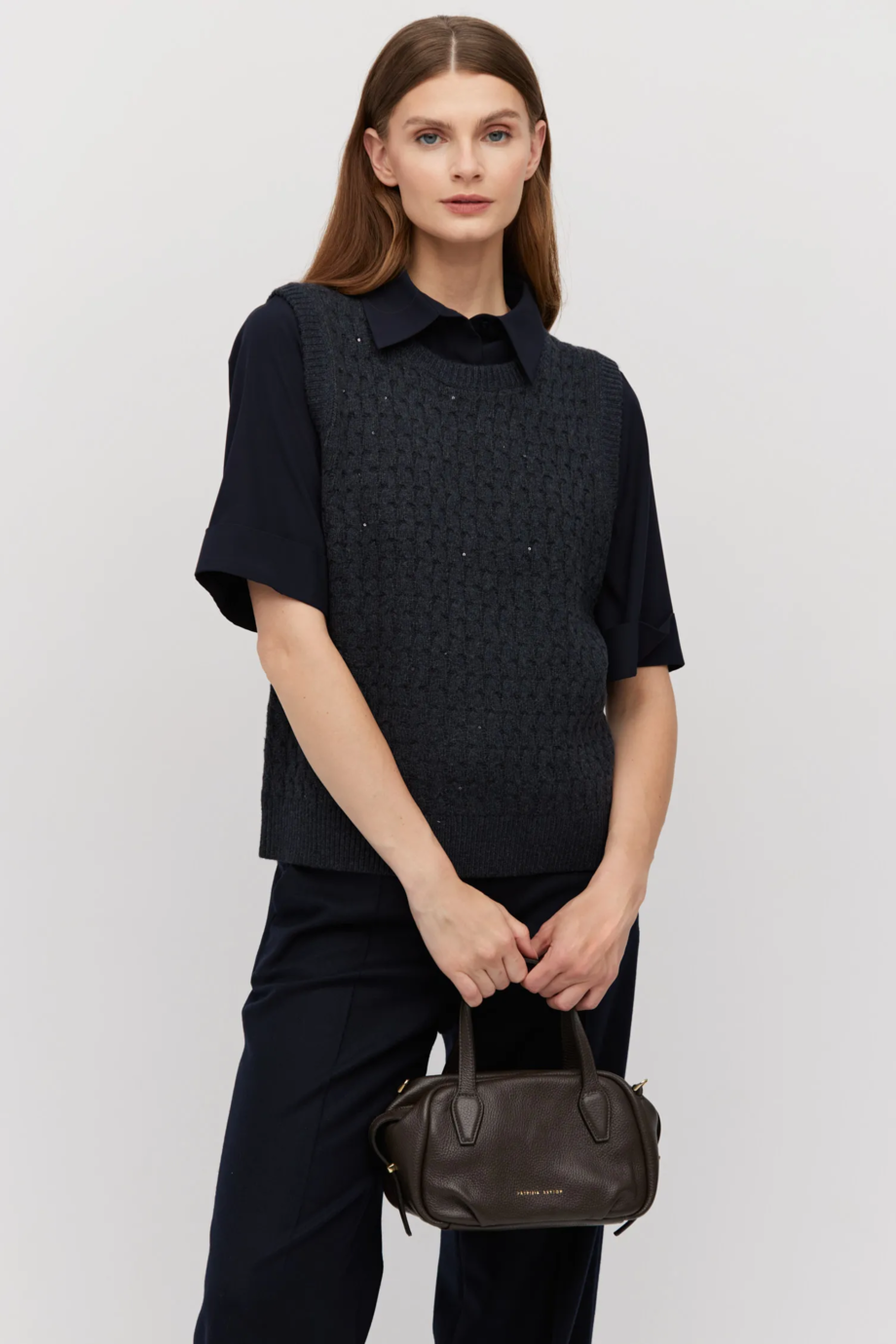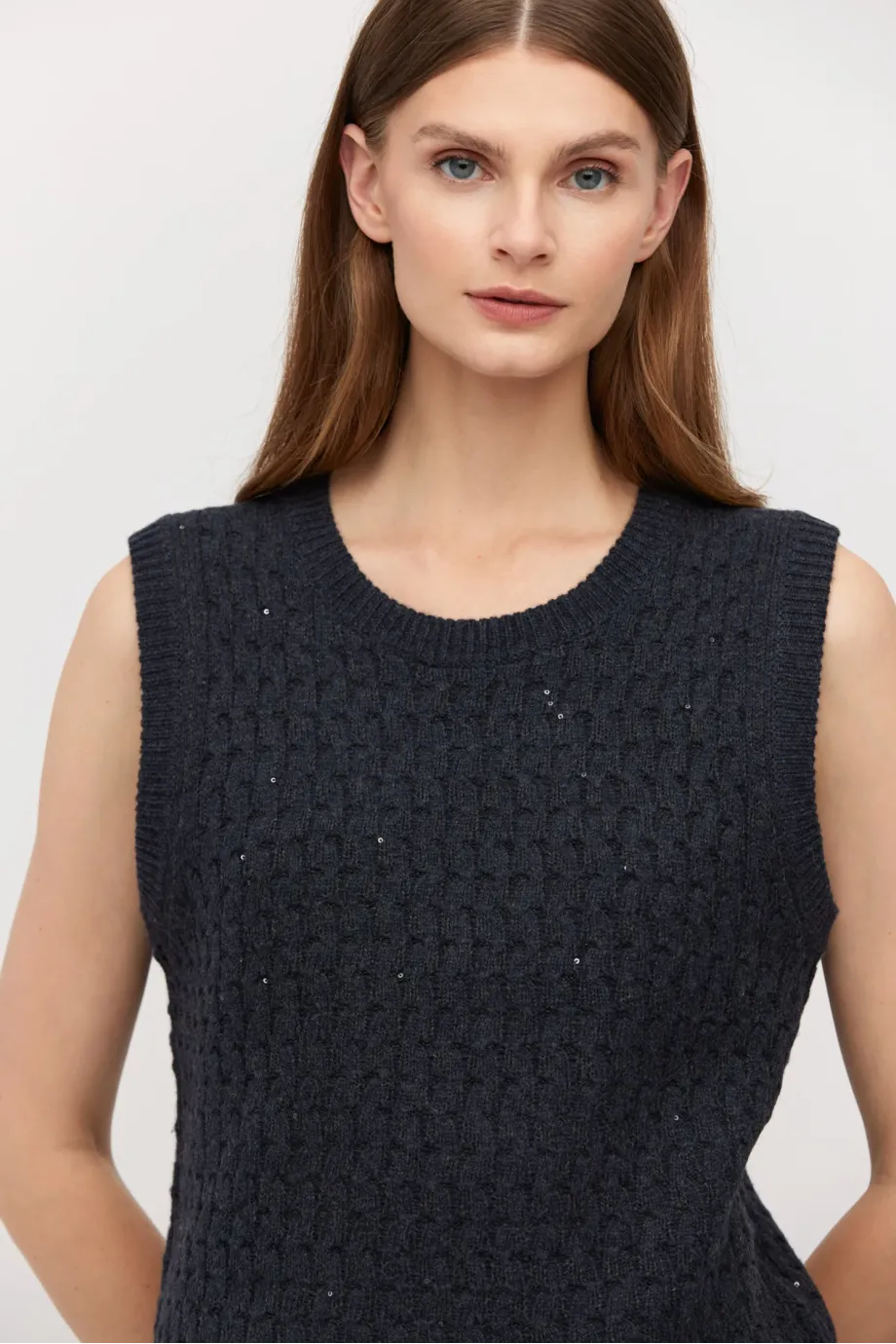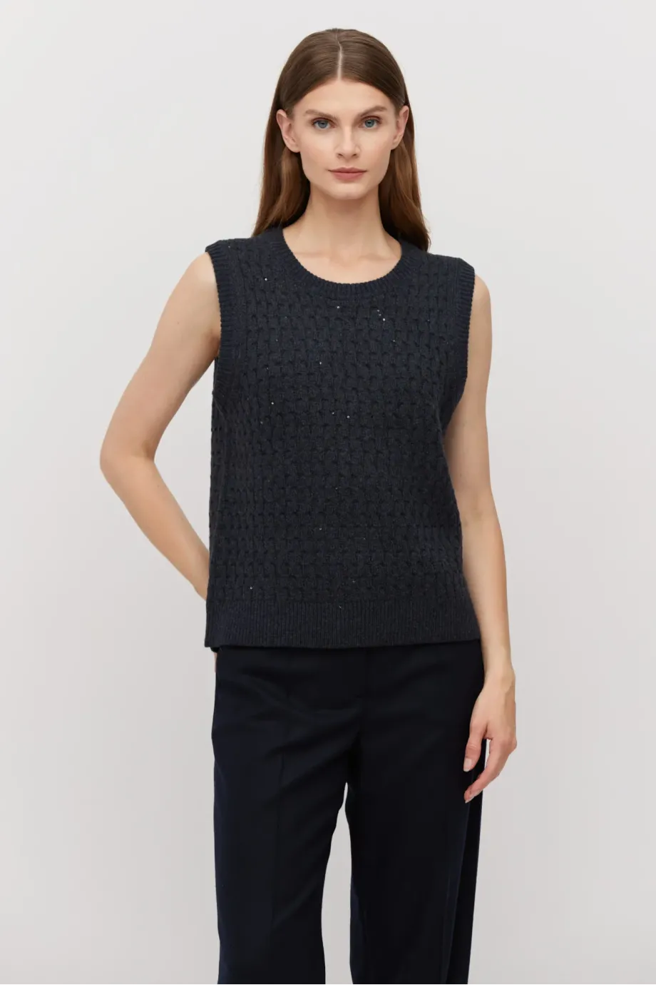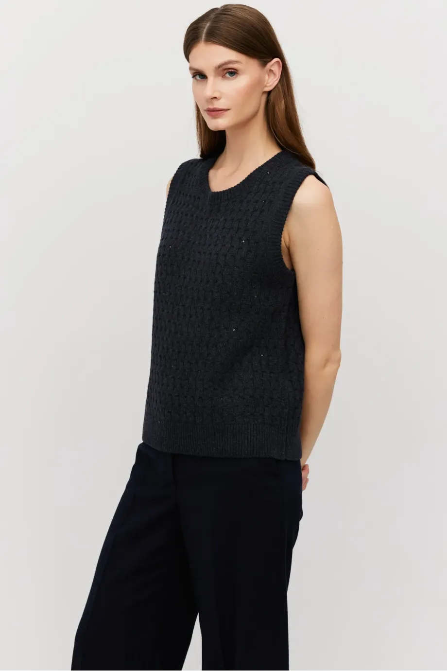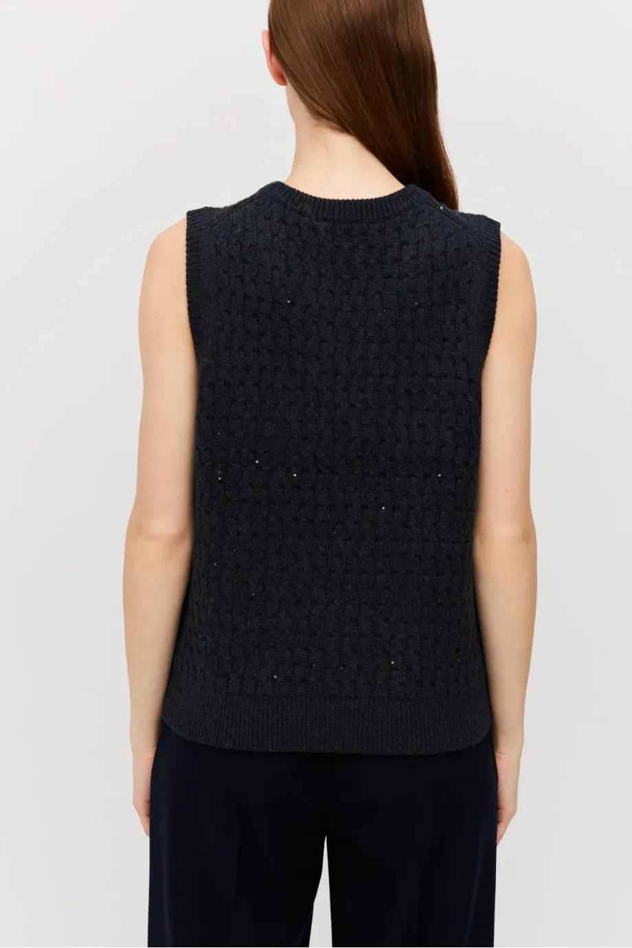 Bluză tip vestă, de culoarea grafit, din lână merinos. Croială cambrat, cu decolteu rotund. Tricot cu fir delicat lurex.