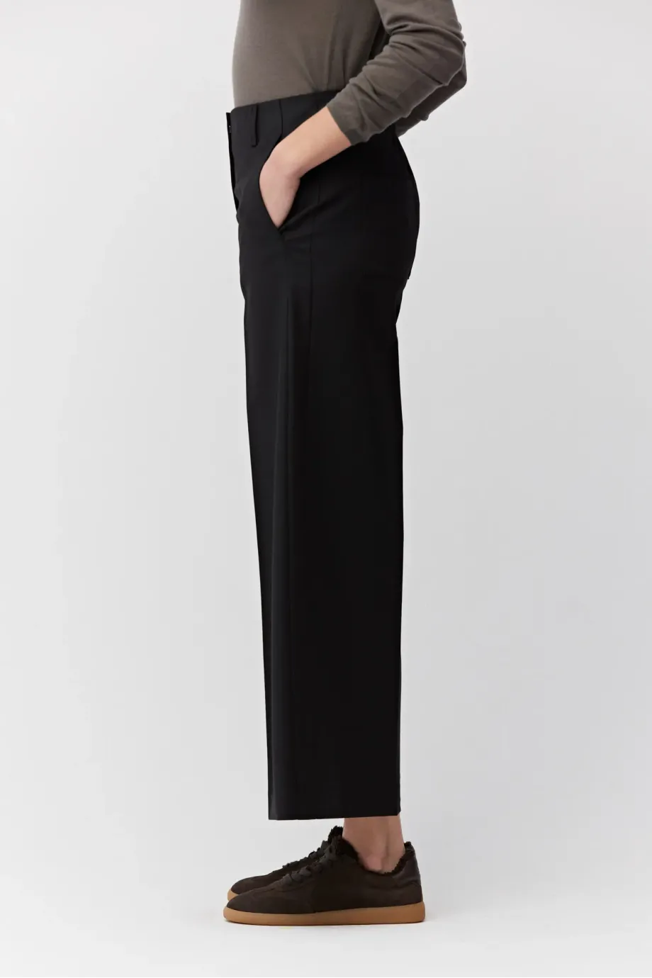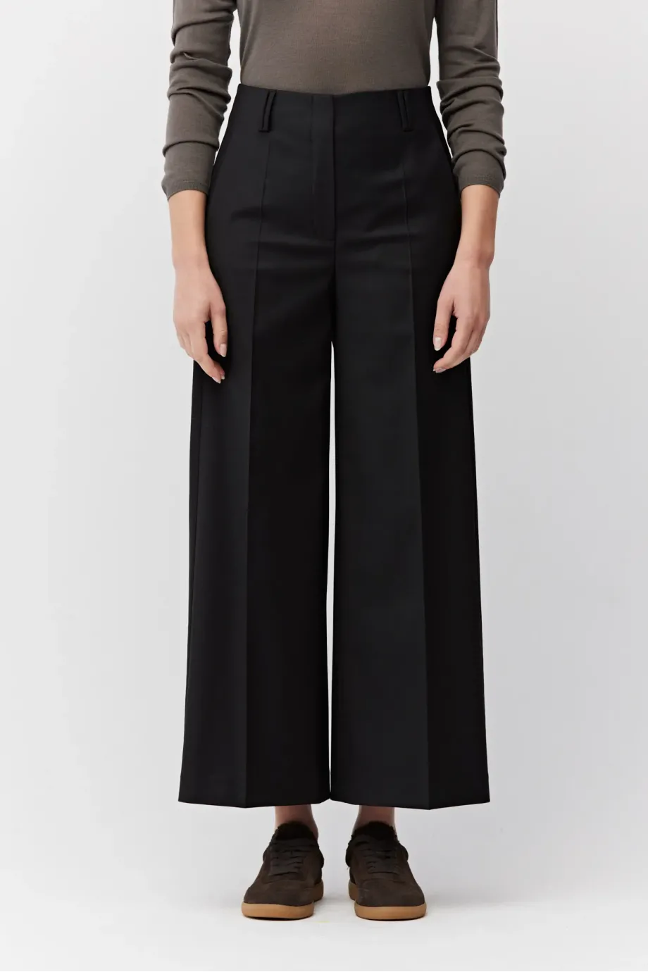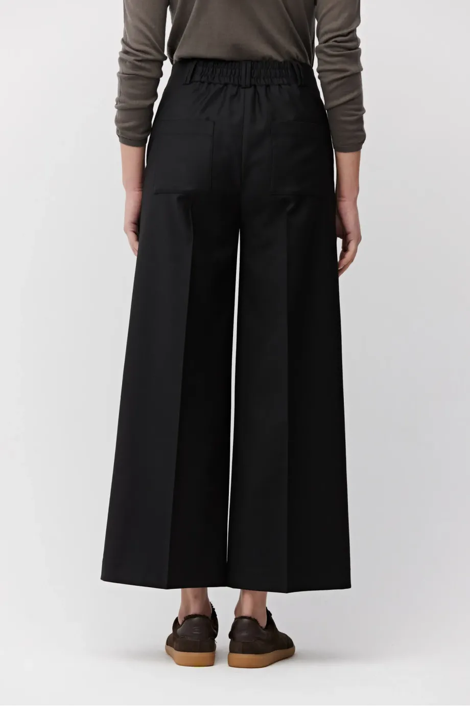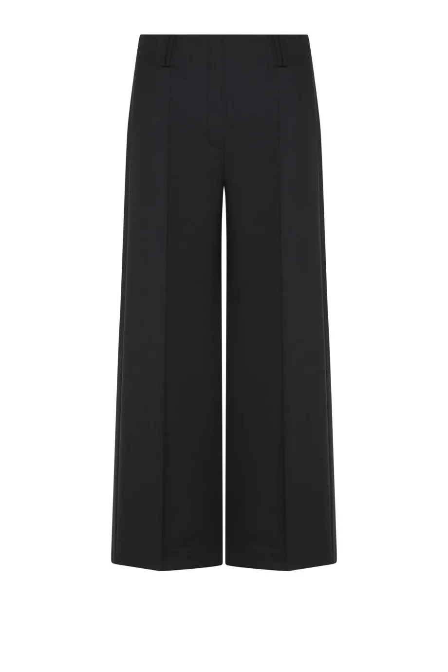 Pantaloni negri cu adaos de lână. Croială culotte, larg. Buzunare și bride. Închidere cu fermoar ascuns, cârlig și nasture interior din nucă corozo. Interior cu paspoal decorativ. Bandă laterală.