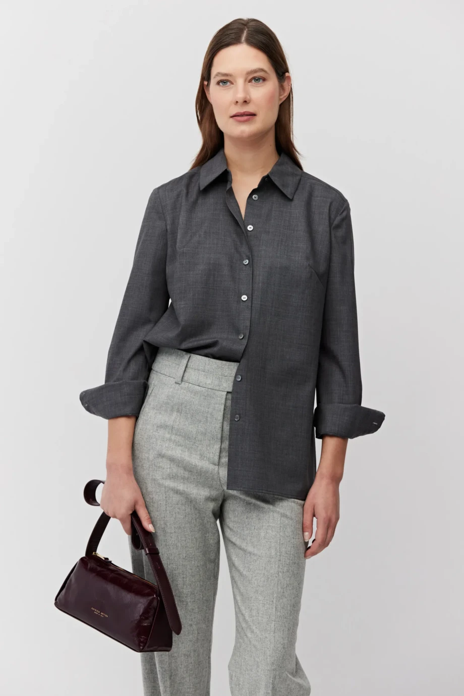 Cămașă din lână, cu manșete late. Guler clasic și nasturi din sidef. Mâneci lungi. Culoarea gri închis.