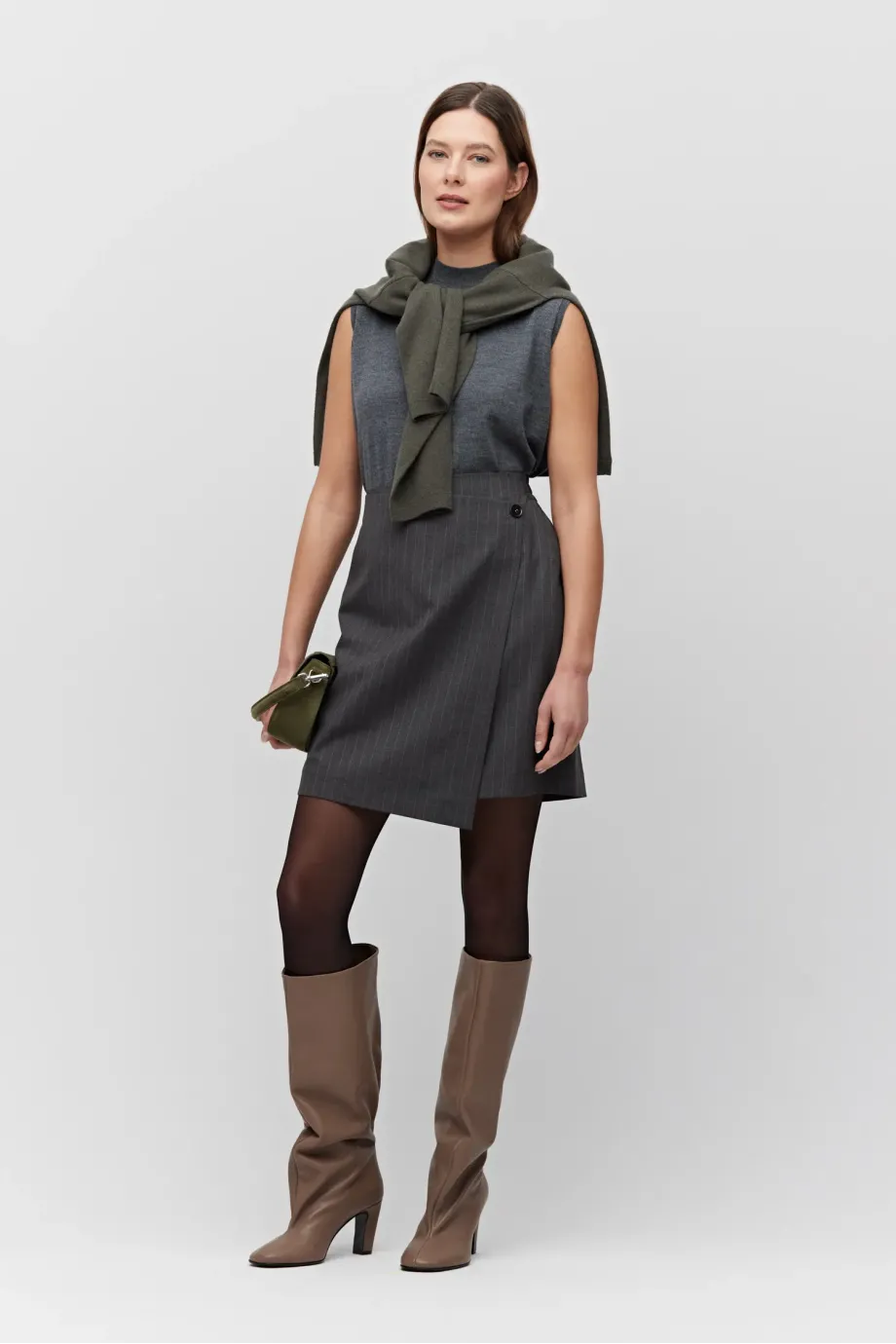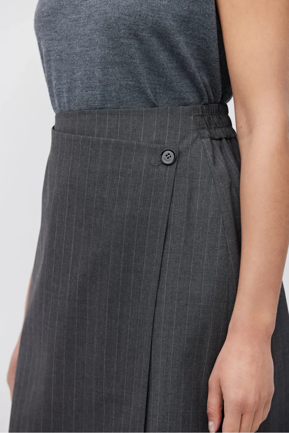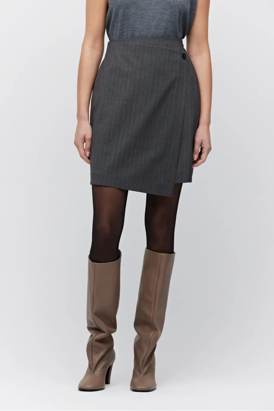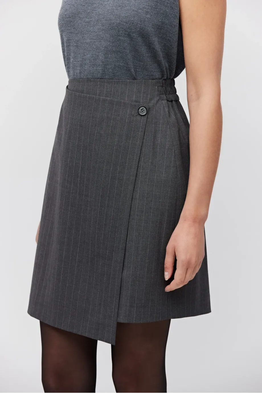 Fustă mini din lână cu model tenis. Căptușită, închidere frontală cu nasture din sidef. Elastic la spate. Gri.