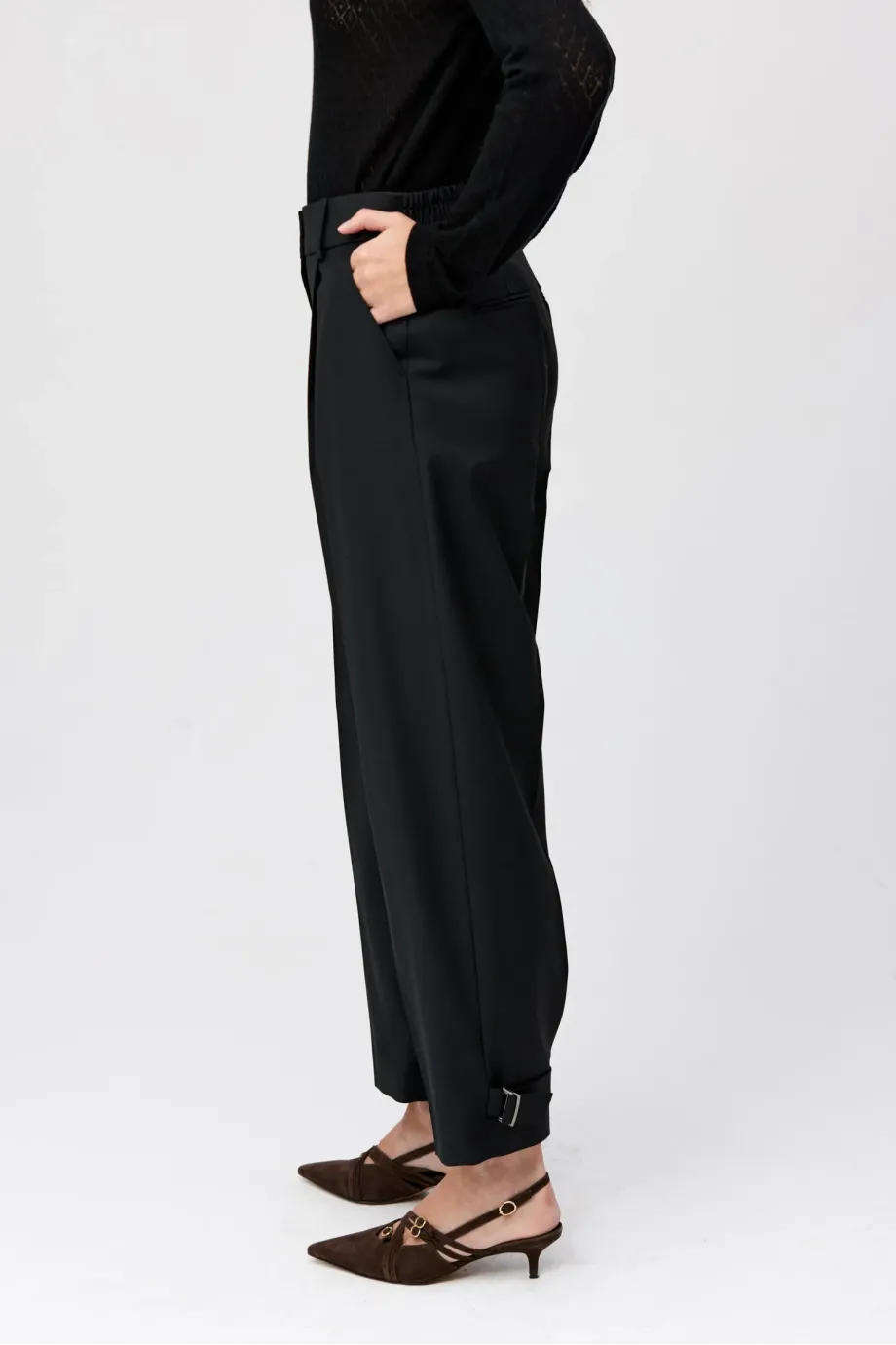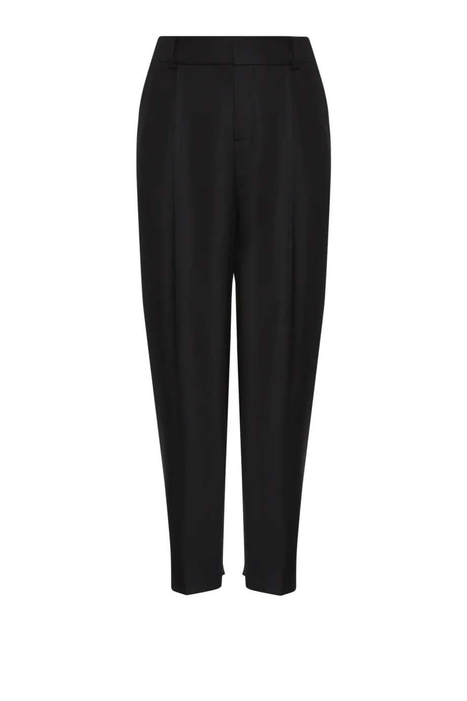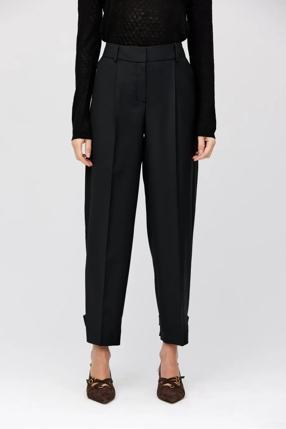 Pantaloni din lână. Culoare neagră. Picior îngustat, talie elastică la spate. Buzunare laterale, finisaje interioare decorative. Închidere cu cârlig de oțel și nasture din nuc natural corozo.