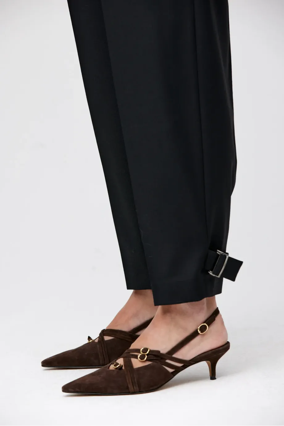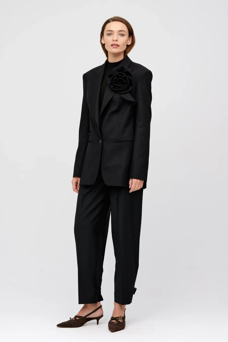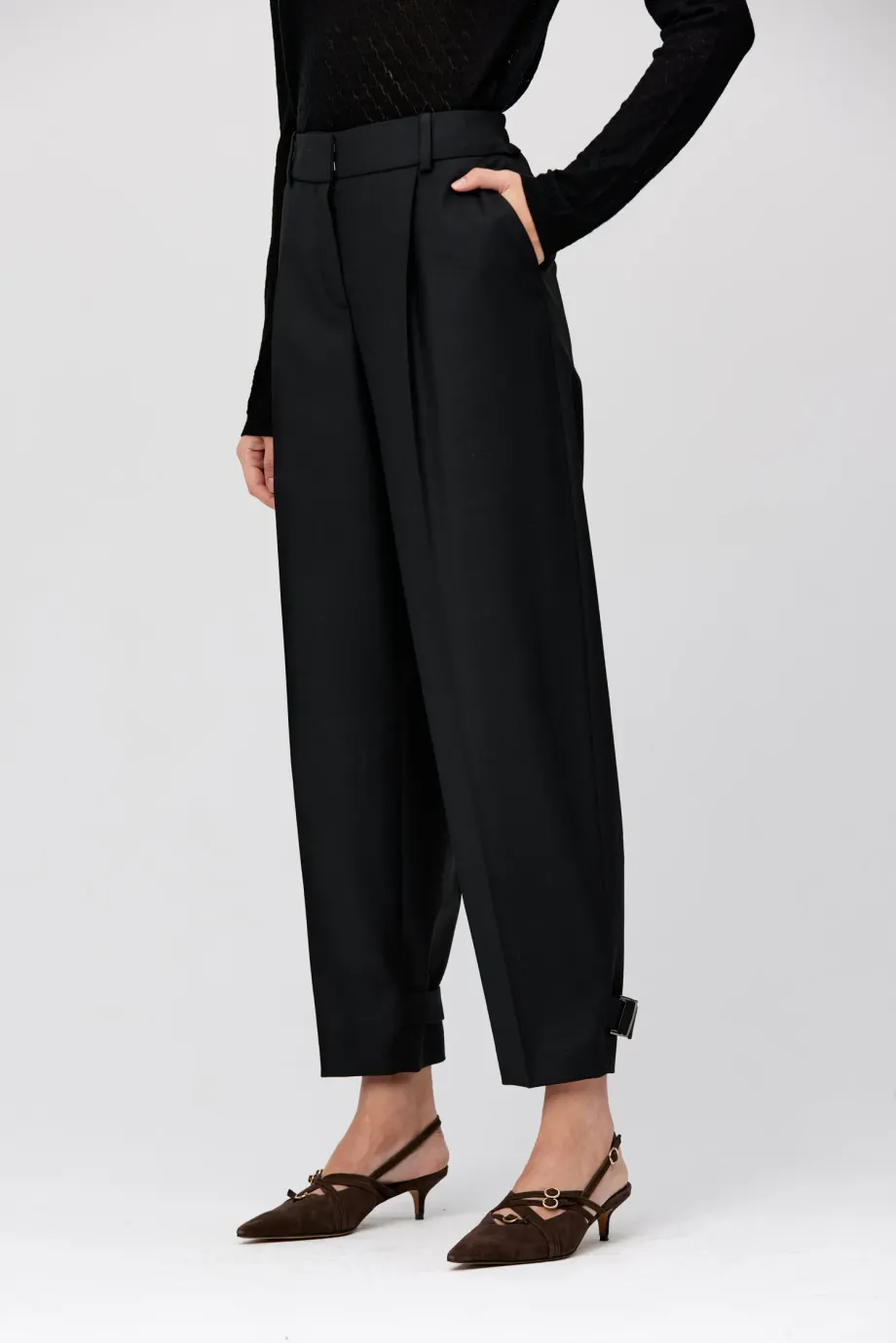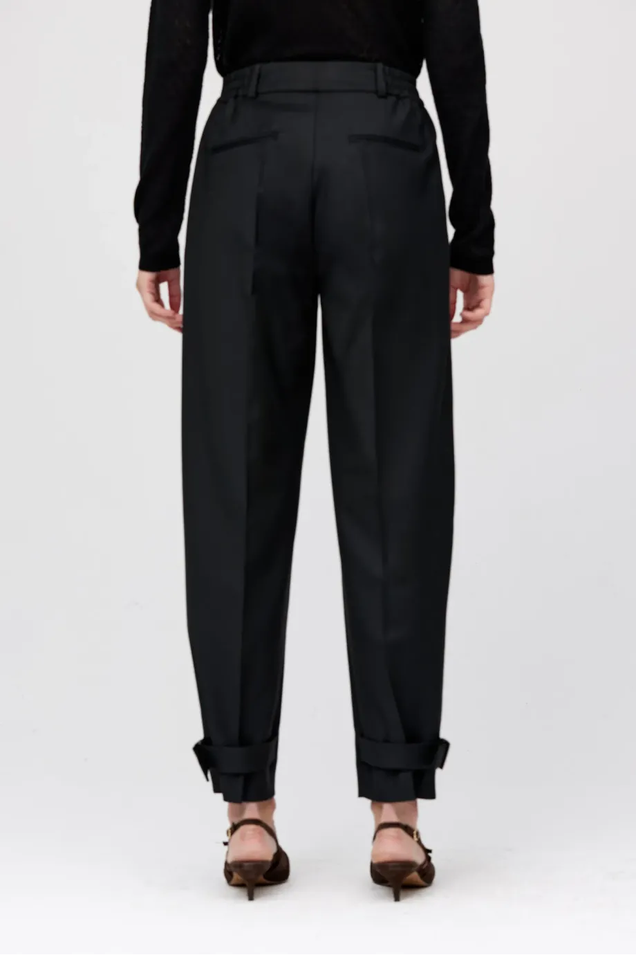 Pantaloni din lână. Culoare neagră. Picior îngustat, talie elastică la spate. Buzunare laterale, finisaje interioare decorative. Închidere cu cârlig de oțel și nasture din nuc natural corozo.