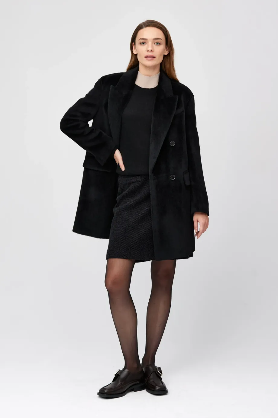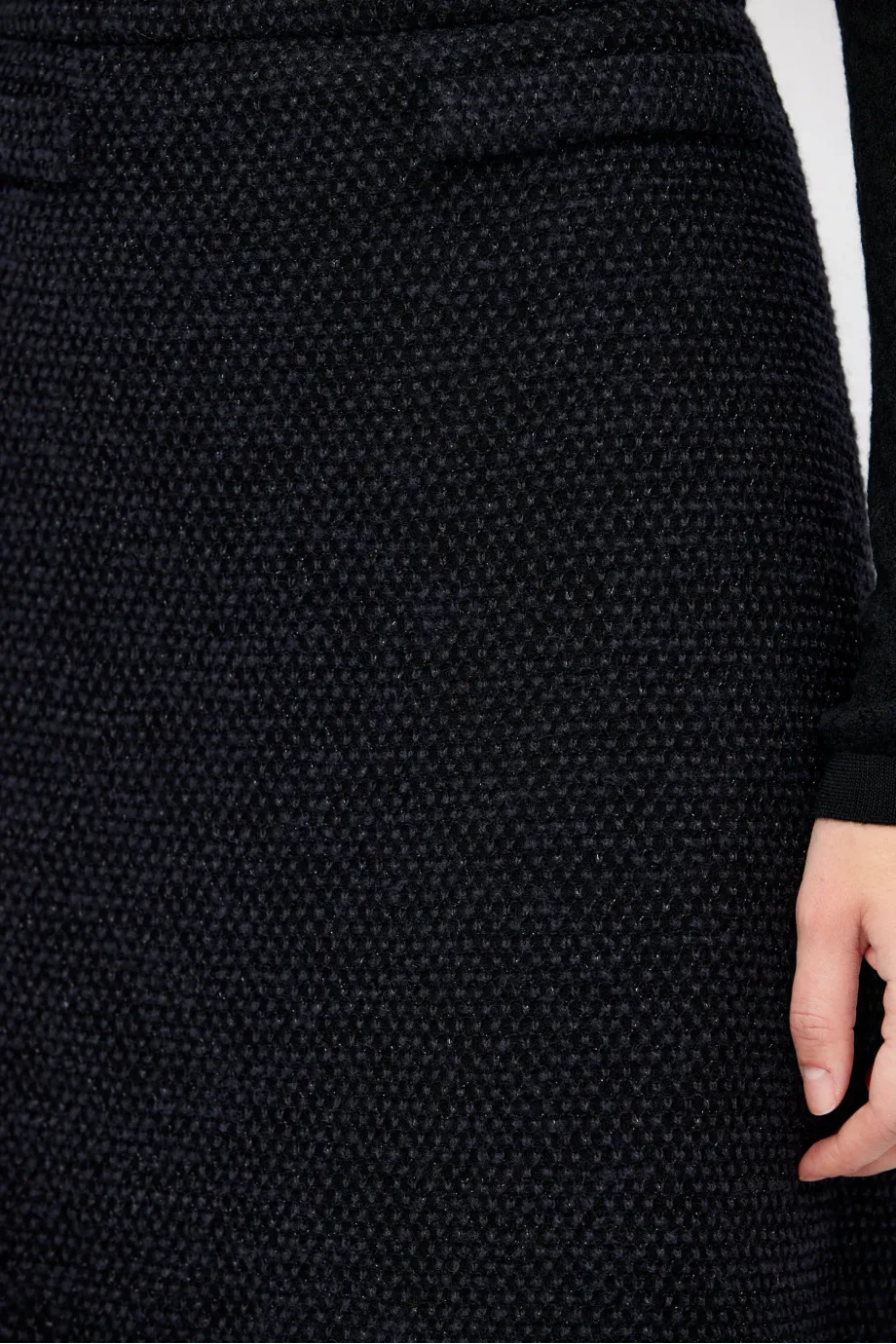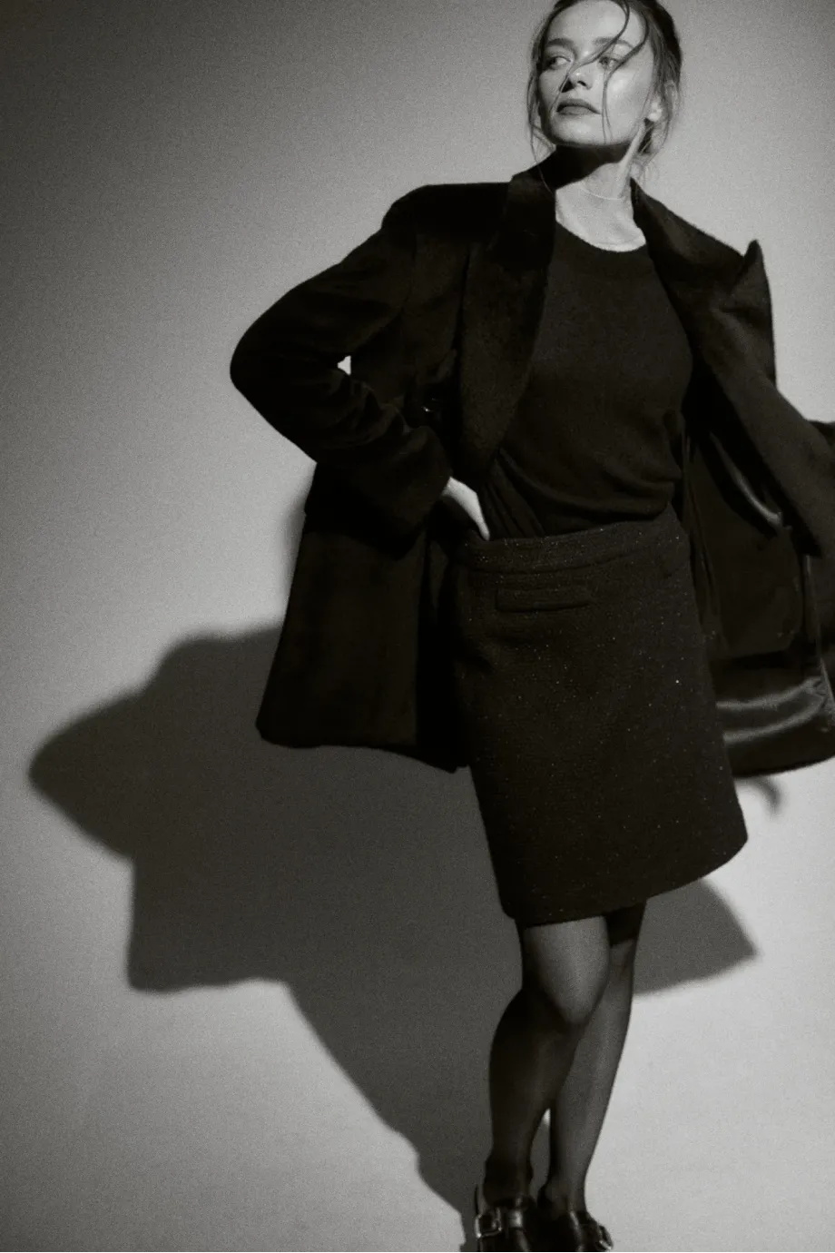 Fustă mini neagră cu căptușeală. Țesătură cu amestec de lână. Elastic în talie.