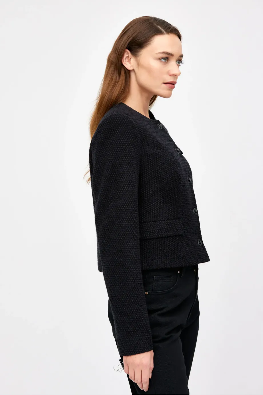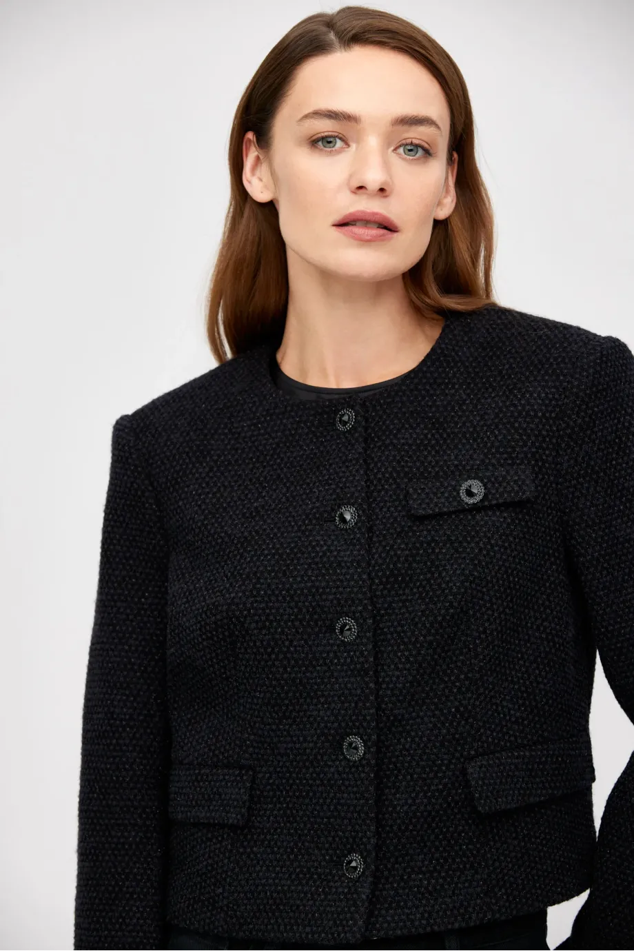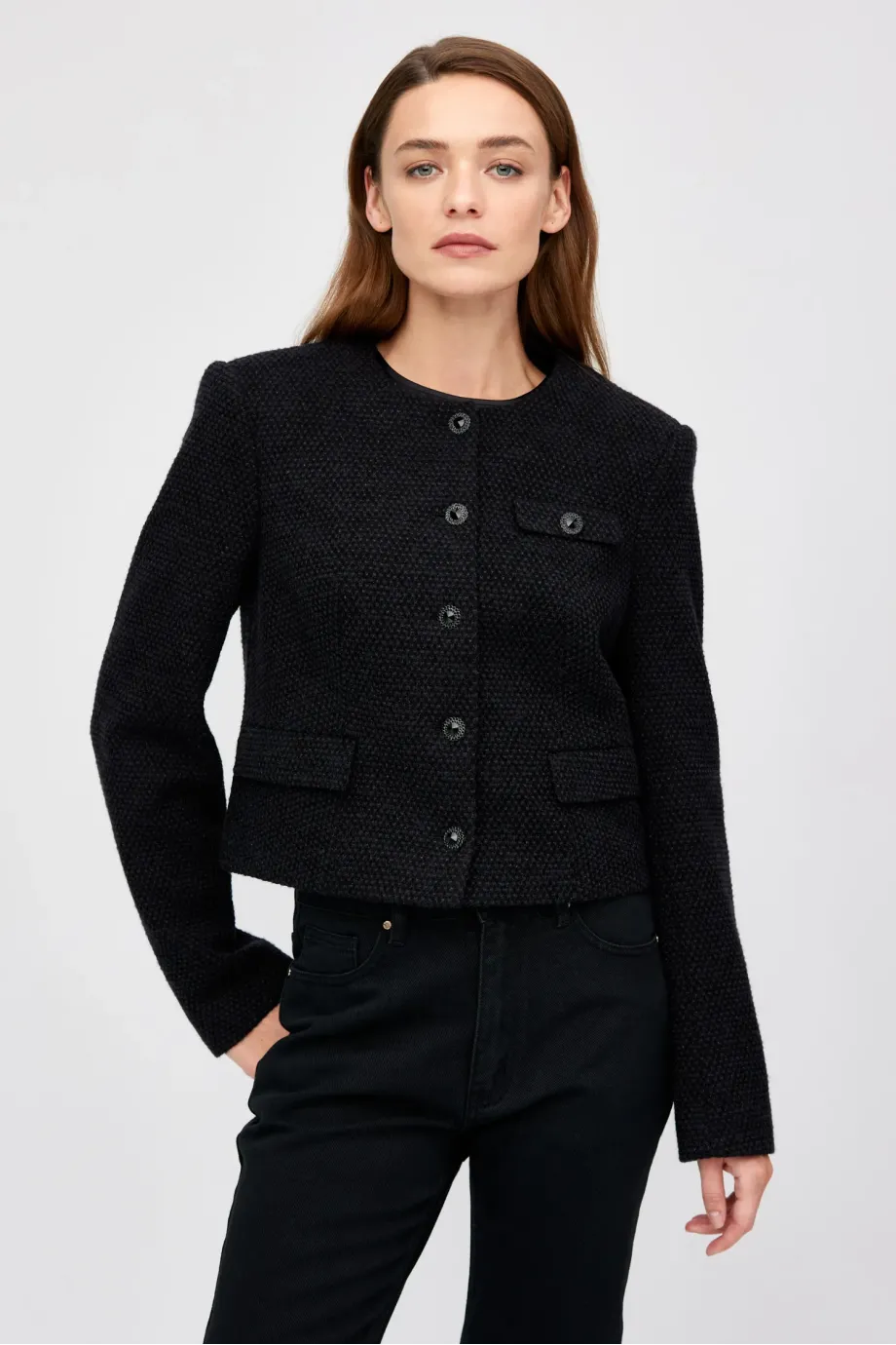 Sacou cu un singur rând de nasturi, cu amestec de lână. Croială boxy, mânecă lungă, închidere cu nasturi. Buzunare. Model căptușit, cu cusături decorative și piping pe interior. Culoare neagră.