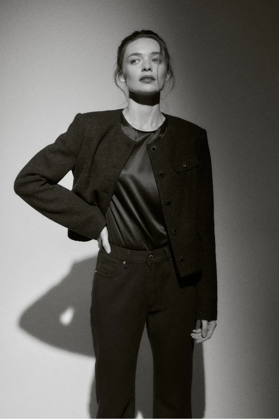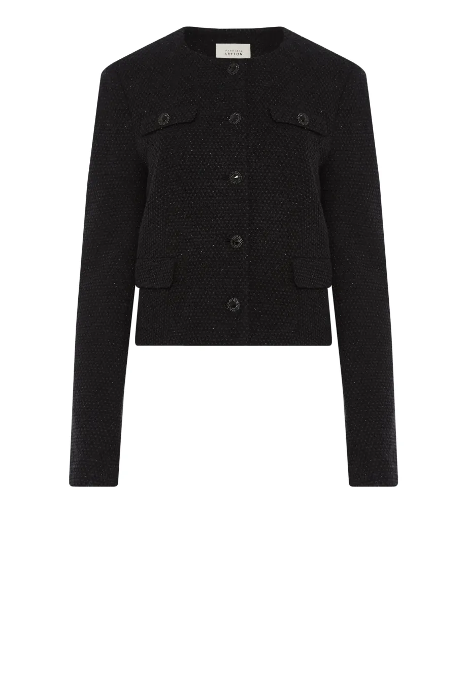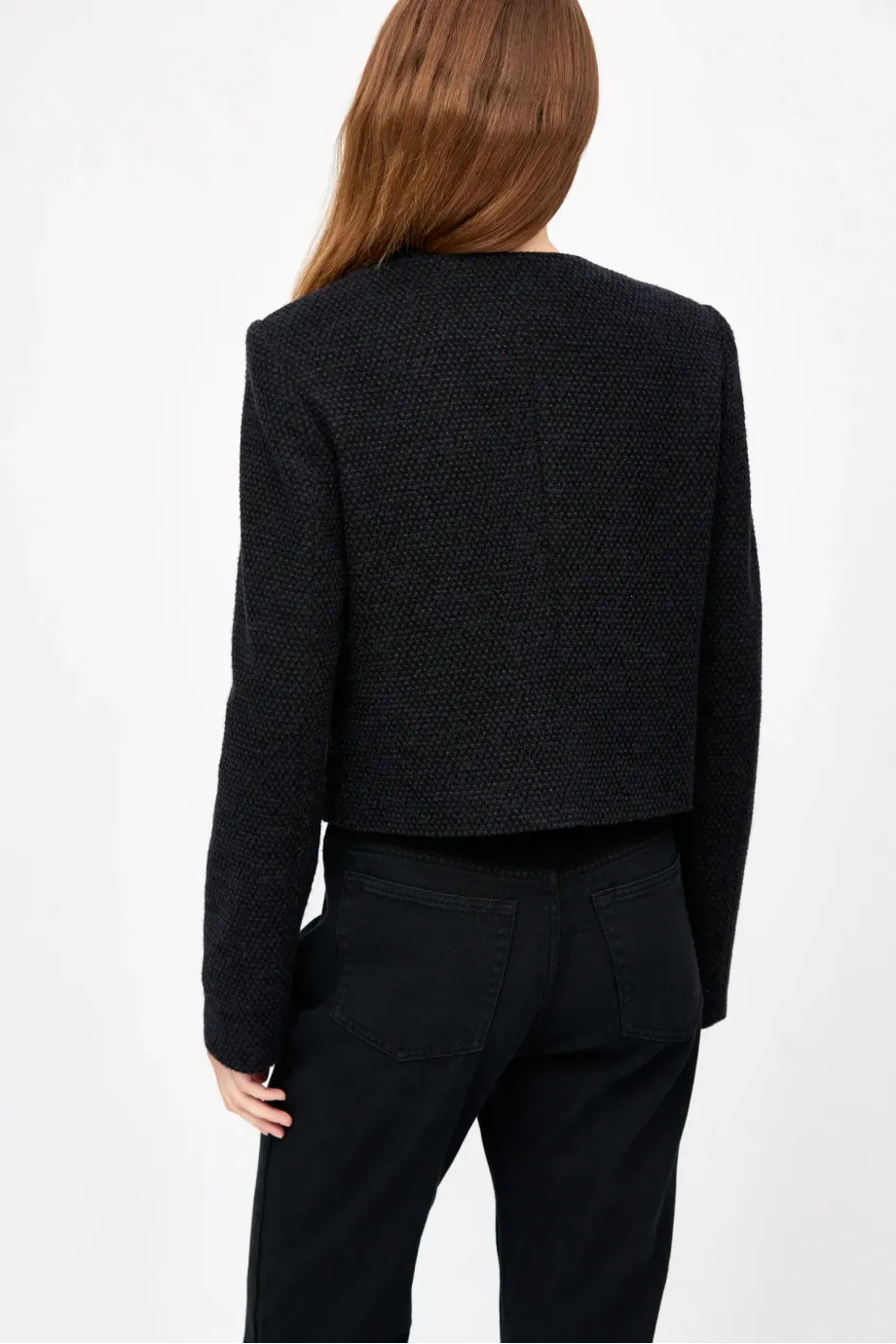 Sacou cu un singur rând de nasturi, cu amestec de lână. Croială boxy, mânecă lungă, închidere cu nasturi. Buzunare. Model căptușit, cu cusături decorative și piping pe interior. Culoare neagră.