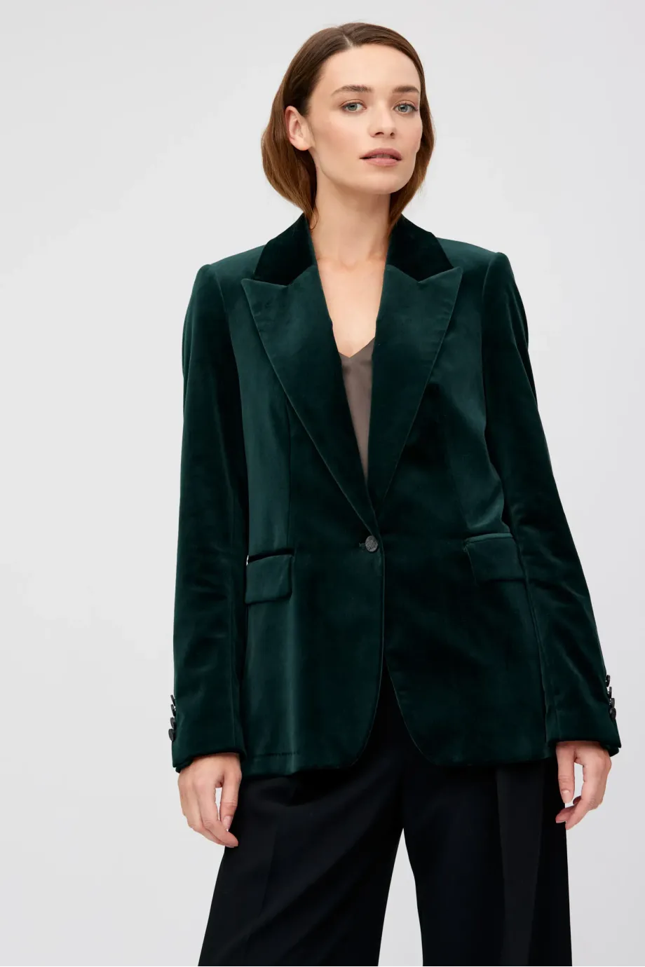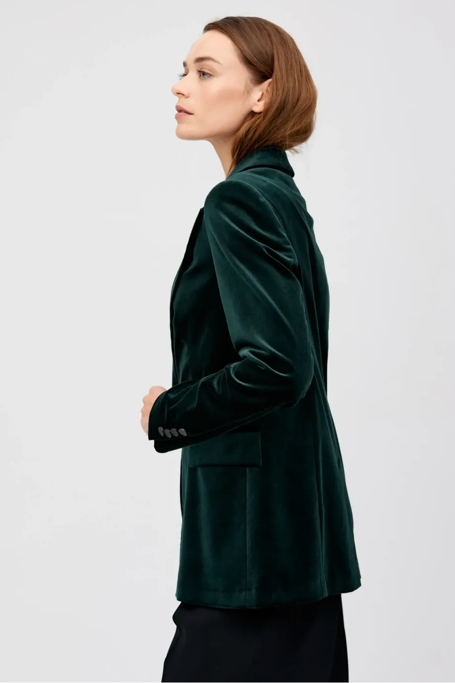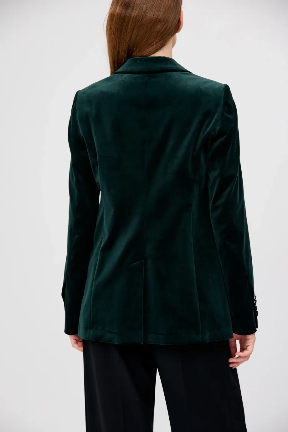 Sacou cu un singur rând de nasturi, din țesătură de catifea. Croială ușor ajustată, mânecă lungă, închidere cu nasture din os natural. Buzunare. Model căptușit, cu cusături decorative și piping pe interior. Culoare verde.