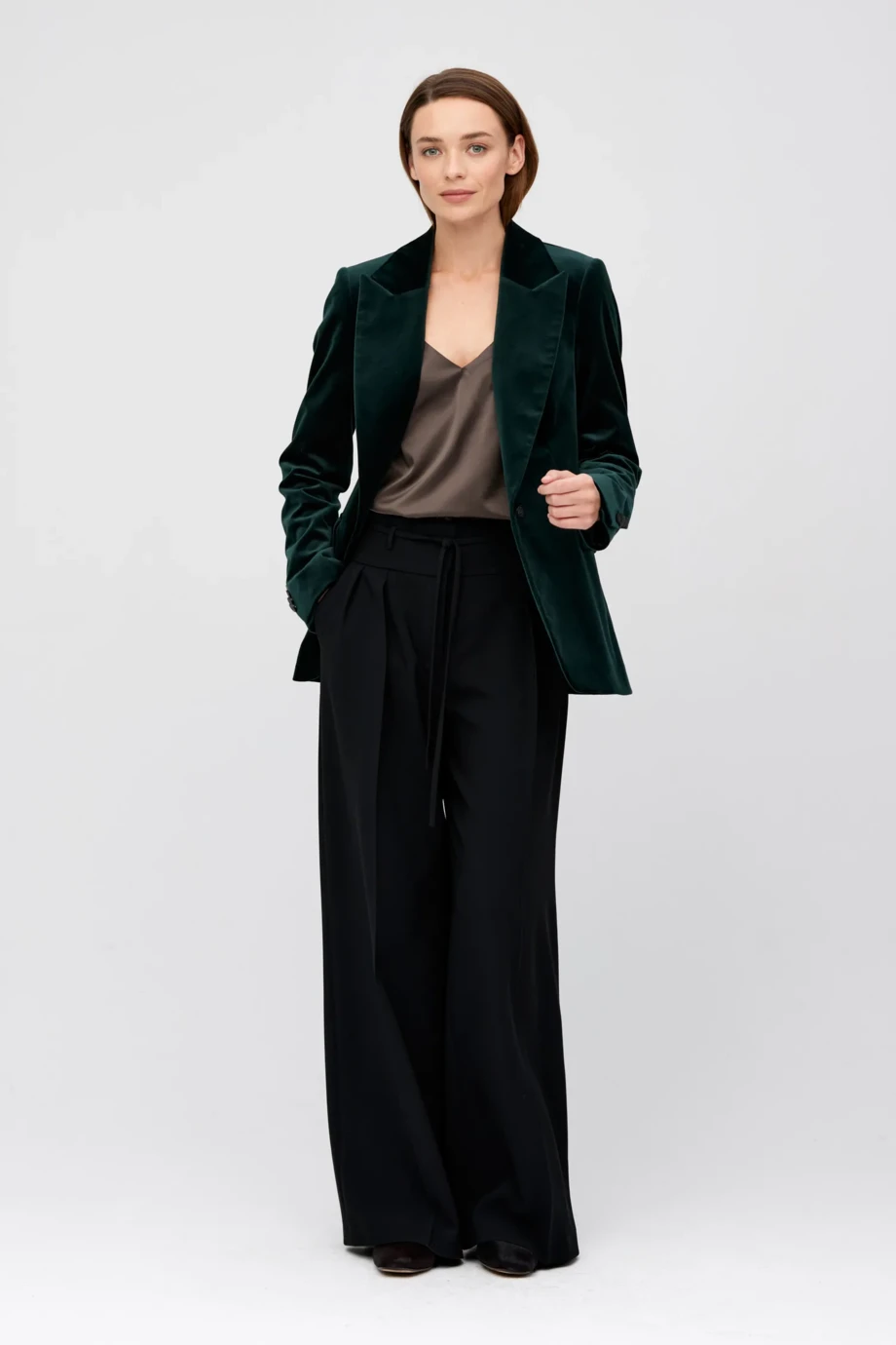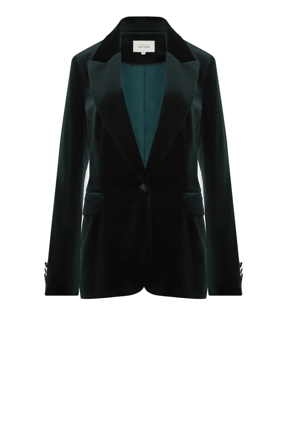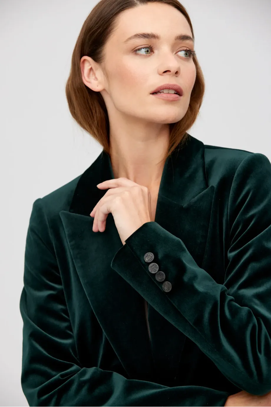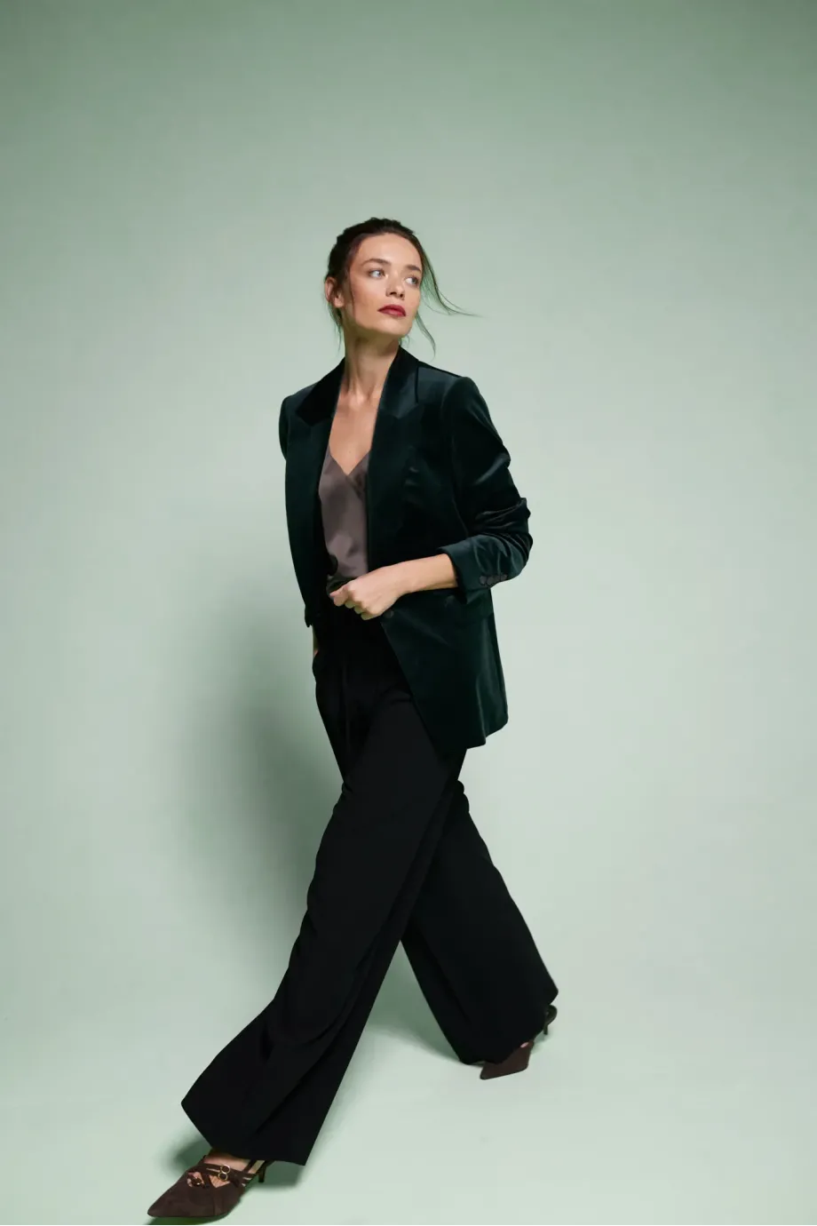 Sacou cu un singur rând de nasturi, din țesătură de catifea. Croială ușor ajustată, mânecă lungă, închidere cu nasture din os natural. Buzunare. Model căptușit, cu cusături decorative și piping pe interior. Culoare verde.