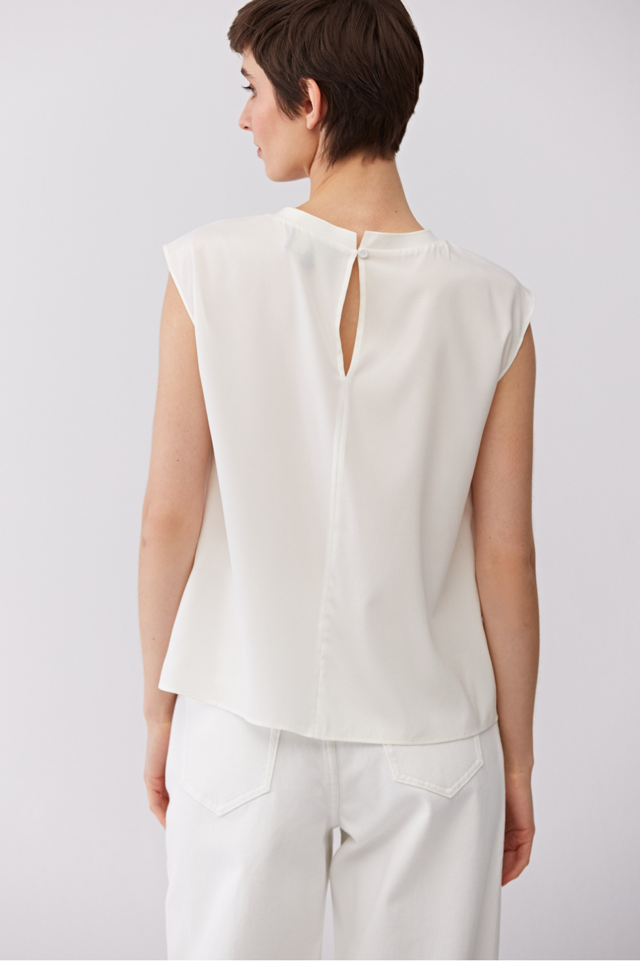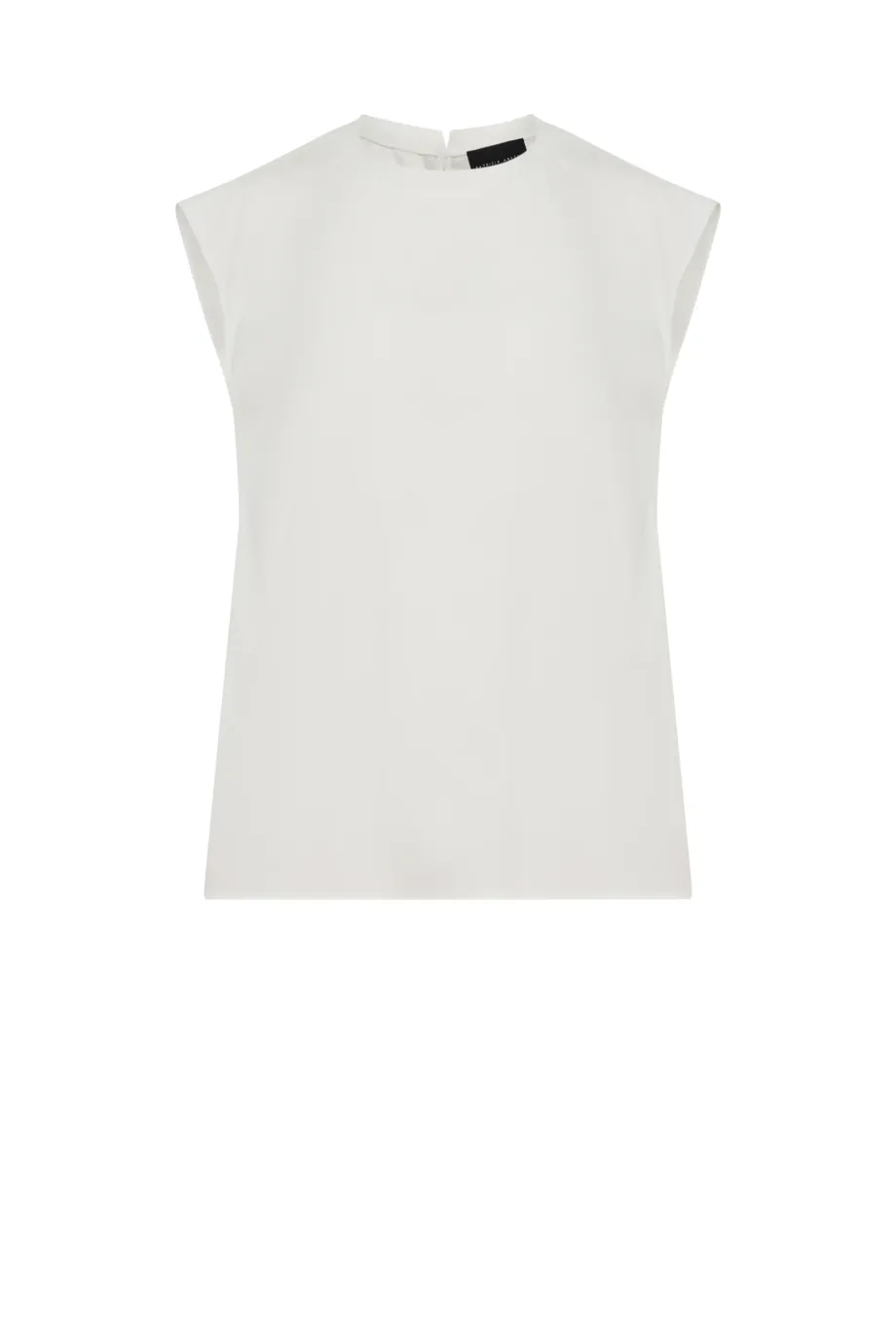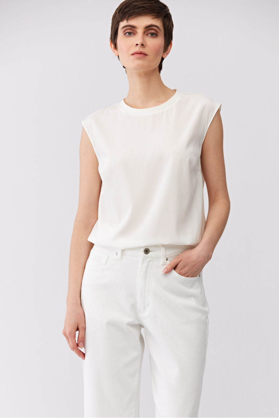 Bluză albă cu mătase și tricot pe spate. Decolteu rotund. Croială dreaptă, lejeră, fără mâneci. Închidere cu nasture la spate.