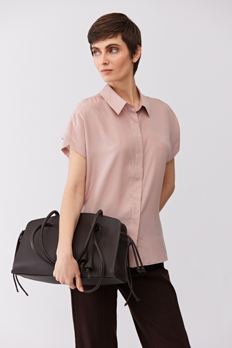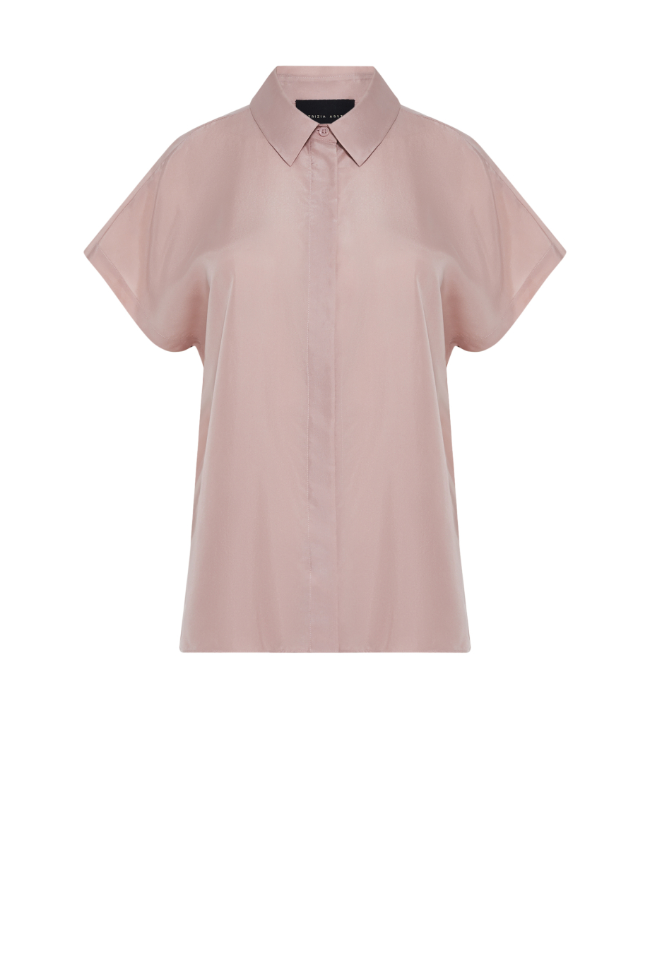 Bluză din mătase. Guler, mânecă scurtă. Închidere cu nasturi naturali. Croială dreaptă, lejeră. Culoare roz.