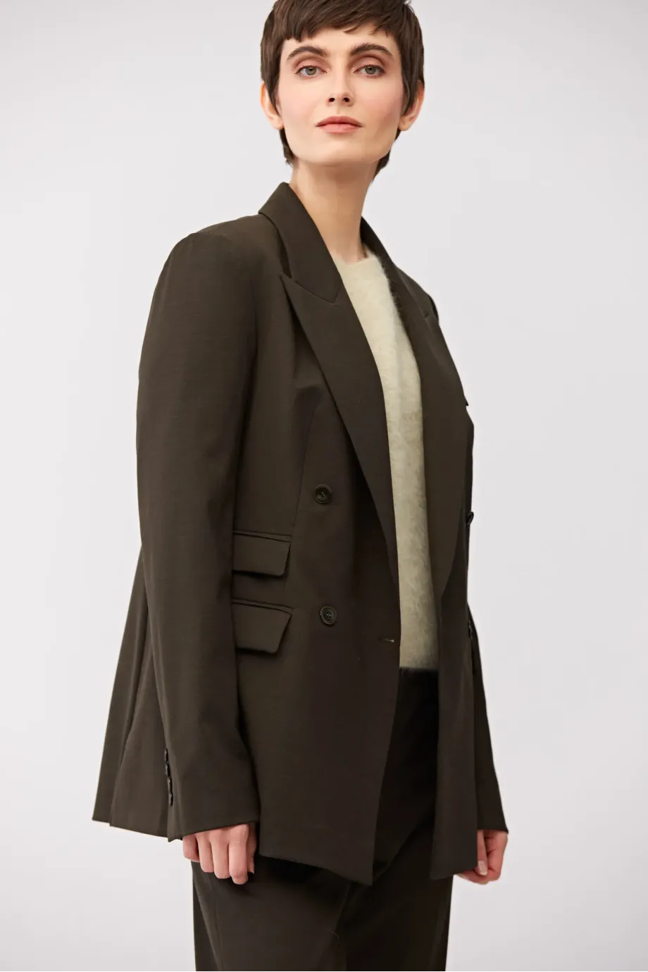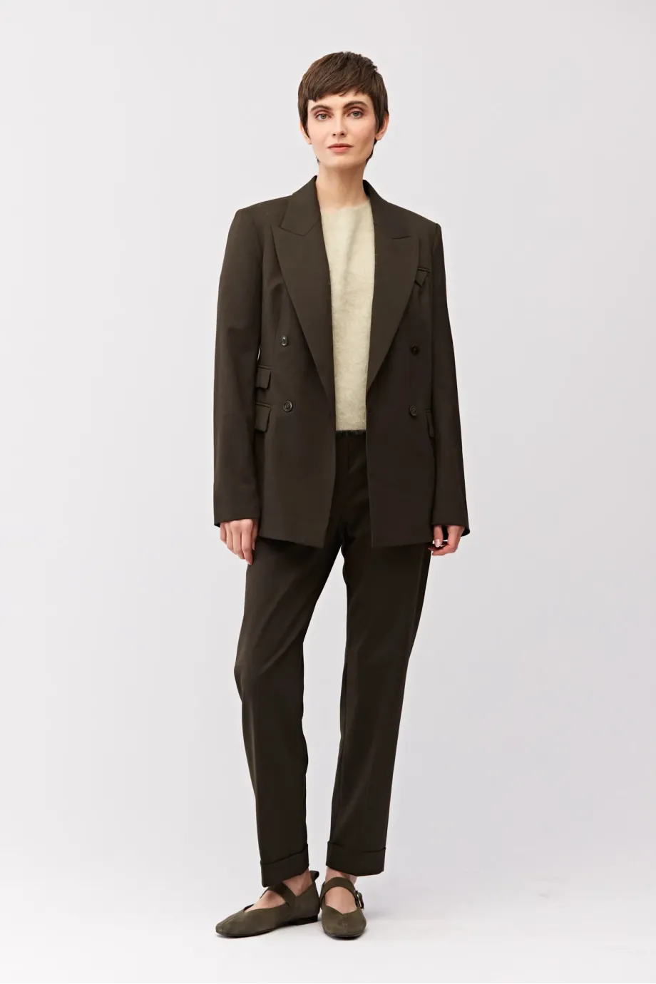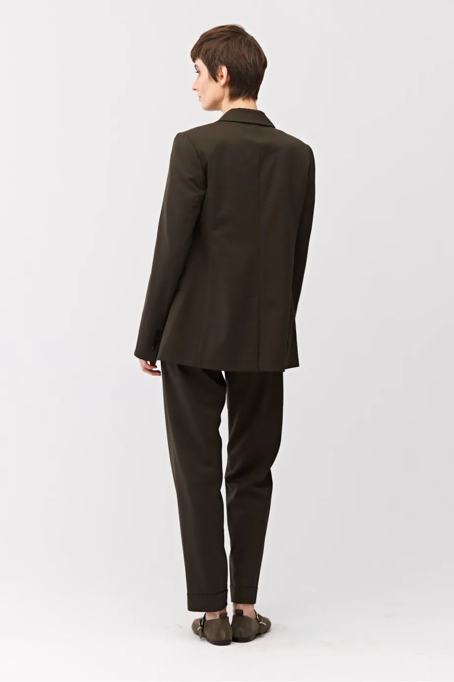 Sacou din lână pentru costum, cu două rânduri de nasturi. Închidere cu nasturi naturali. Guler, mânecă lungă. Cu căptușeală. Culoare verde militar. Pentru completarea setului sunt disponibili pantaloni.
