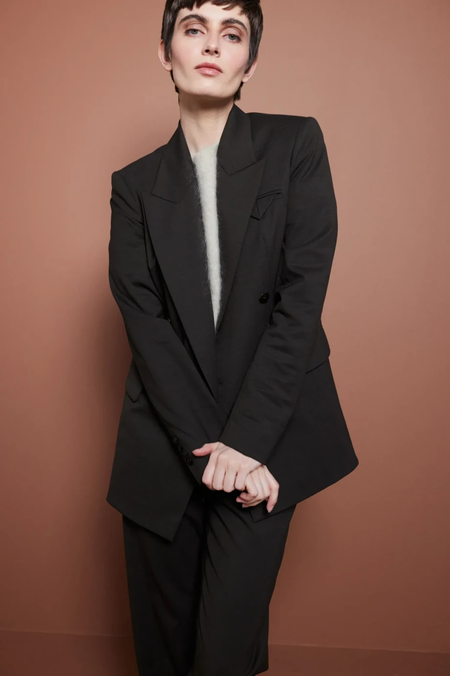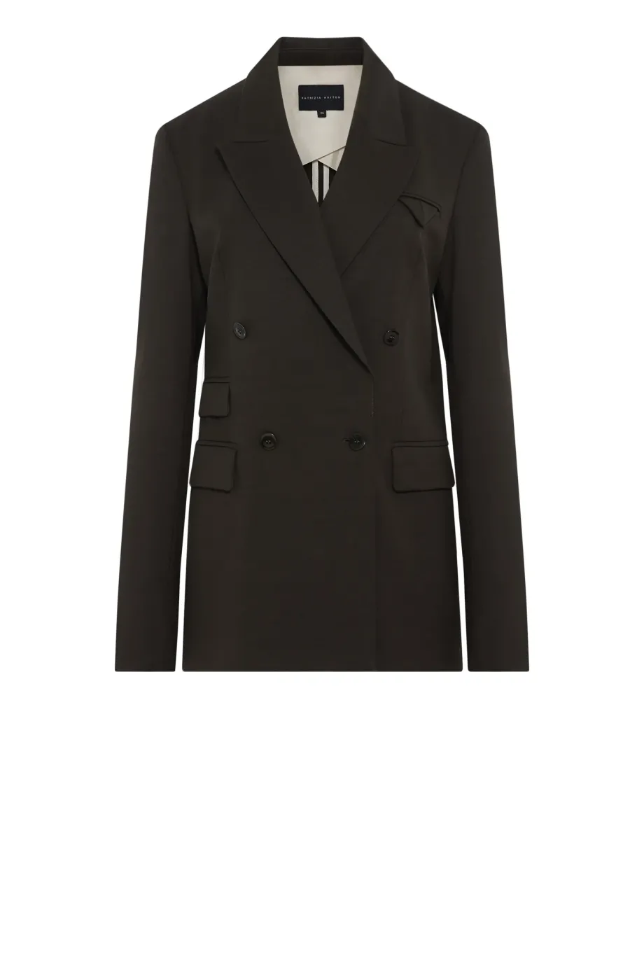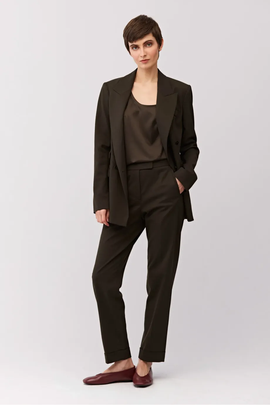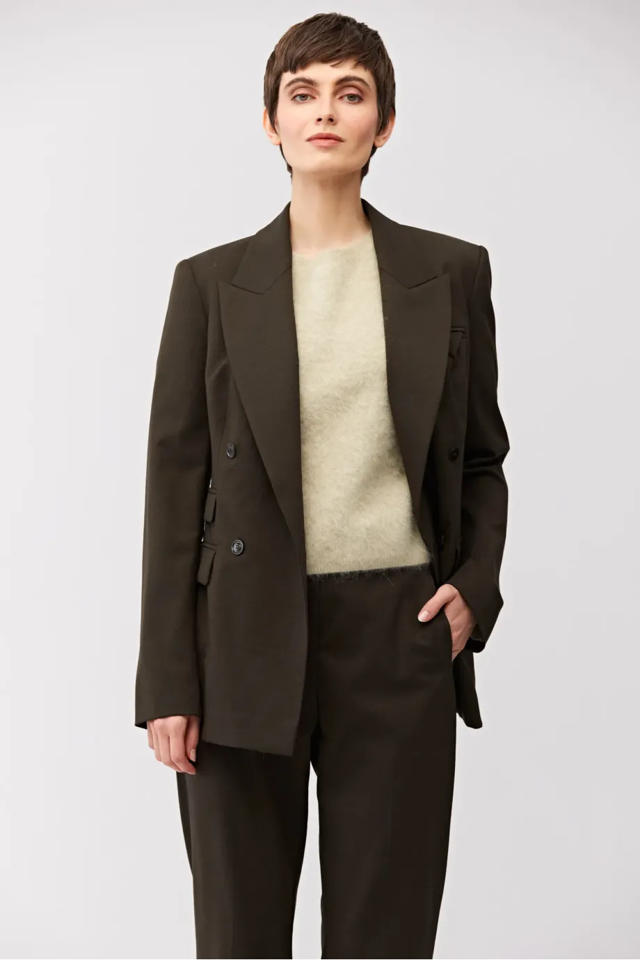 Sacou din lână pentru costum, cu două rânduri de nasturi. Închidere cu nasturi naturali. Guler, mânecă lungă. Cu căptușeală. Culoare verde militar. Pentru completarea setului sunt disponibili pantaloni.