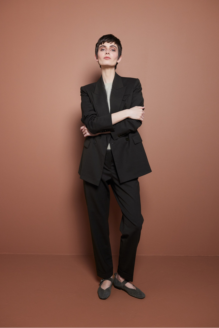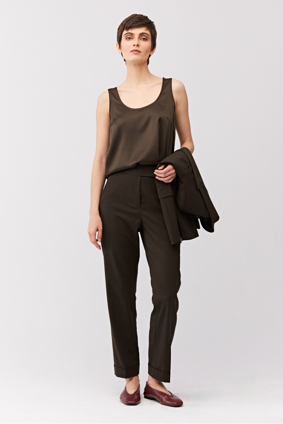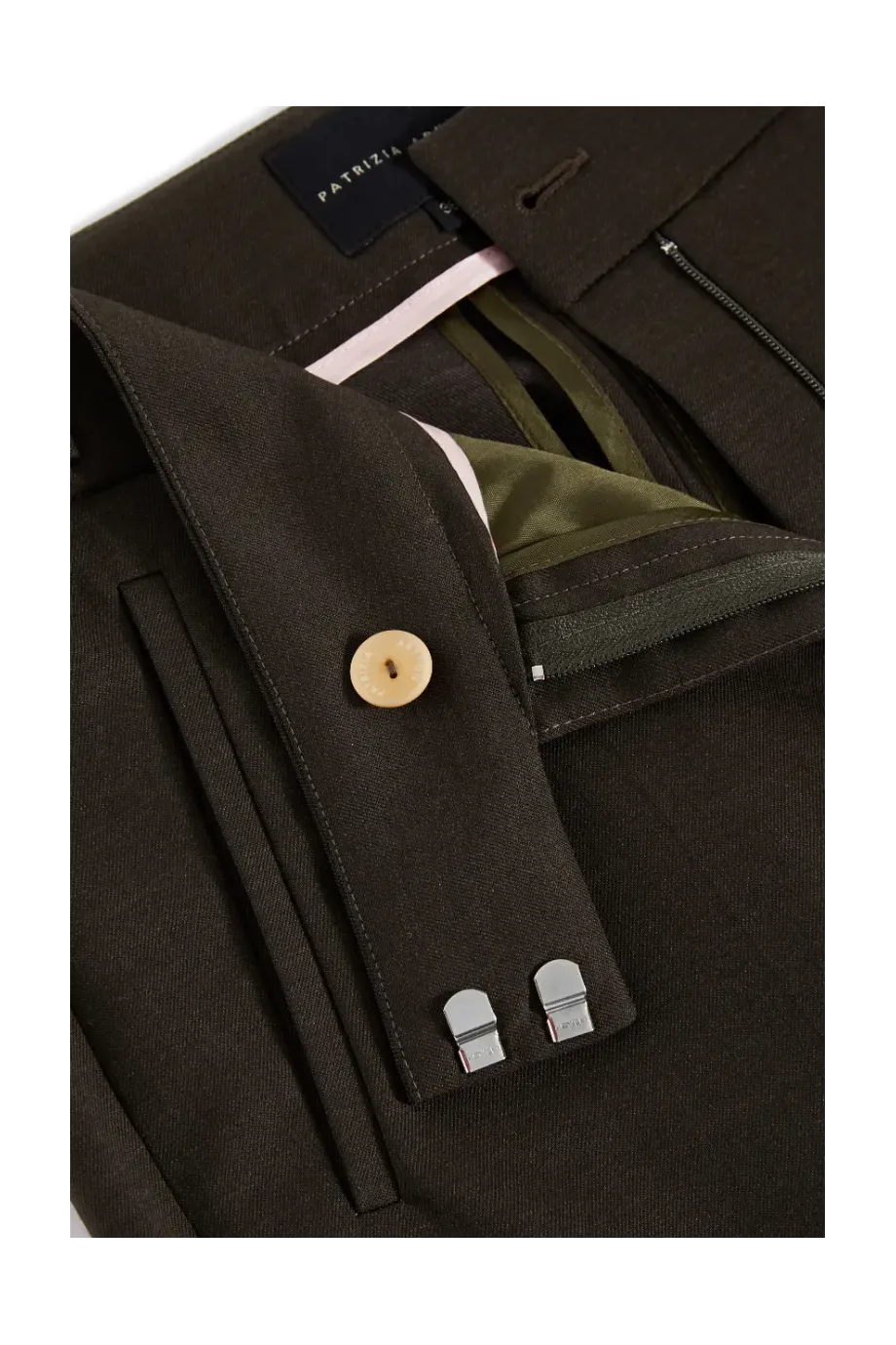 Pantaloni din lână pentru costum. Crac ușor conic, cu închidere cu fermoar, cârlig și nasture corozo la interior. Interior cu bandă decorativă. Buzunare. Culoare verde militar. Pentru completarea setului este disponibil sacoul din aceeași țesătură.