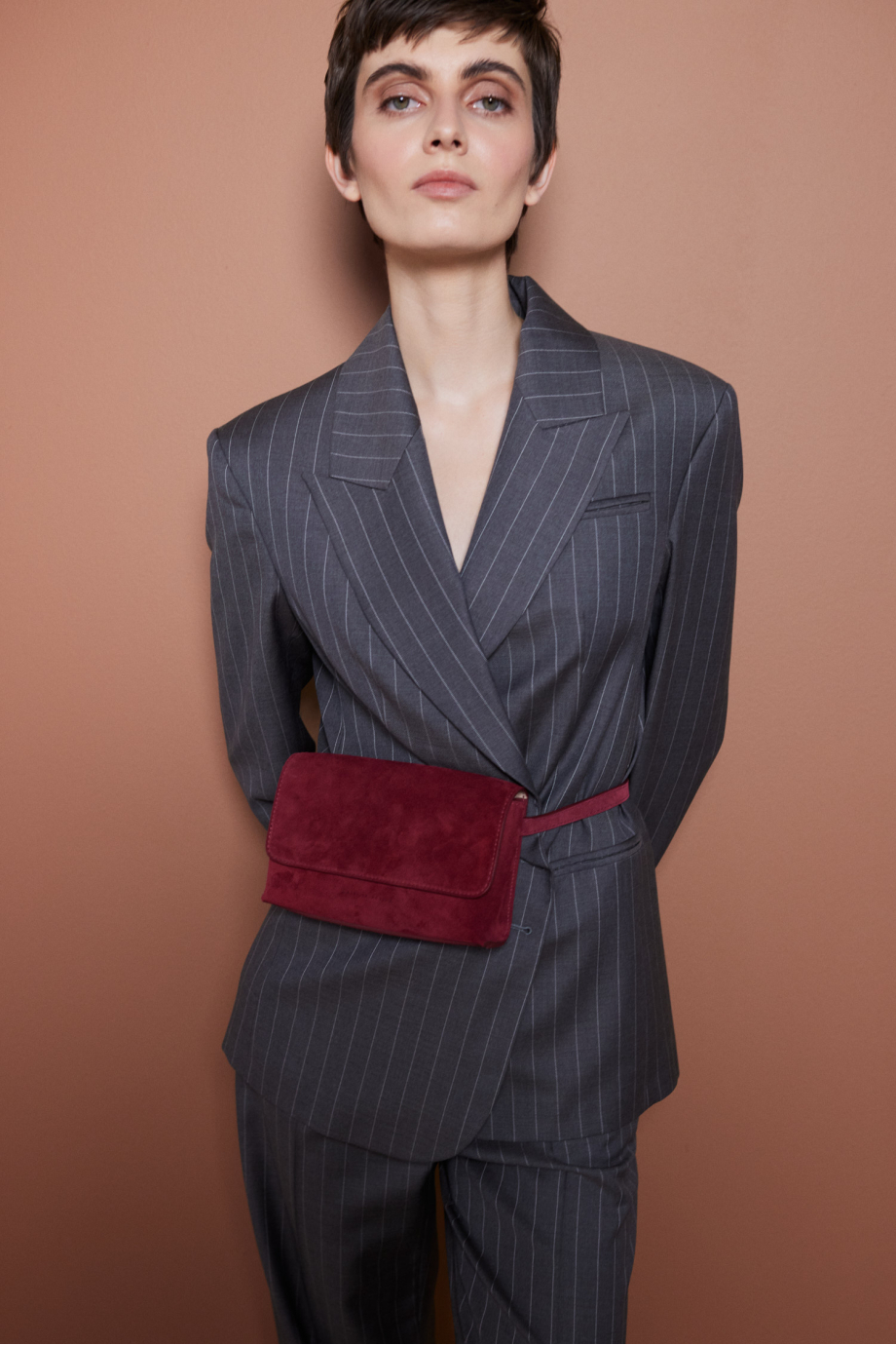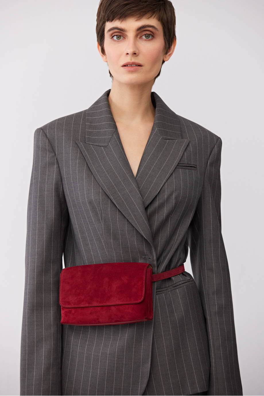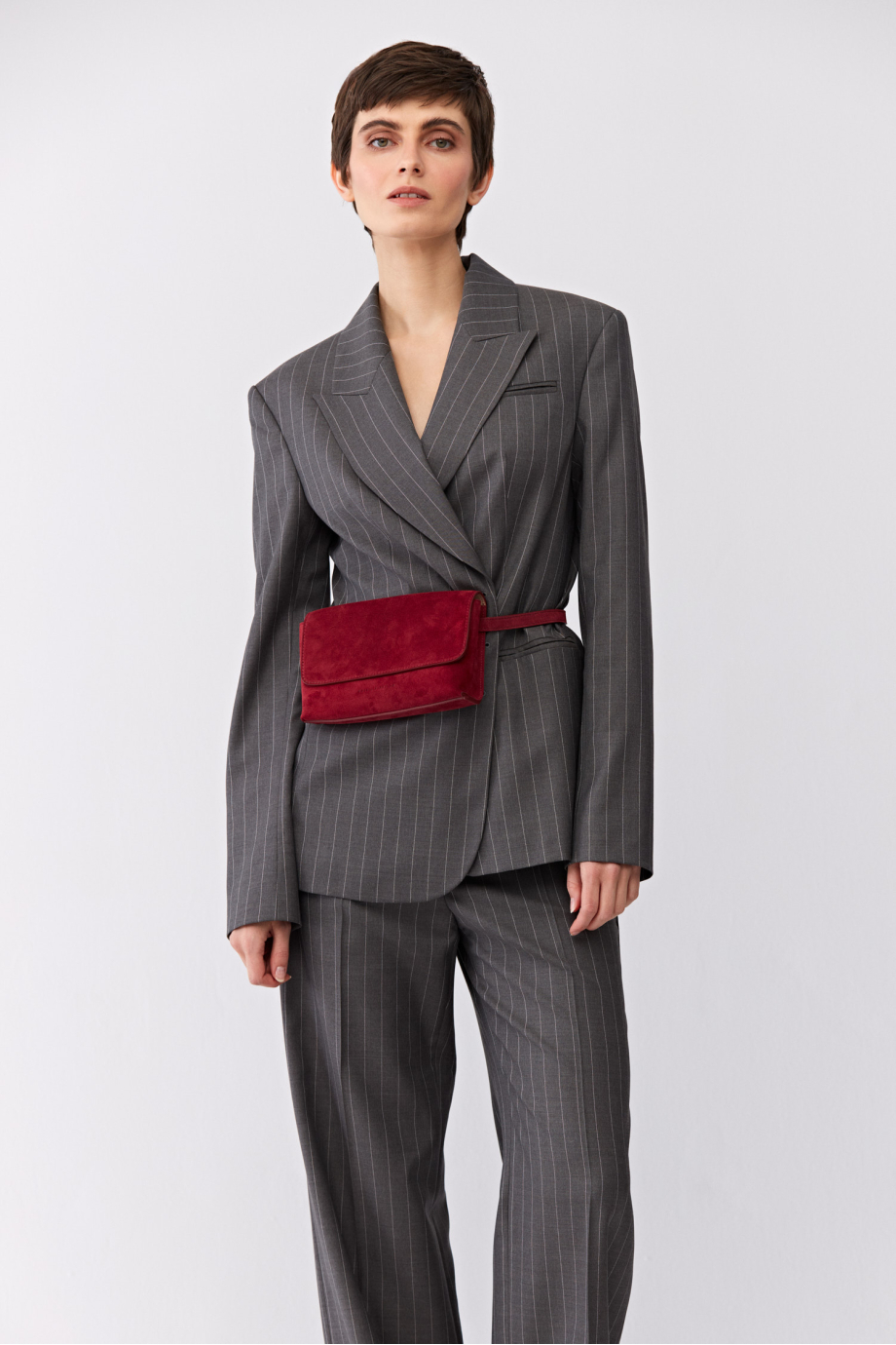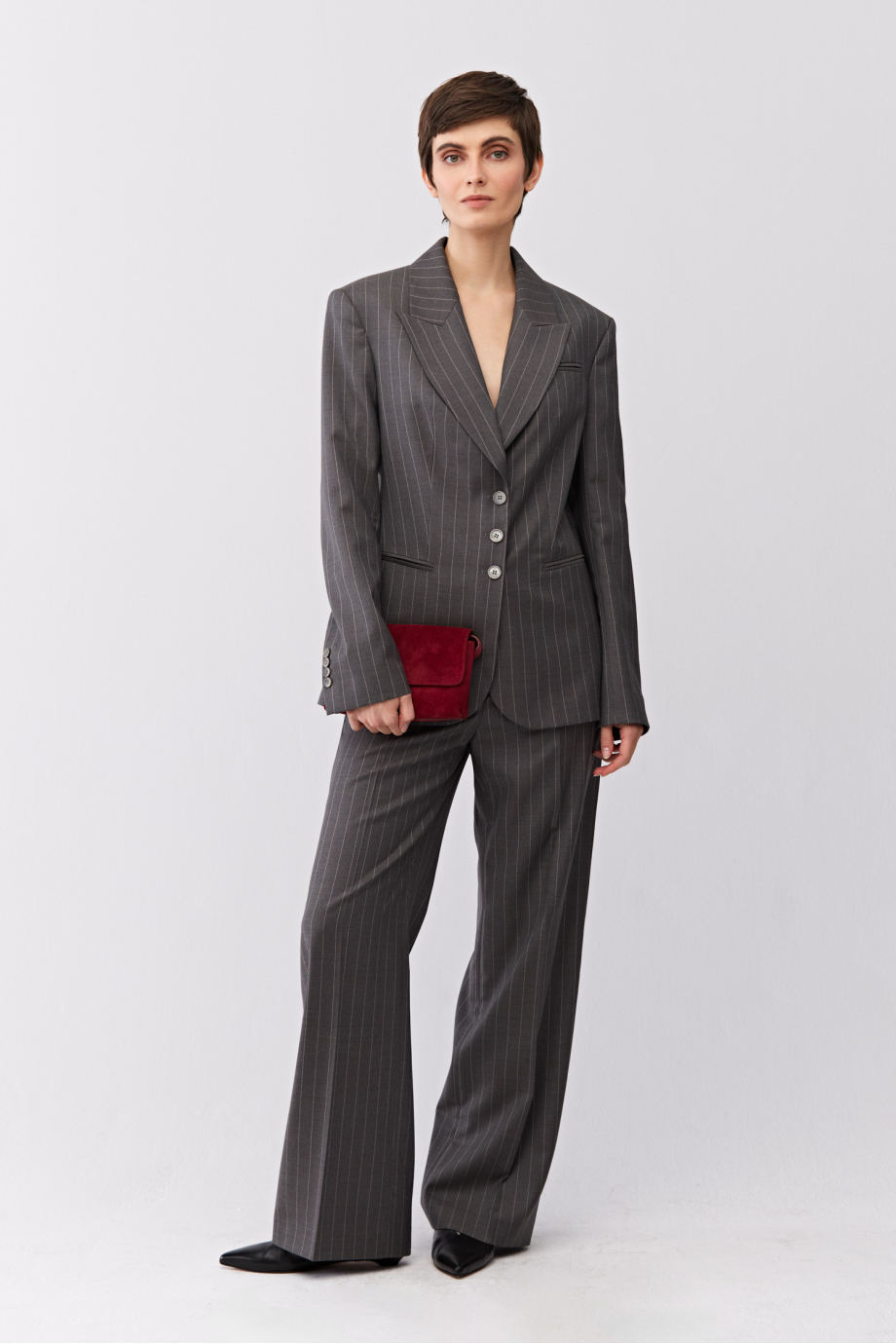 Sacou din lână virgină, cu dungi. Croială lejeră, mânecă lungă. Închidere cu nasturi naturali. Pentru completarea setului sunt disponibili pantaloni din aceeași țesătură.