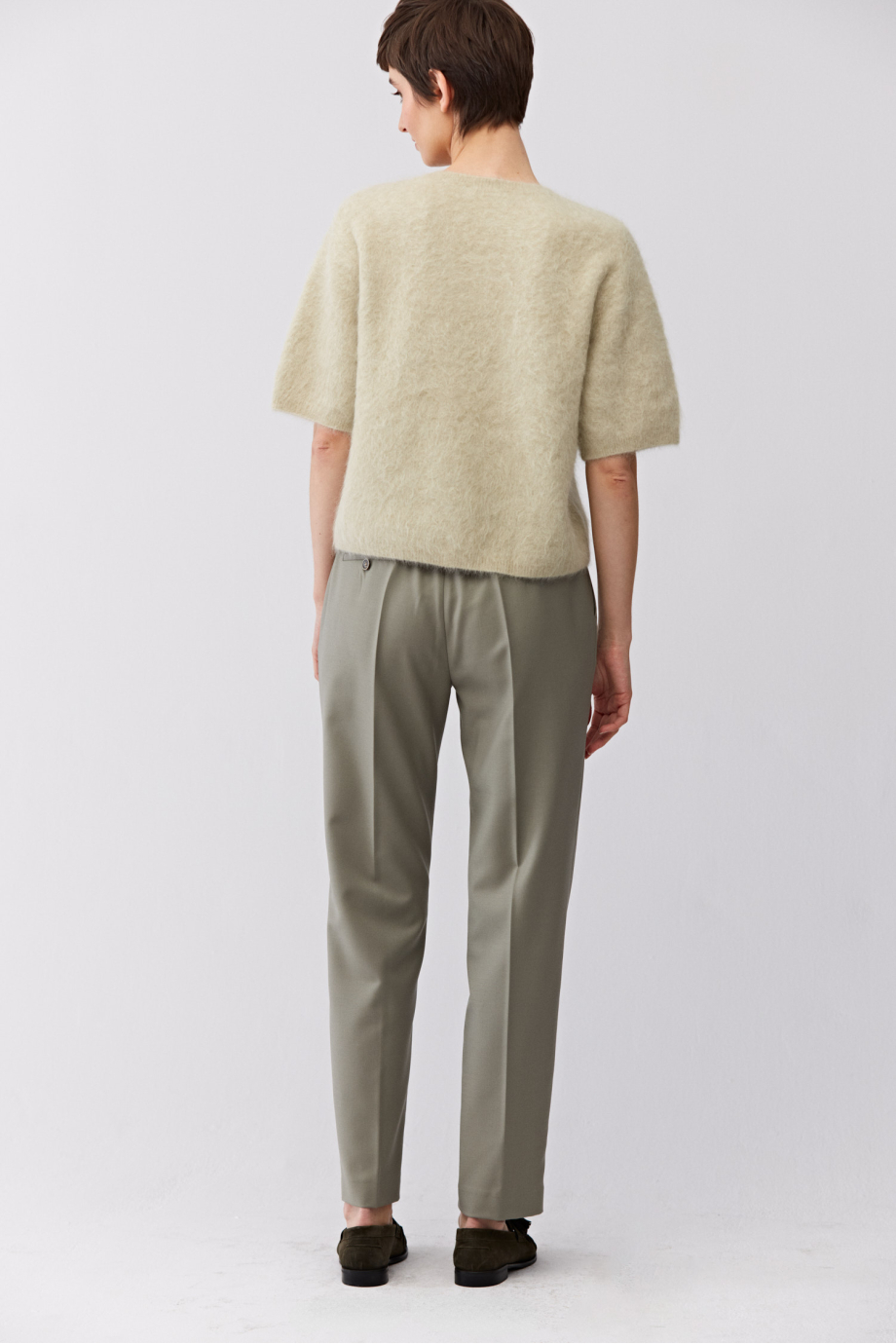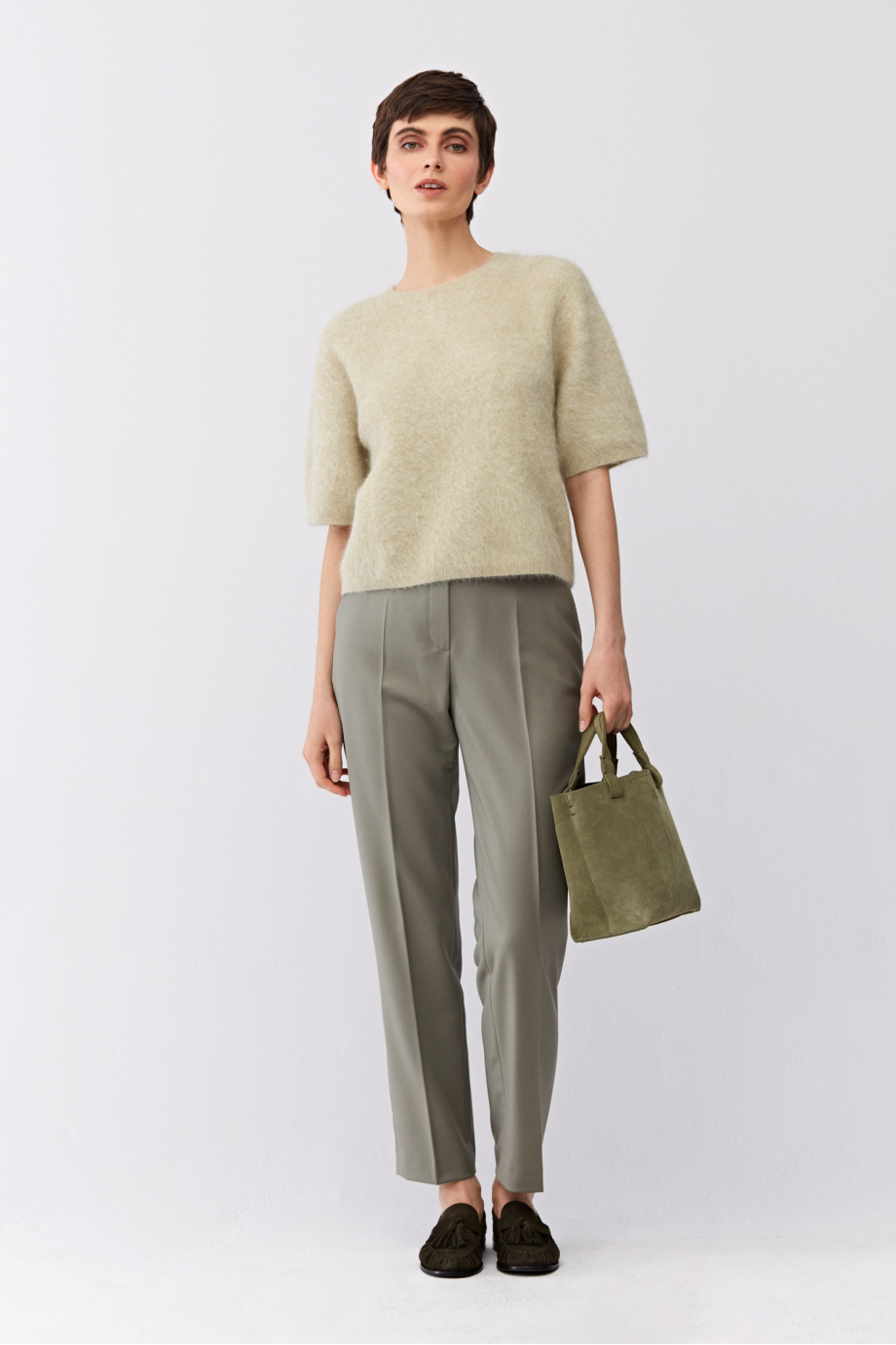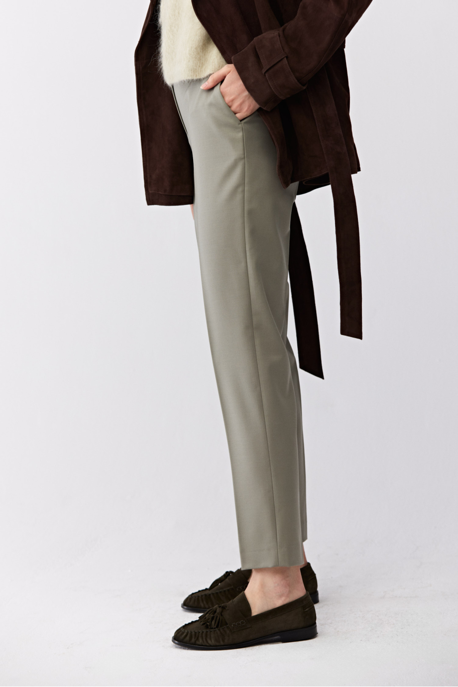 Pantaloni din lână cu crac ușor conic. Buzunare. Închidere cu fermoar, cârlig și nasture corozo la interior. Interior cu bandă decorativă. Culoare verde salvie.