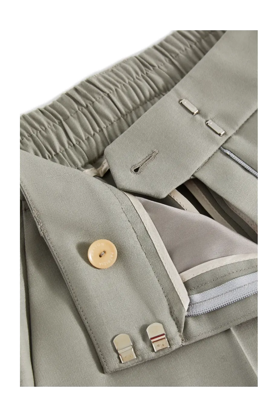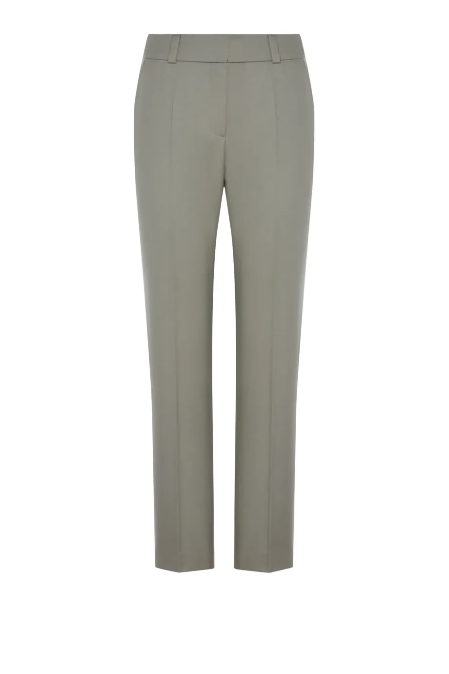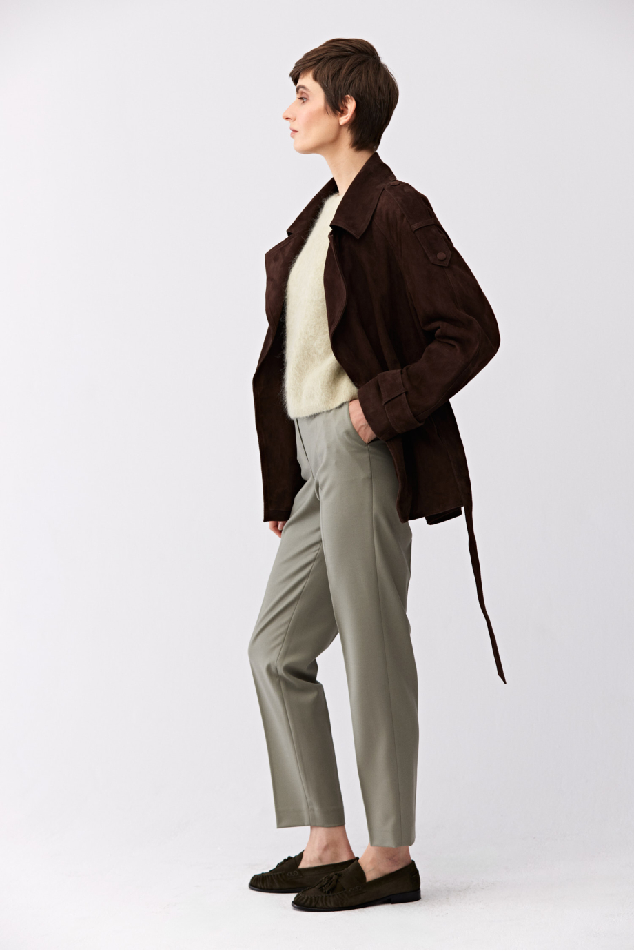 Pantaloni din lână cu crac ușor conic. Buzunare. Închidere cu fermoar, cârlig și nasture corozo la interior. Interior cu bandă decorativă. Culoare verde salvie.