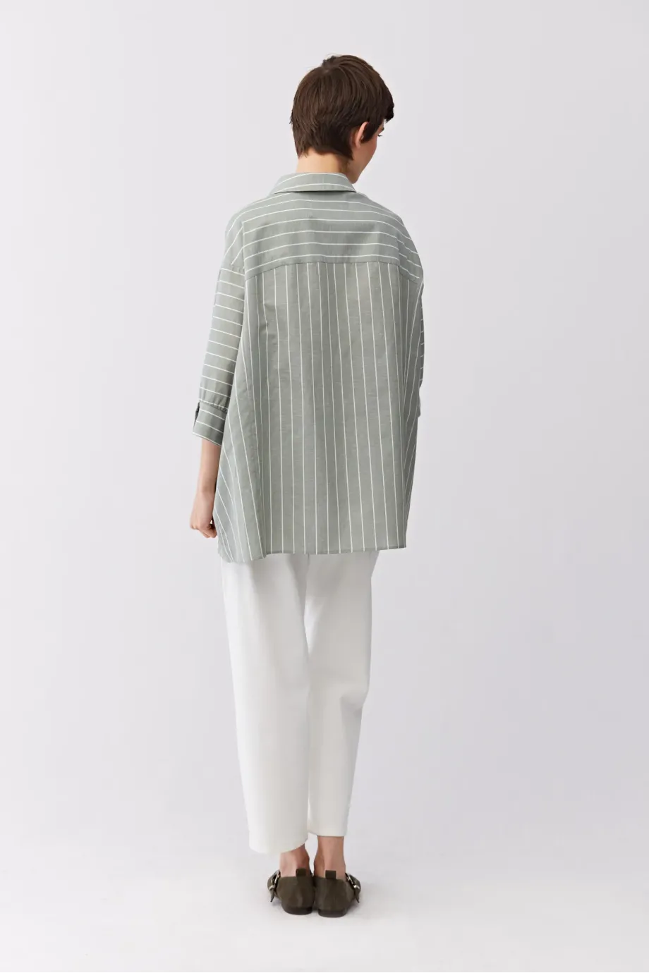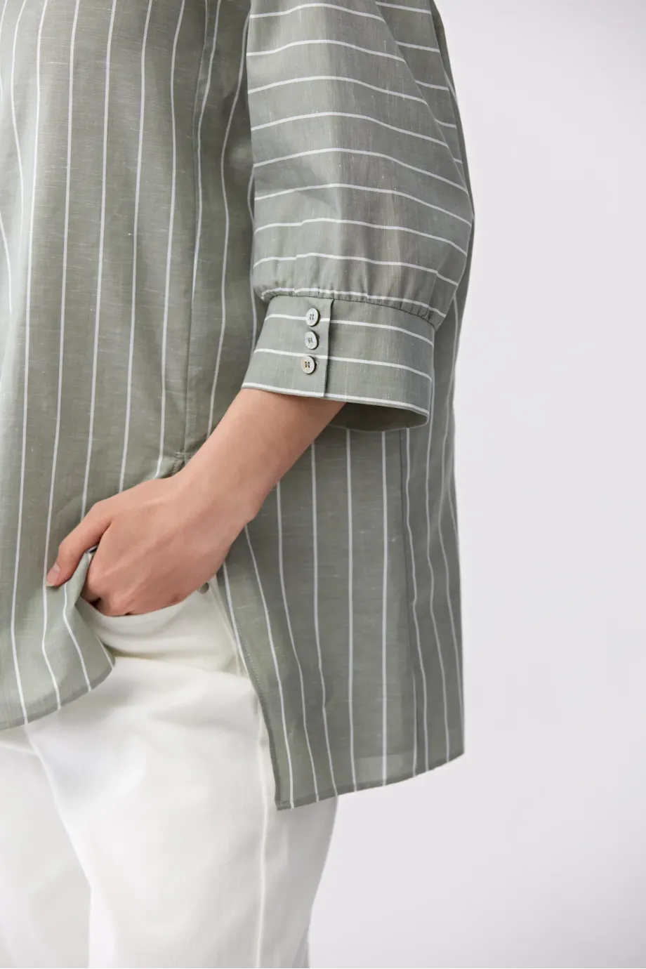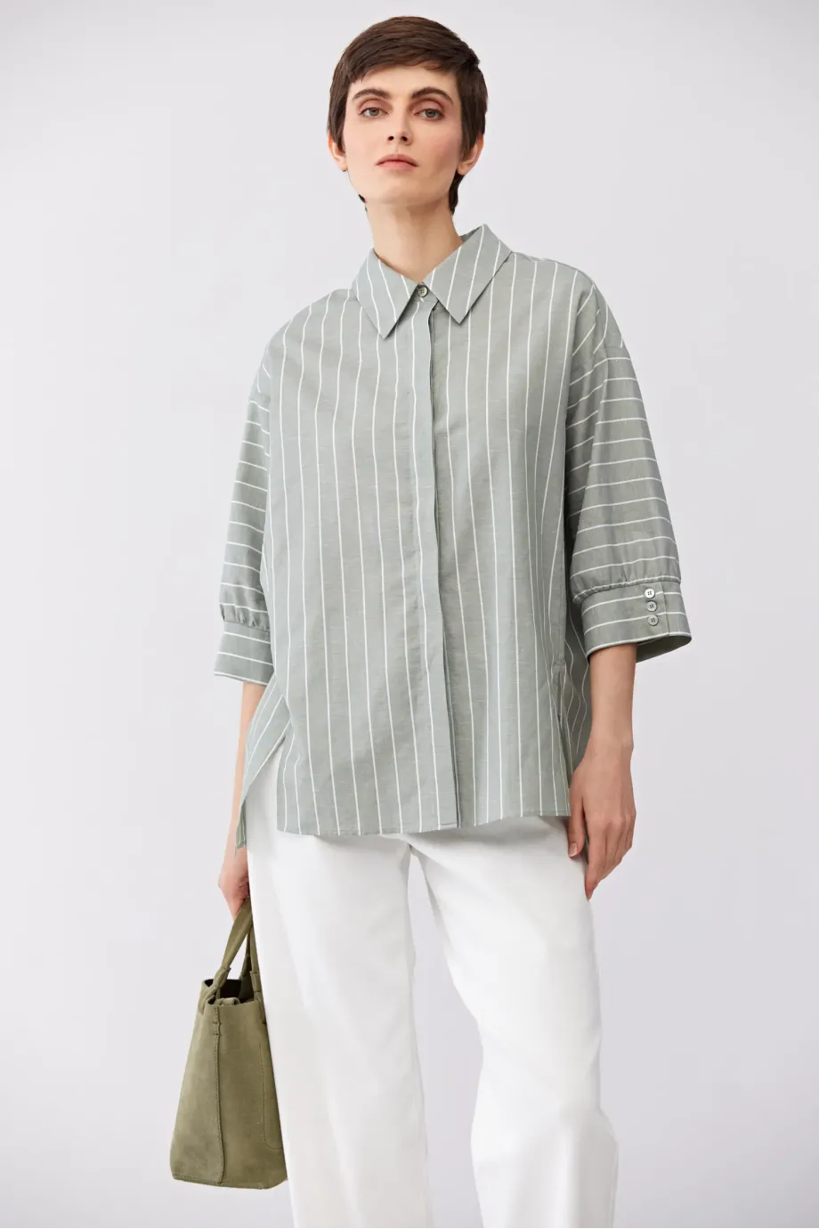 Cămașă lejeră din amestec de bumbac și in. Croială dreaptă. Închidere cu nasturi. Guler. Mânecă 3/4. Culoare verde deschis.