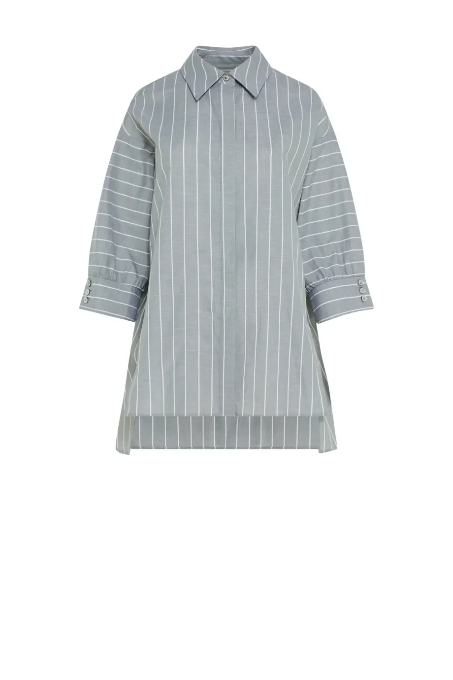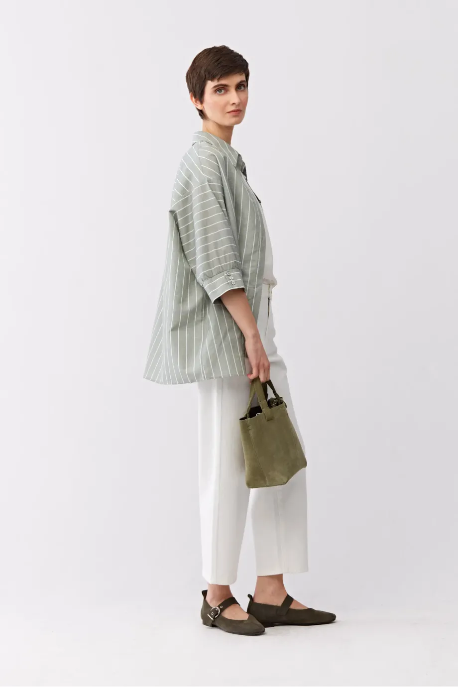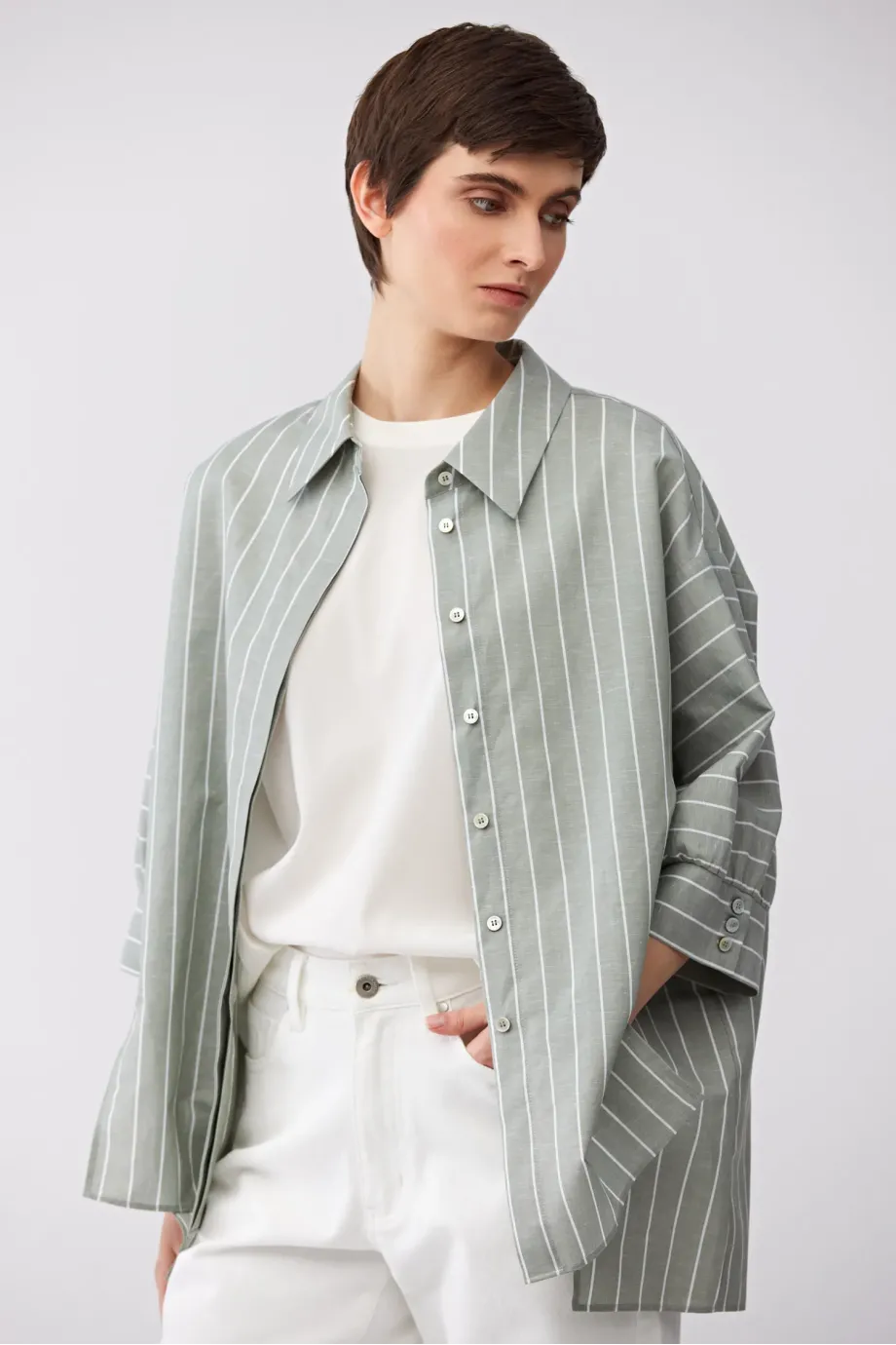 Cămașă lejeră din amestec de bumbac și in. Croială dreaptă. Închidere cu nasturi. Guler. Mânecă 3/4. Culoare verde deschis.