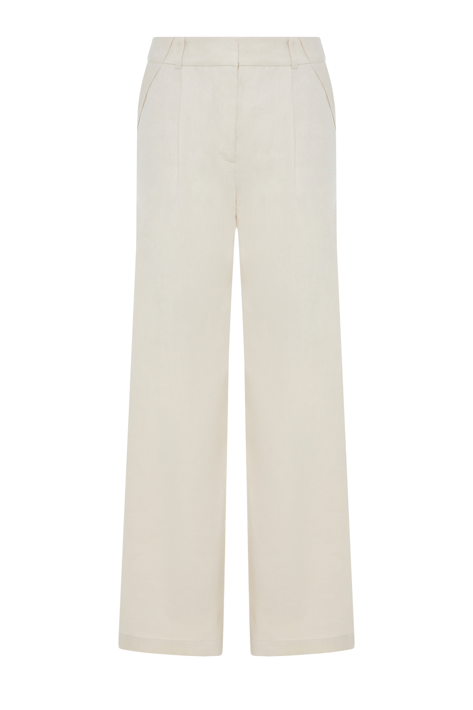 Pantaloni cu in. Picior larg, închidere cu fermoar, cârlig și nasture corozo pe interior. Interior cu paspoal decorativ. Buzunare și găici pentru curea. Culoare: bej.