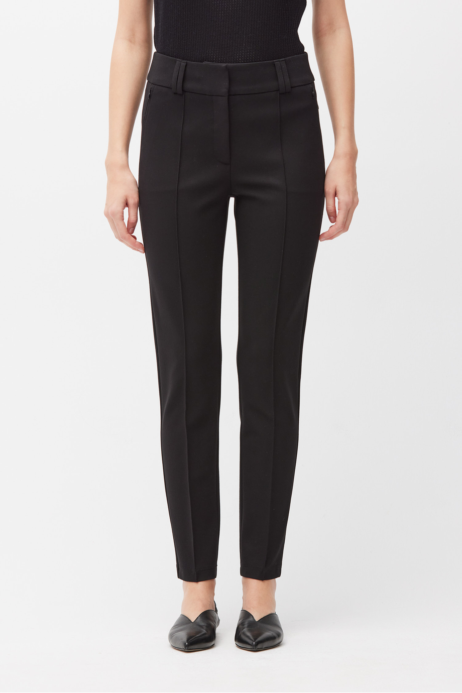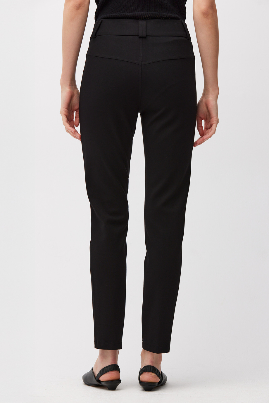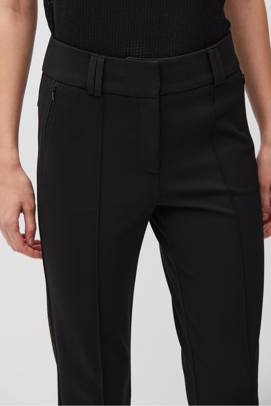 Pantaloni negri din tricot. Picior îngust. Închidere cu fermoar, cârlig și nasture corozo pe interior. Interior cu paspoal decorativ. Buzunare și găici pentru curea.