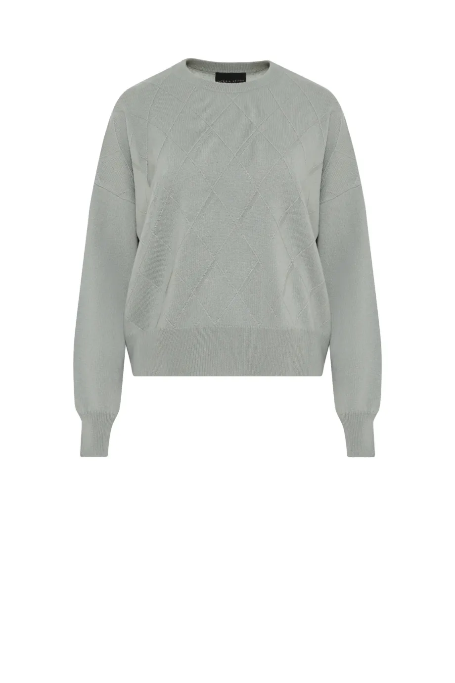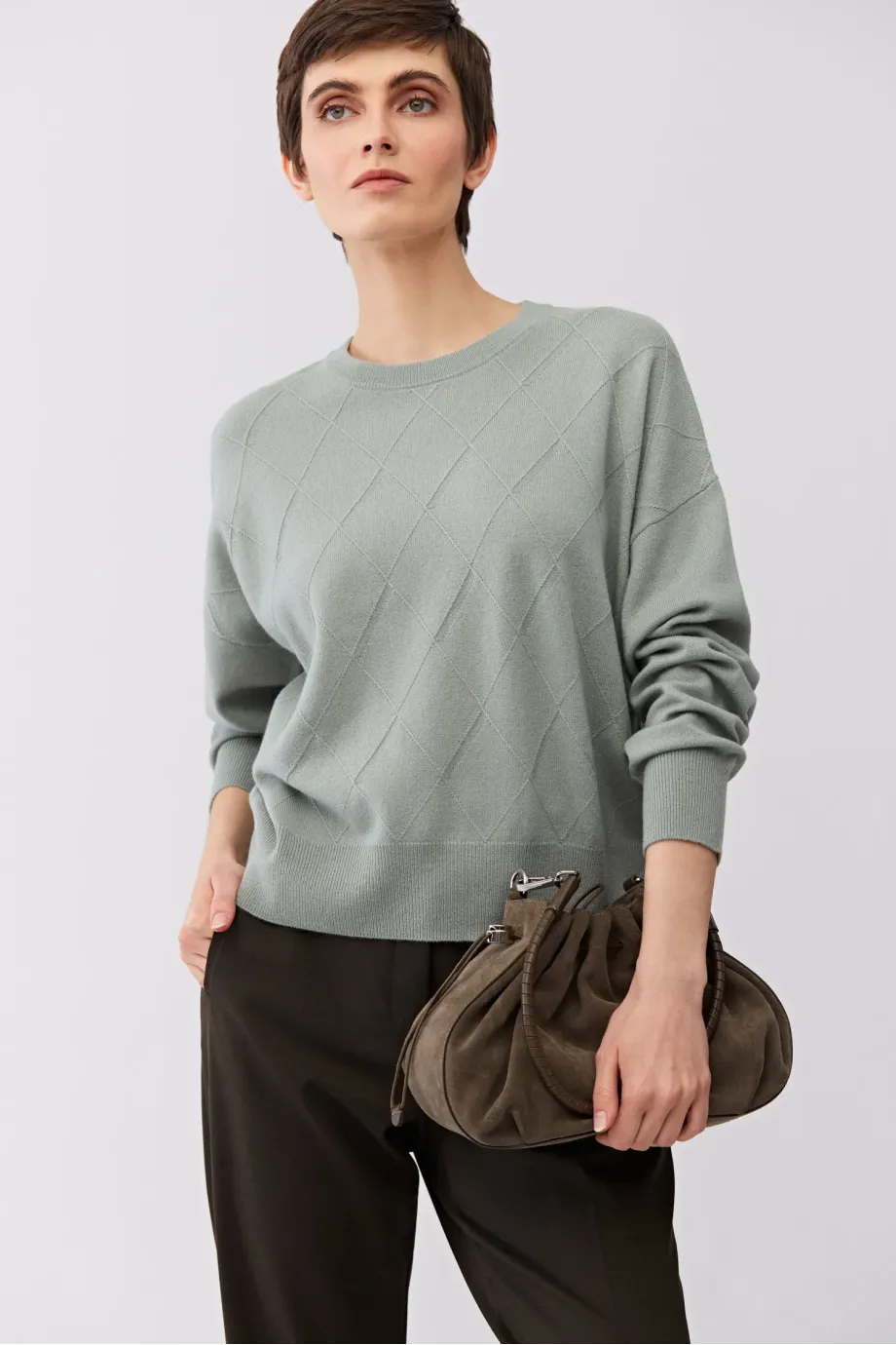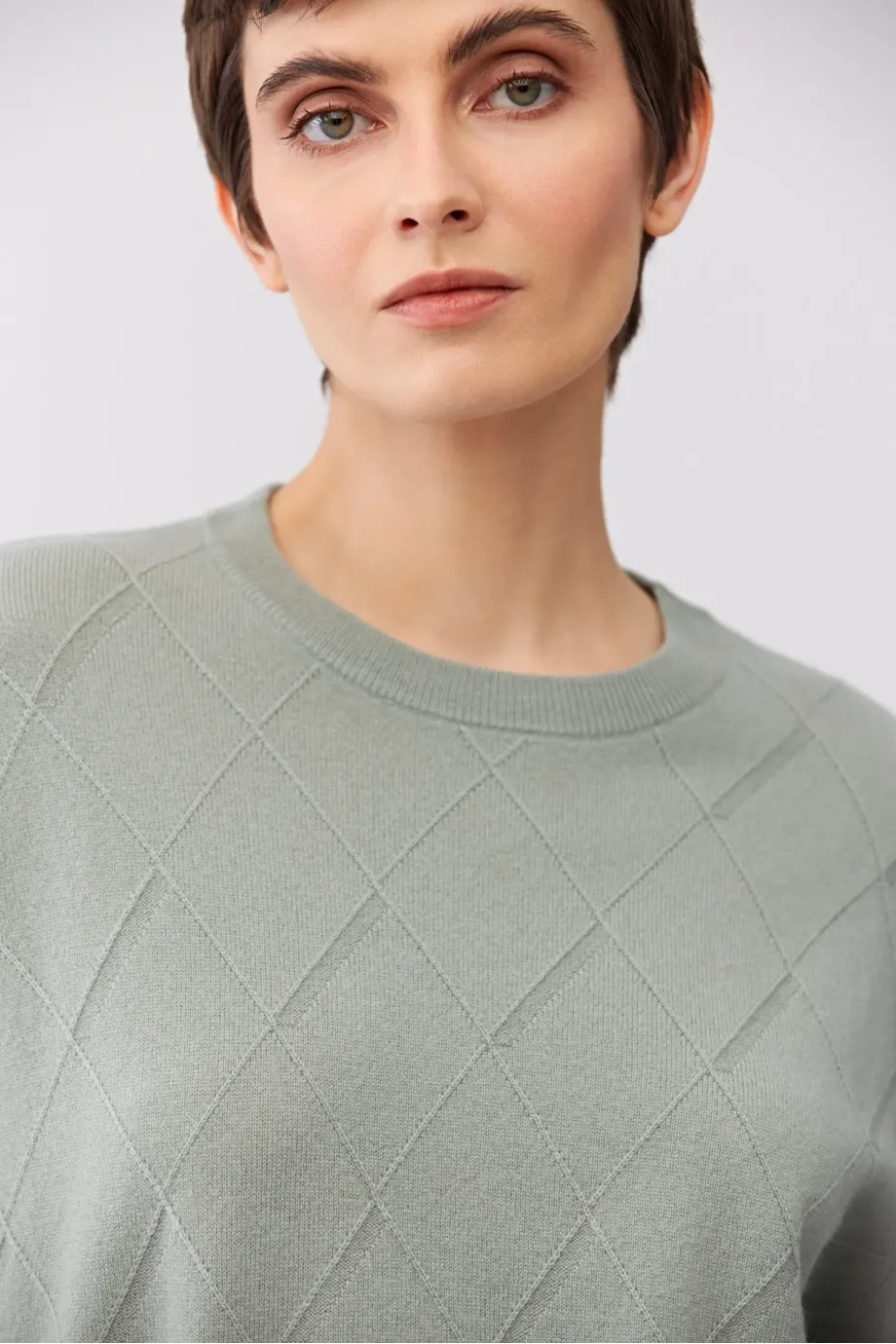 Bluză din lână merinos și cașmir. Croială scurtă. Mâneci lungi. Tricot moale cu legătură single jersey, realizat pe mașină cu finețea 12 GG. Culoare verde deschis.