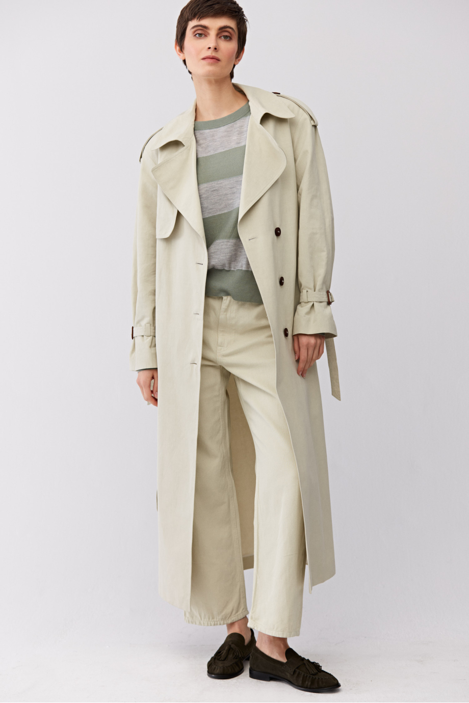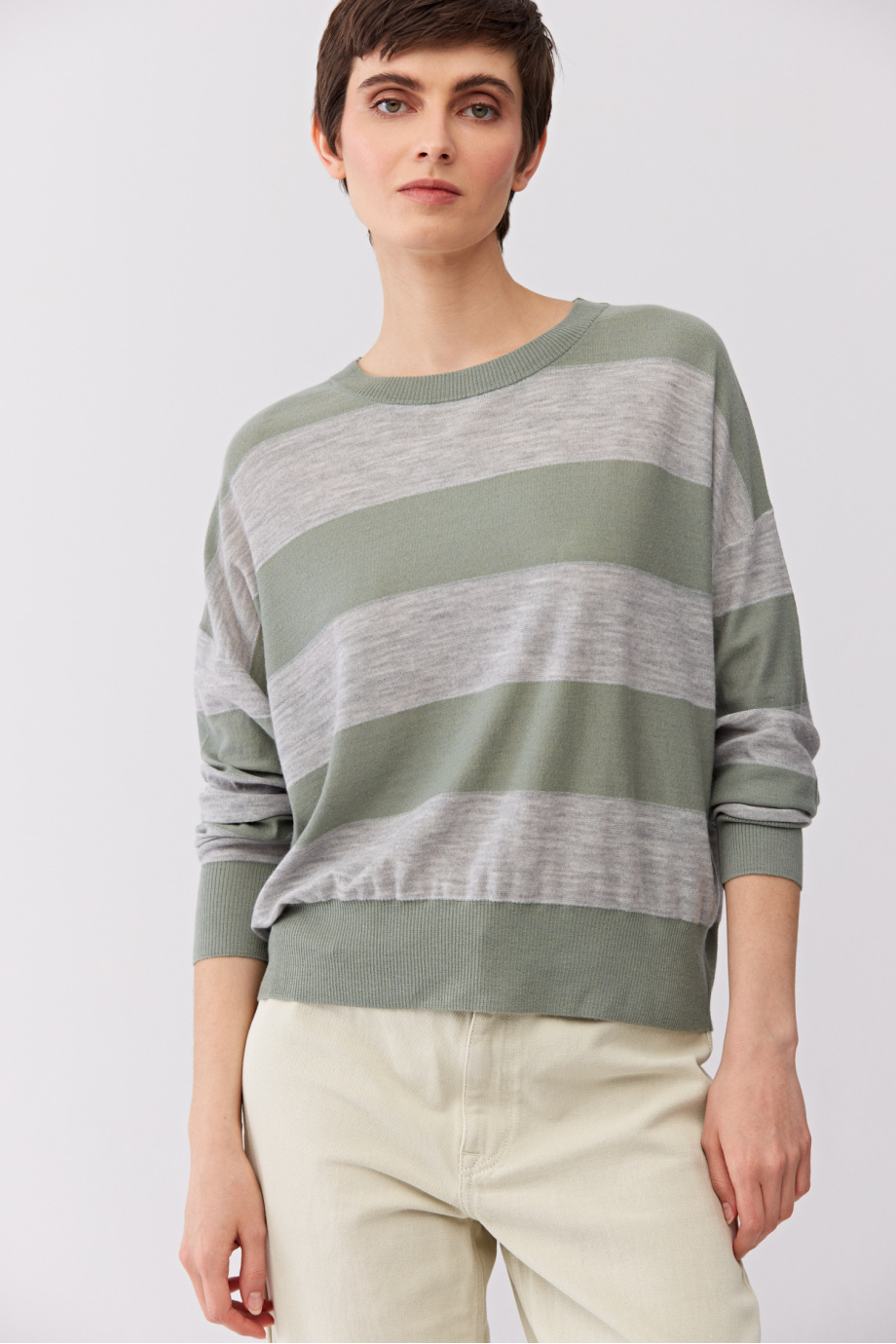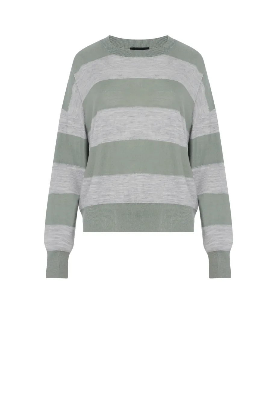 Bluză în dungi cu cașmir și mătase. Tricot moale cu legătură single jersey, realizat pe mașină cu finețea 18 GG. Decolteu rotund, mâneci lungi. Croială lejeră. Culori: gri, verde deschis, fir argintiu.