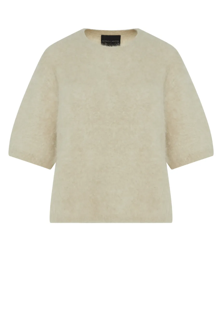Pulover cu lână de alpaca, cu fir lung. Tricot realizat în legătură single jersey, produs pe o mașină cu finețea de 7 GG. Mânecă scurtă. Croială lejeră, cu formă boxy. Culoare: verde deschis.