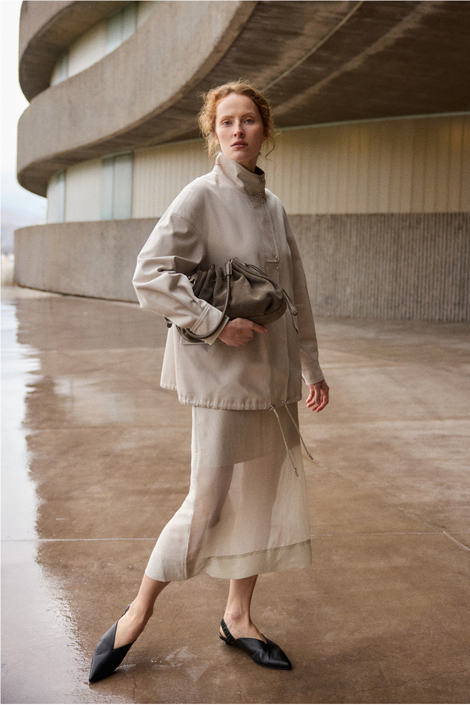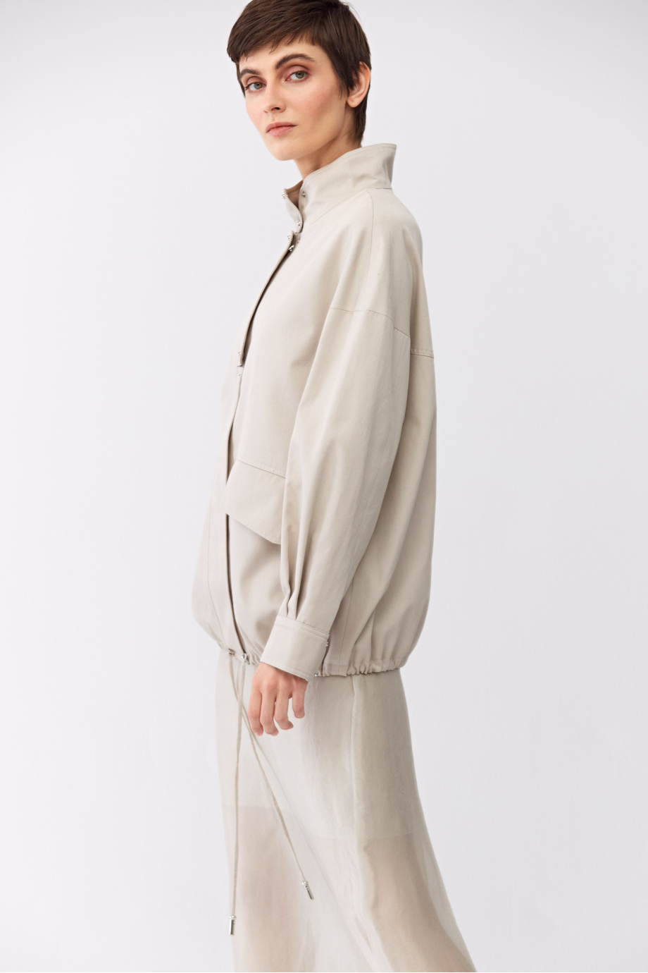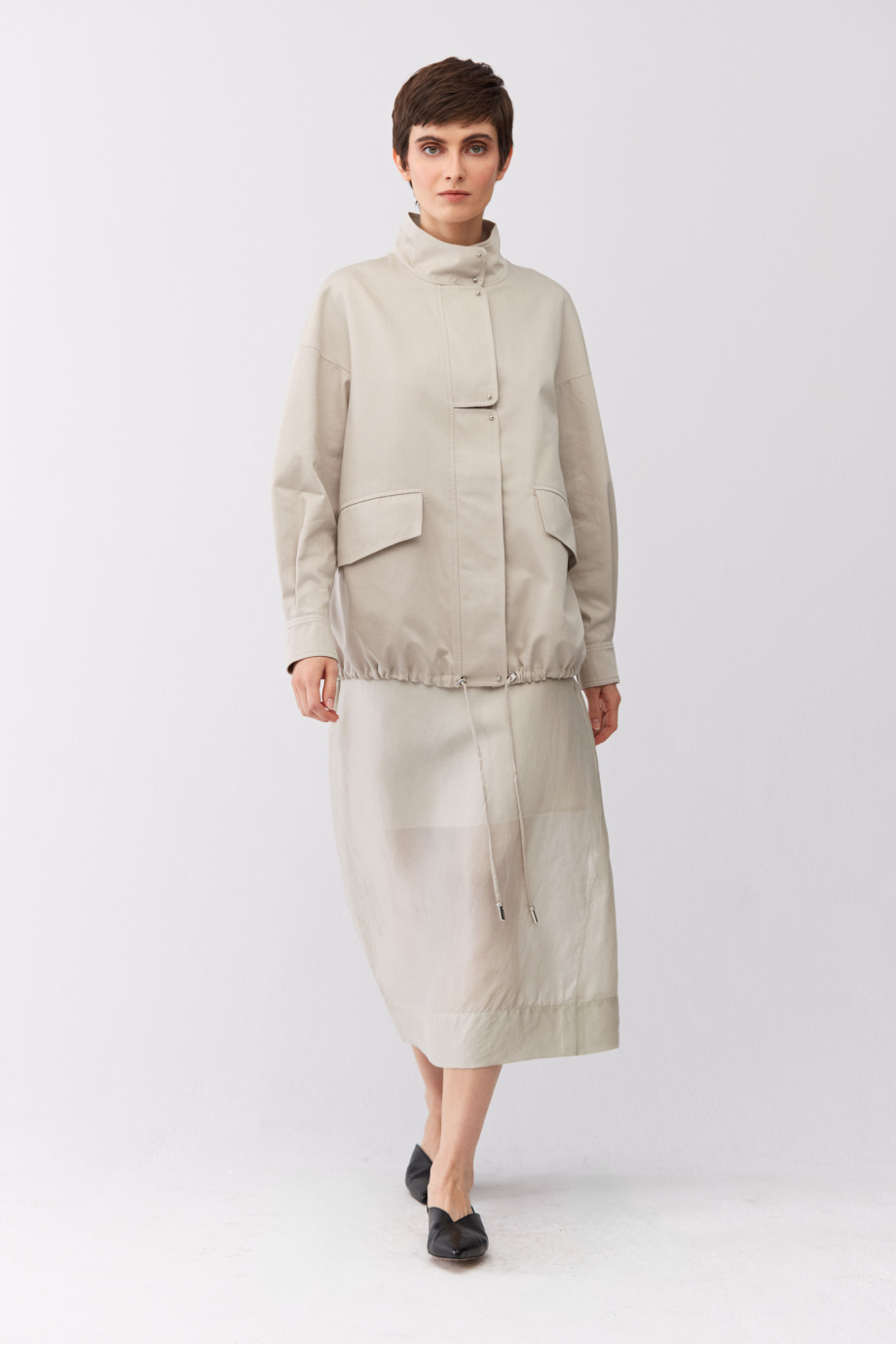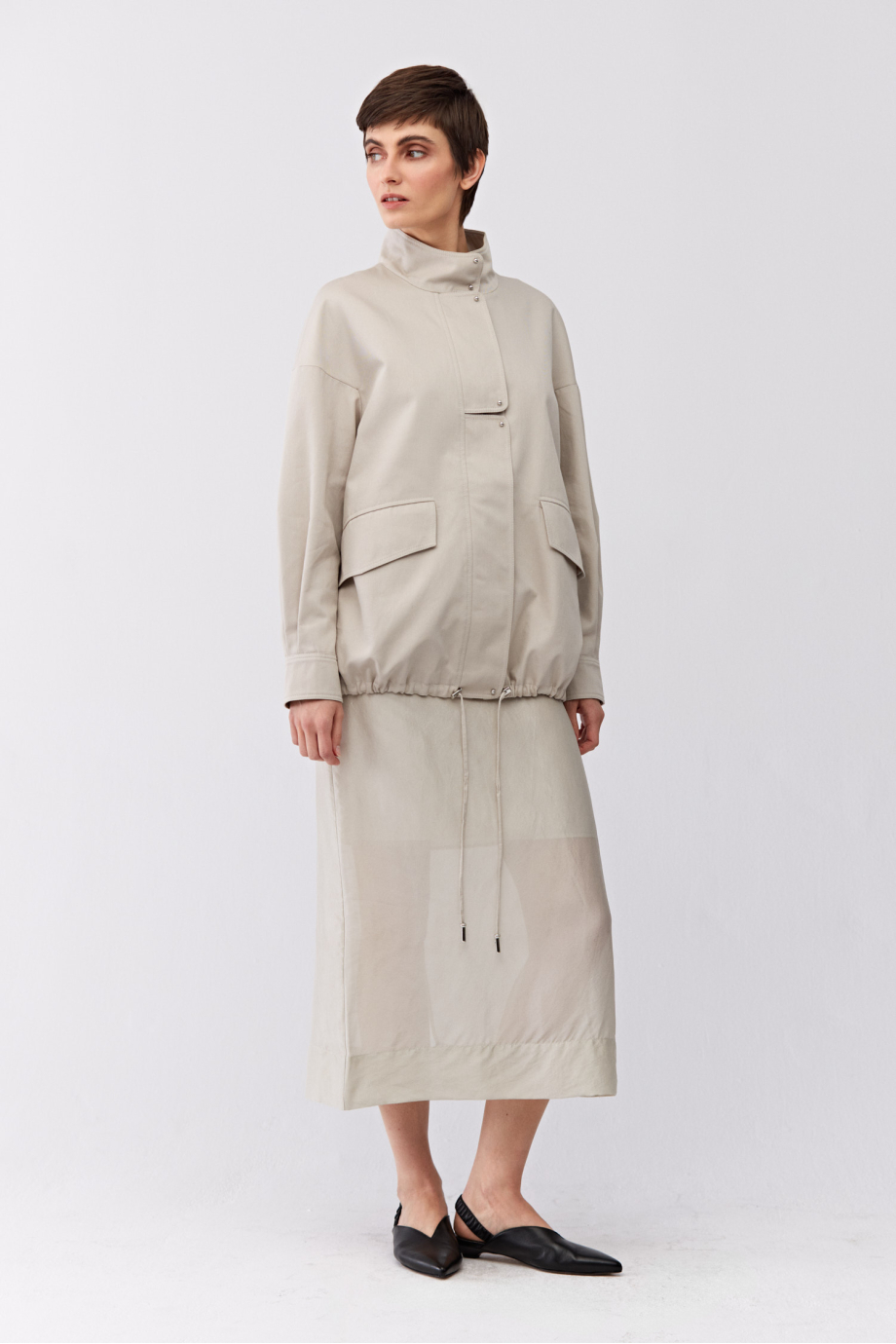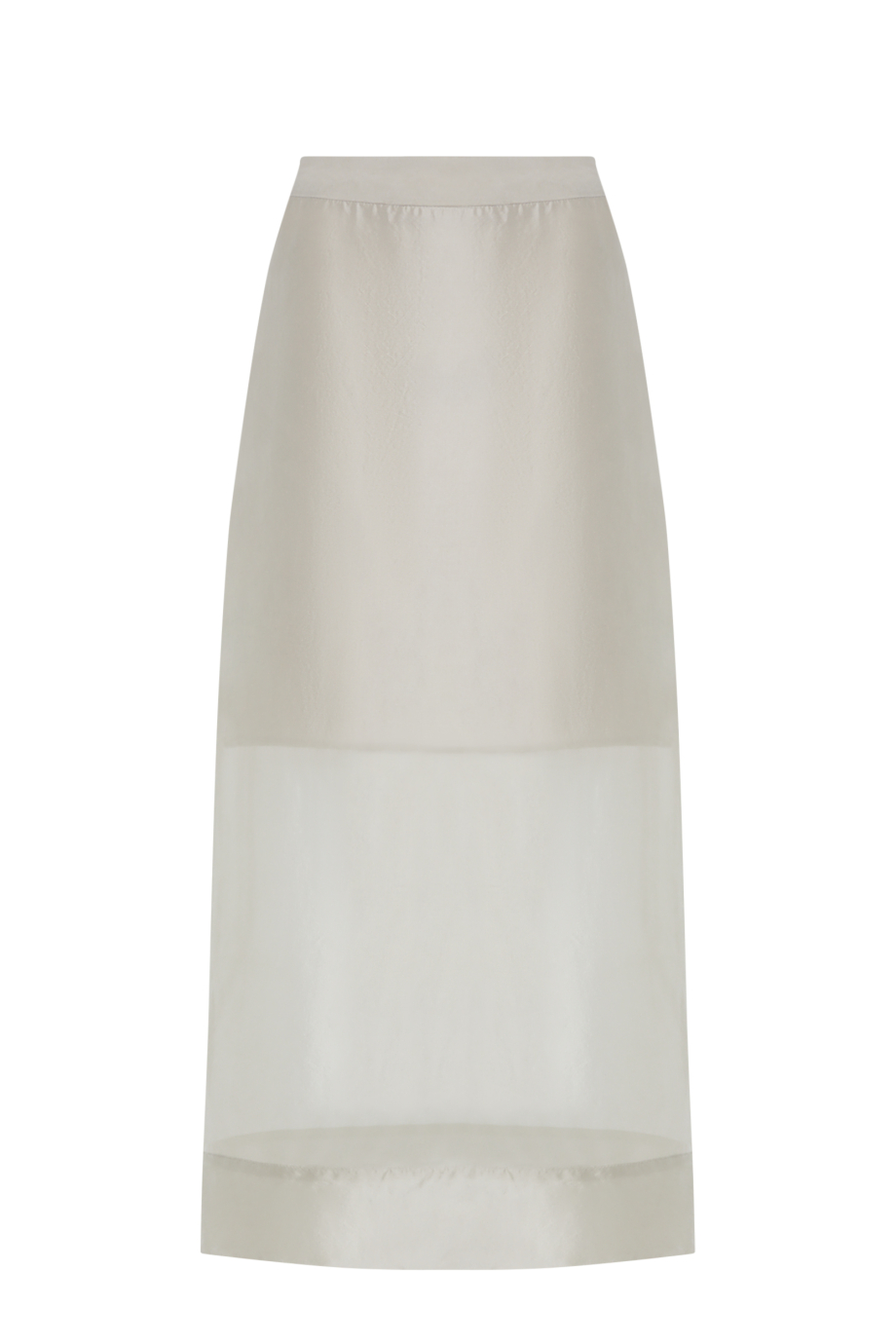 Fustă transparentă cu adaos de mătase. Confecționată din țesătură vopsită manual, cu nuanță variată. Cu căptușeală. Închidere cu fermoar și nasture. Lungime midi. Culoare bej.