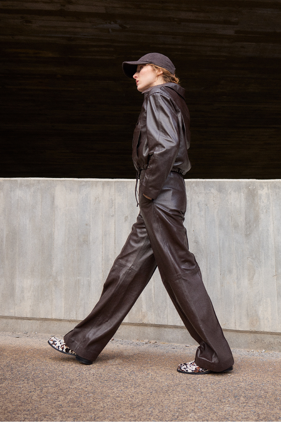 Pantaloni maro din piele cu crac larg