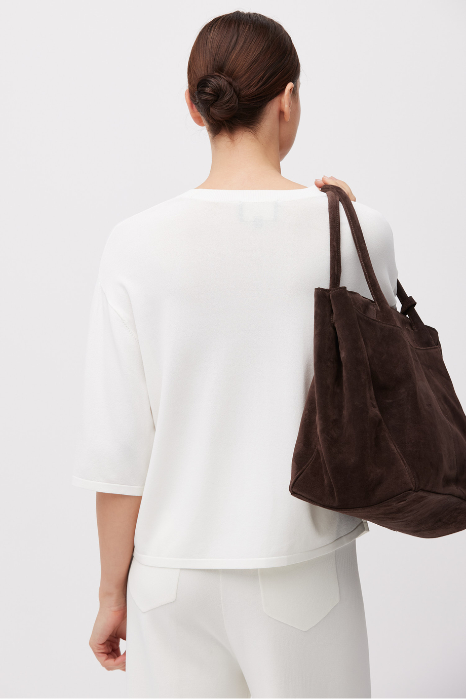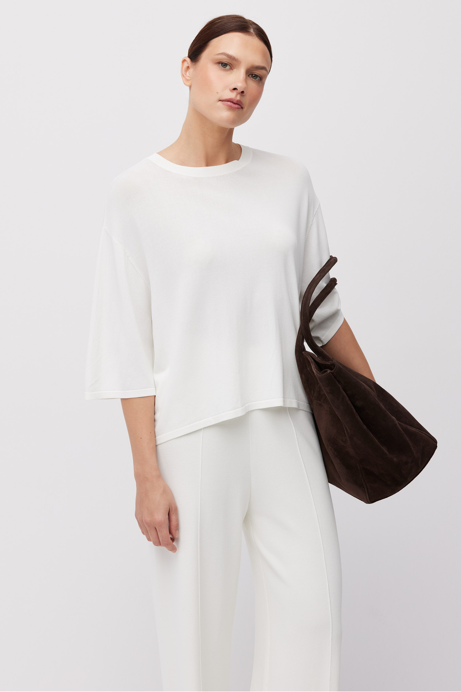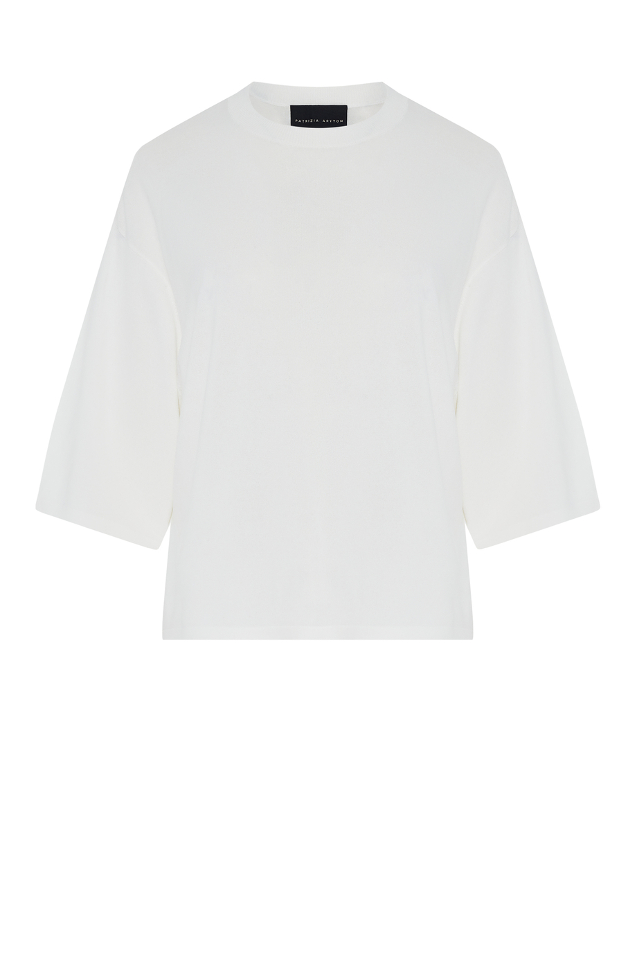 Bluză albă cu mânecă scurtă. Decolteu rotund. Tricot moale, cu structură fină single jersey, realizat pe mașină de tricotat 16 GG. Croială simplă, lejeră. Pentru completarea setului sunt disponibili pantaloni din același tricot.