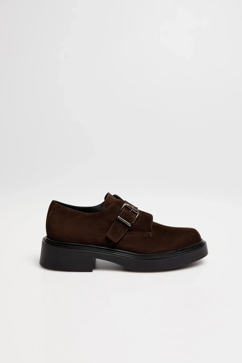 Pantofi monk maro din piele întoarsă moale de capră și oaie, cusuți manual în Italia. Croială clasică cu cataramă și vârf rotund, pe talpă masivă.