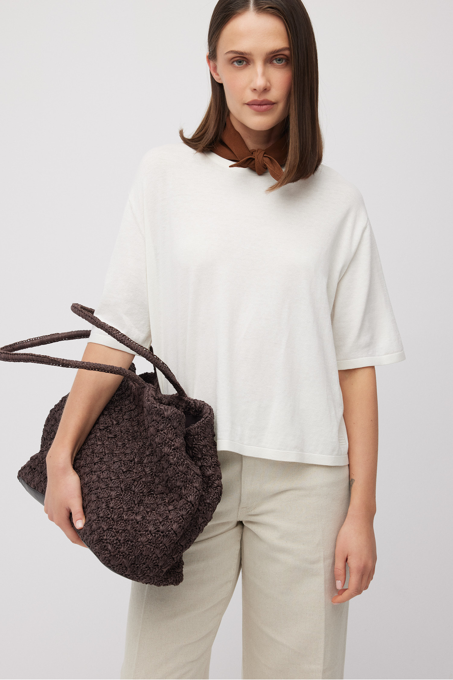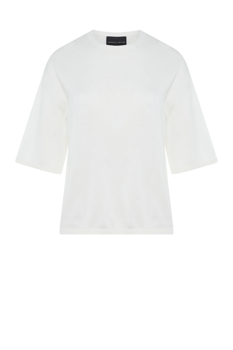 Bluză din amestec de bumbac și mătase. Decolteu rotund, mânecă scurtă. Croială lejeră, boxy. Jerseu moale cu structură fină single jersey, realizat pe mașină cu finețe 18 GG. Culoare: alb.