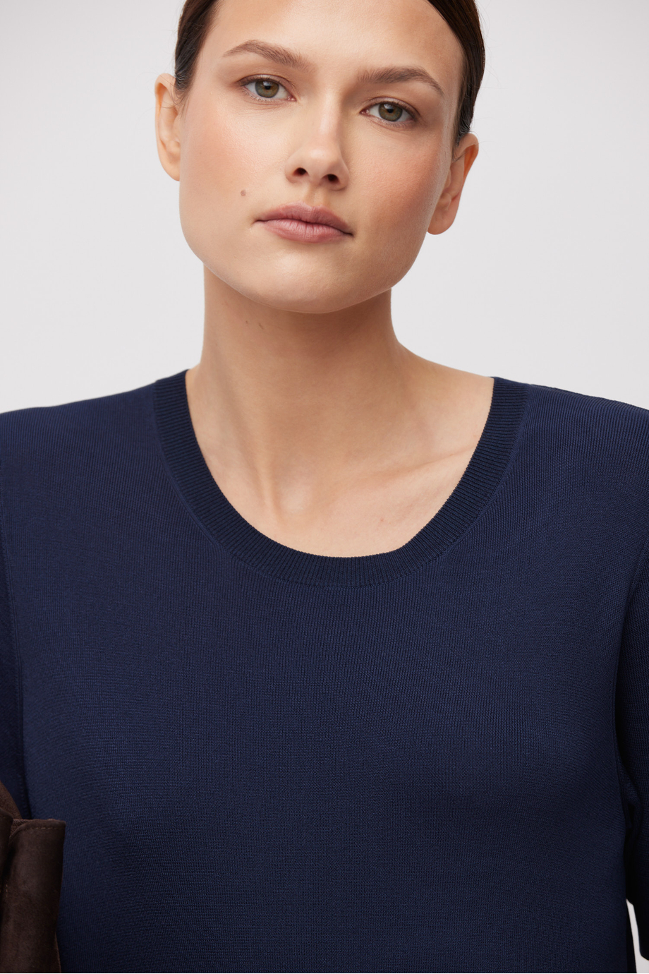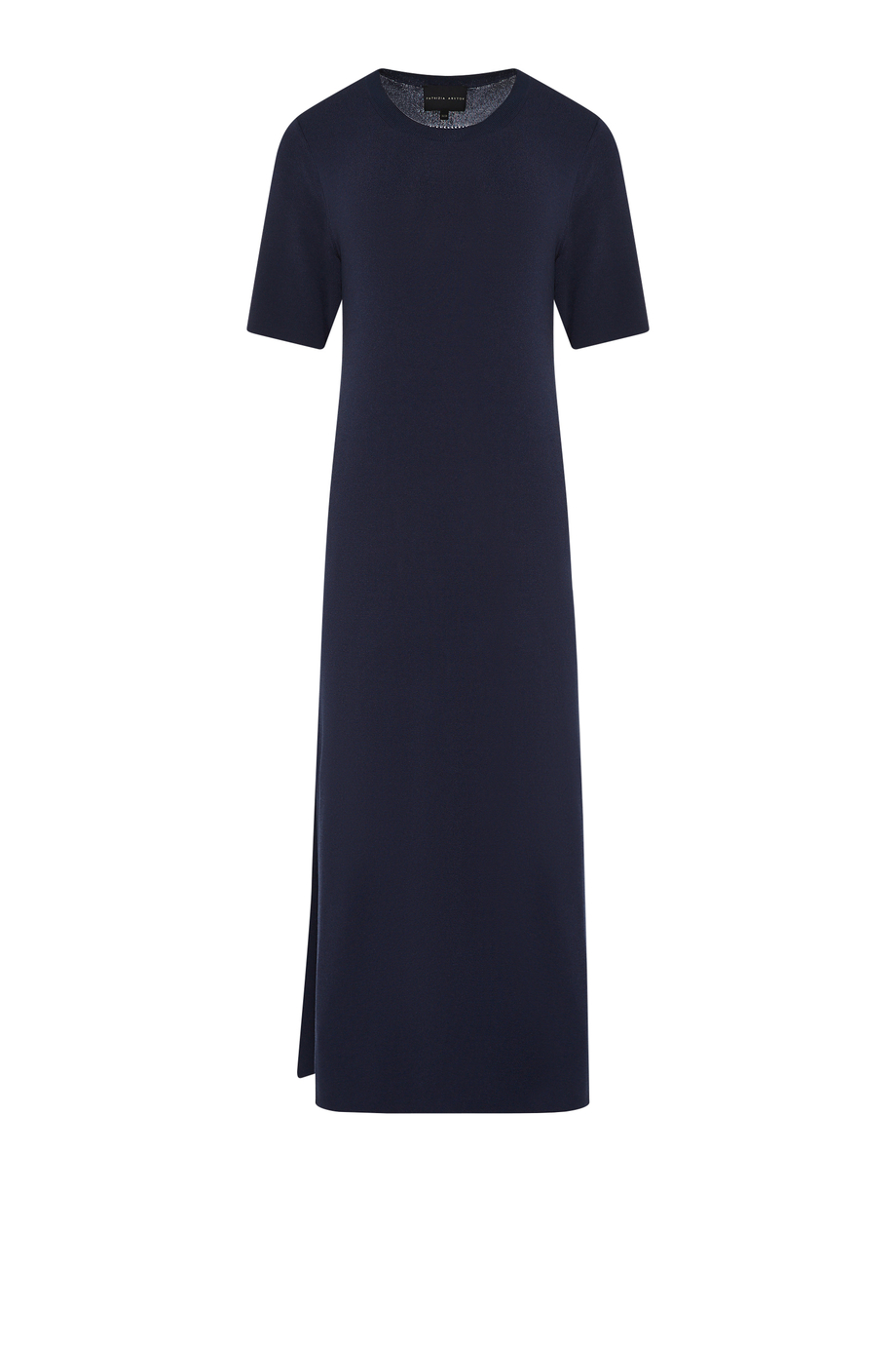 Rochie midi cu mânecă scurtă. Croială simplă, decolteu rotund. Tricot moale, fluid. Despărțituri laterale.