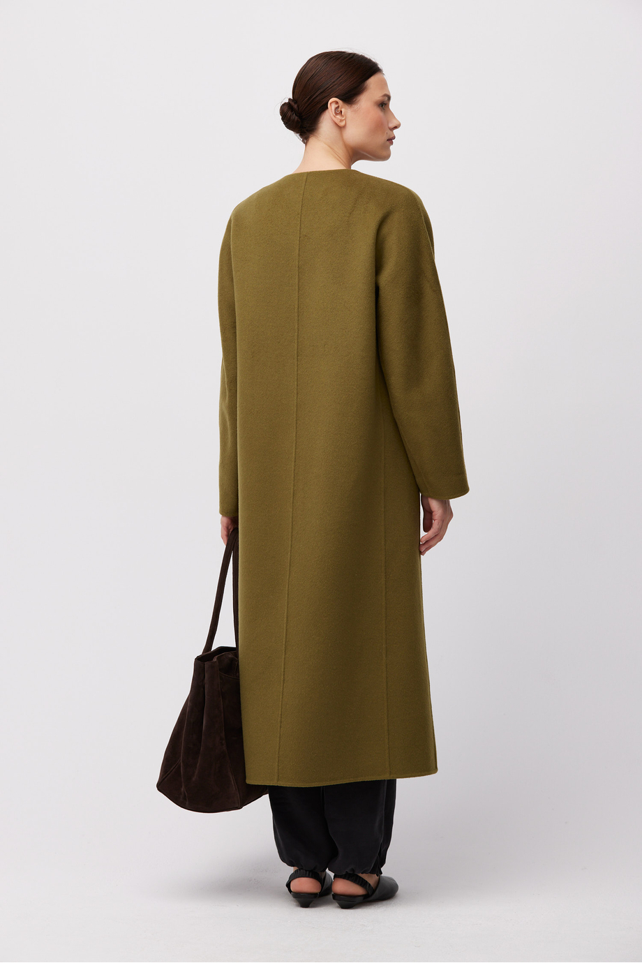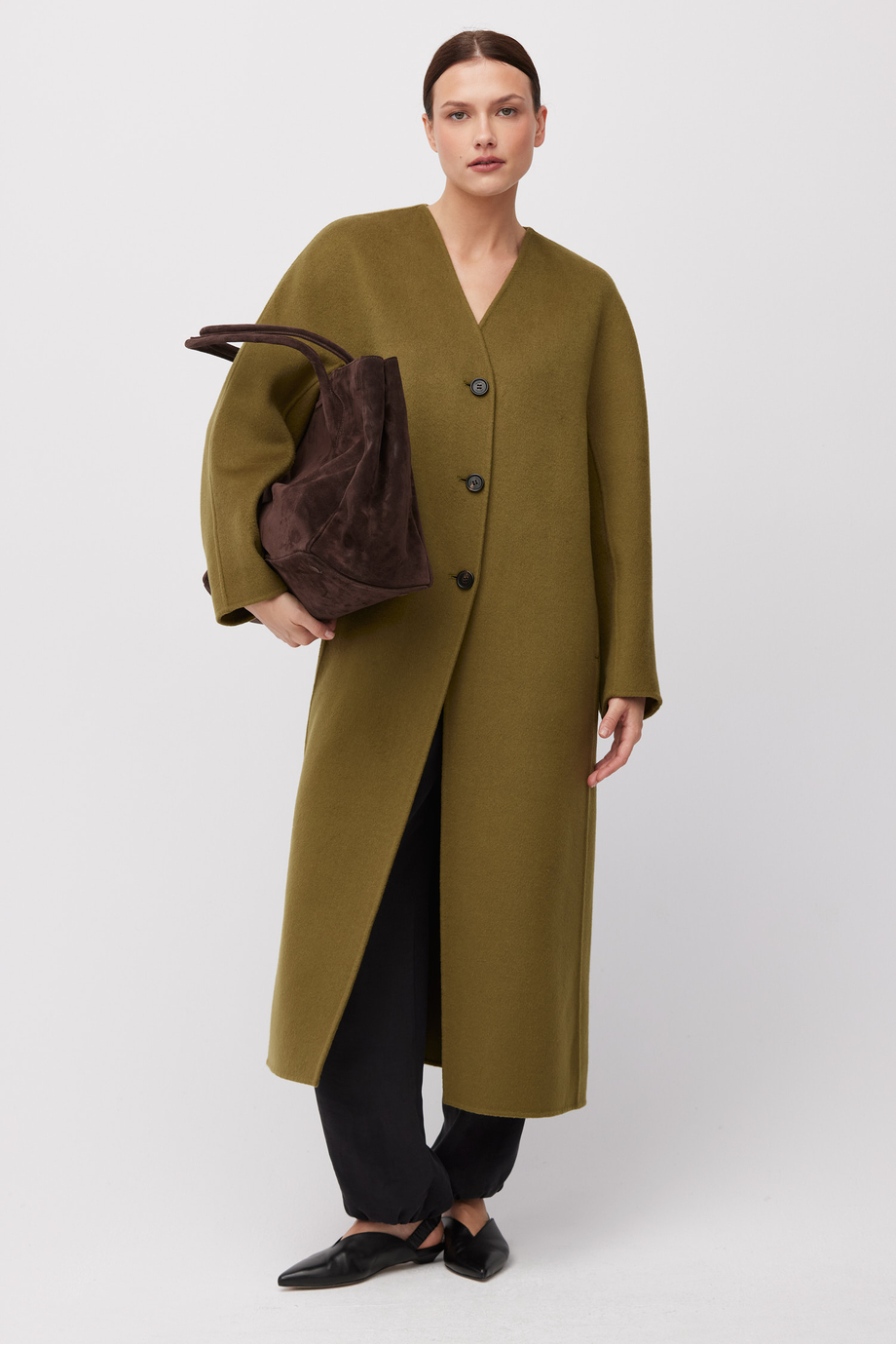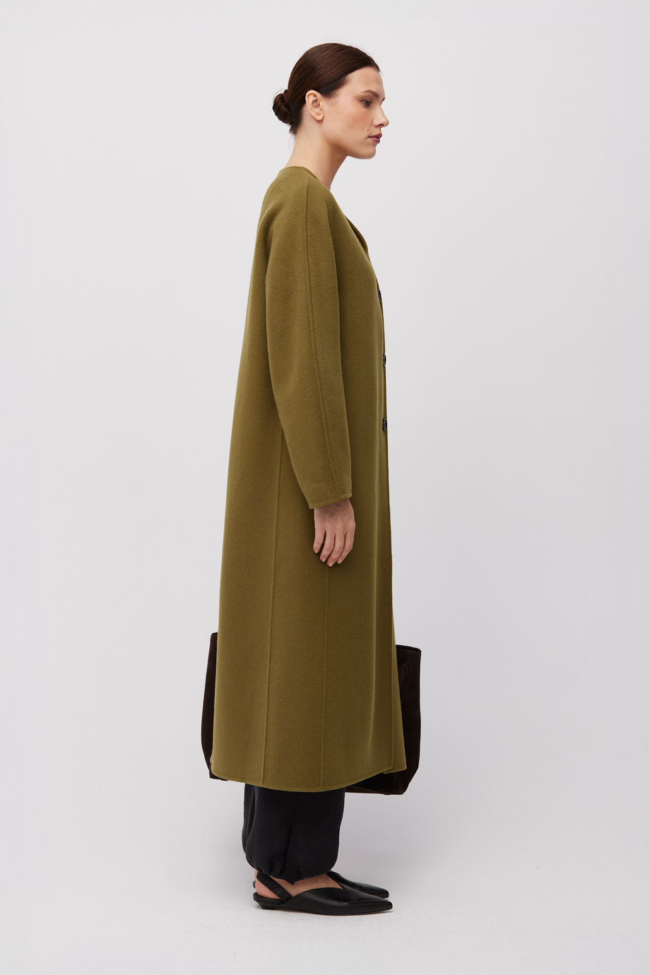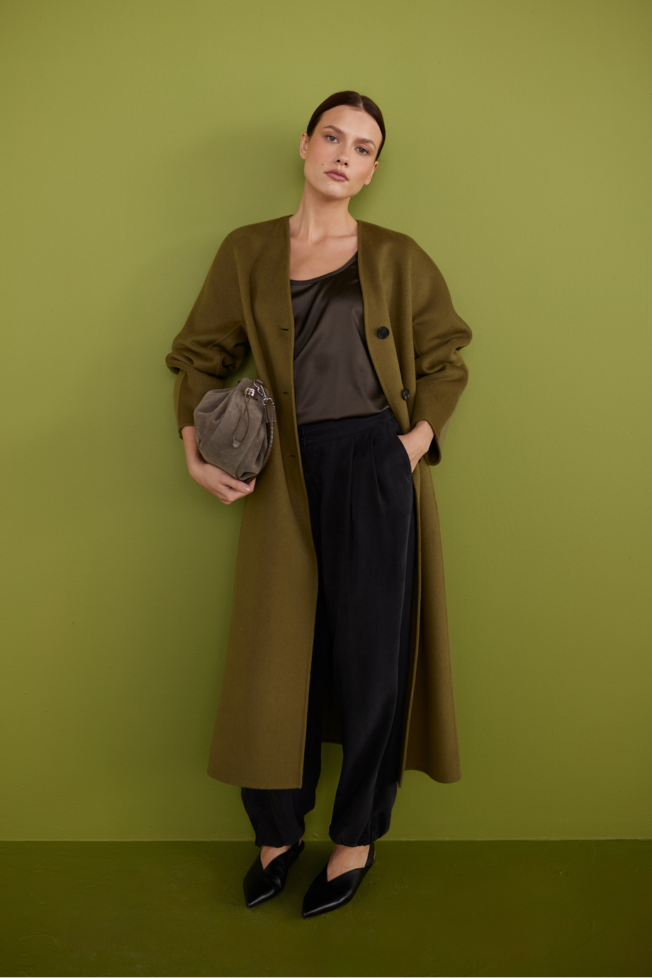 Palton doubleface cu mătase. Închidere cu nasturi. Lungime midi. Croială lejeră. Model fără căptușeală. Confortabil și ușor la purtare. Culoare verde.