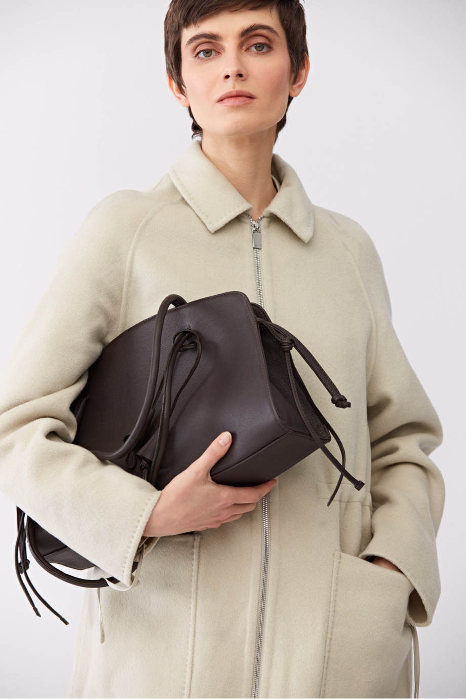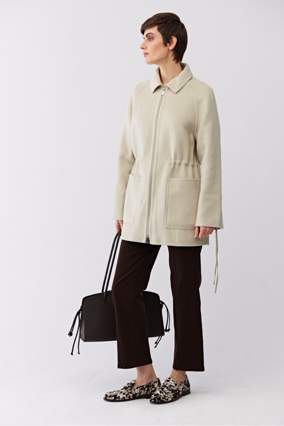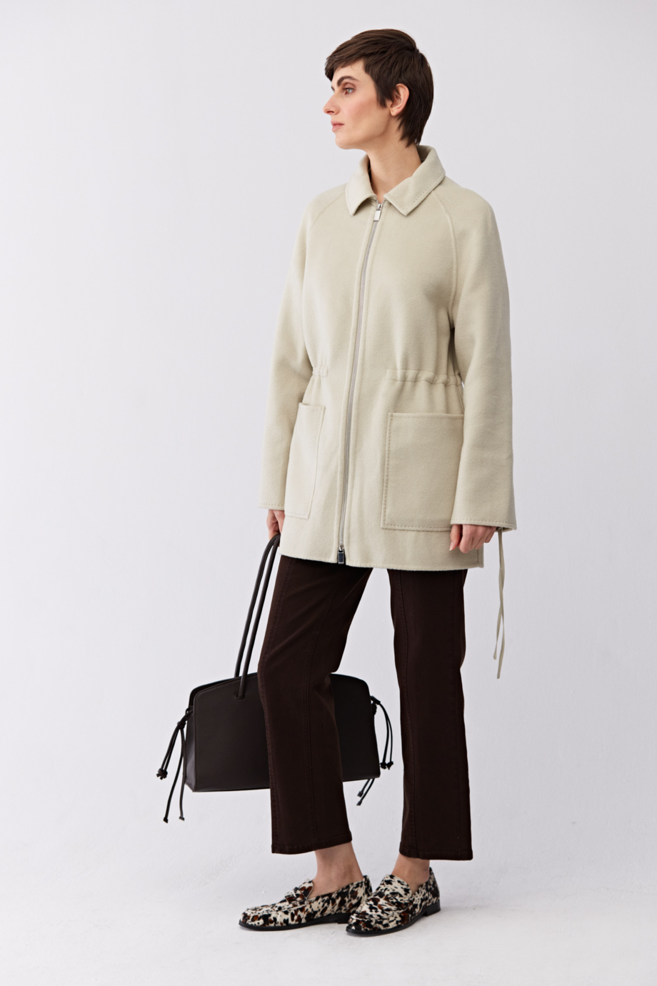 Geacă doubleface cu mătase. Fără căptușeală. Croială simplă, lejeră. Guler, buzunare aplicate. Închidere cu fermoar. Posibilitate de reglare în talie. Culoare verde deschis.