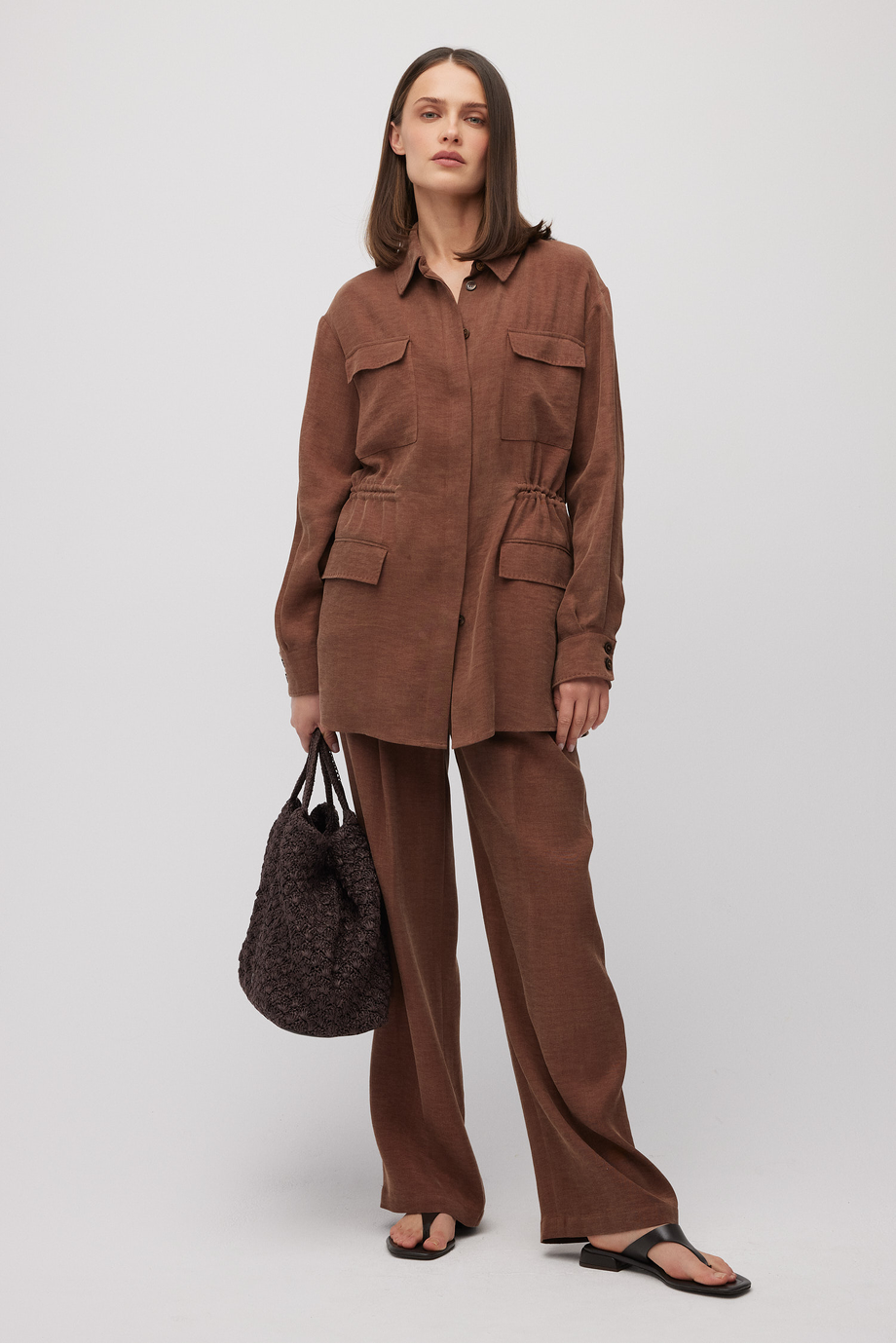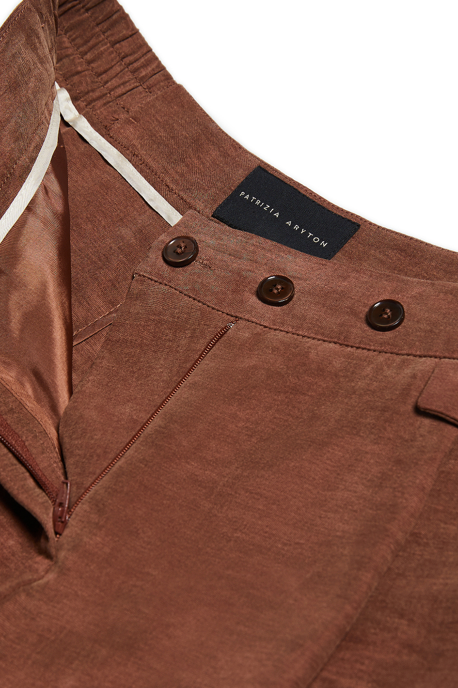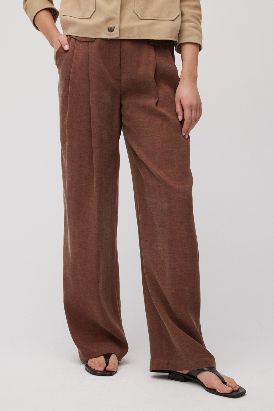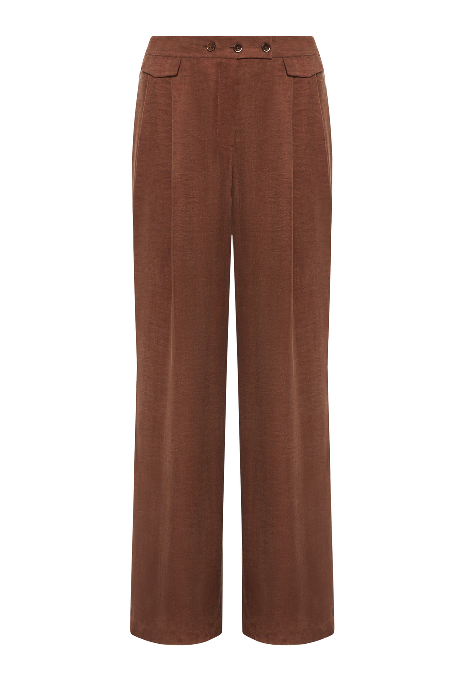 Pantaloni cu talie înaltă confecționați din amestec de lyocell și in. Picior larg, pense, închidere cu fermoar, cârlig și nasture corozo pe interior. Interior cu paspoal decorativ. Buzunare. Culoare: maro. Pentru completarea setului – palton din aceeași țesătură.