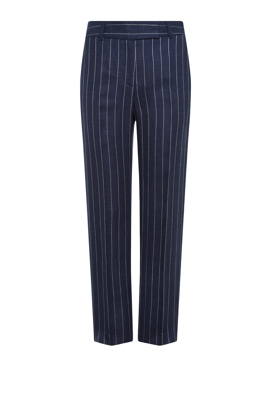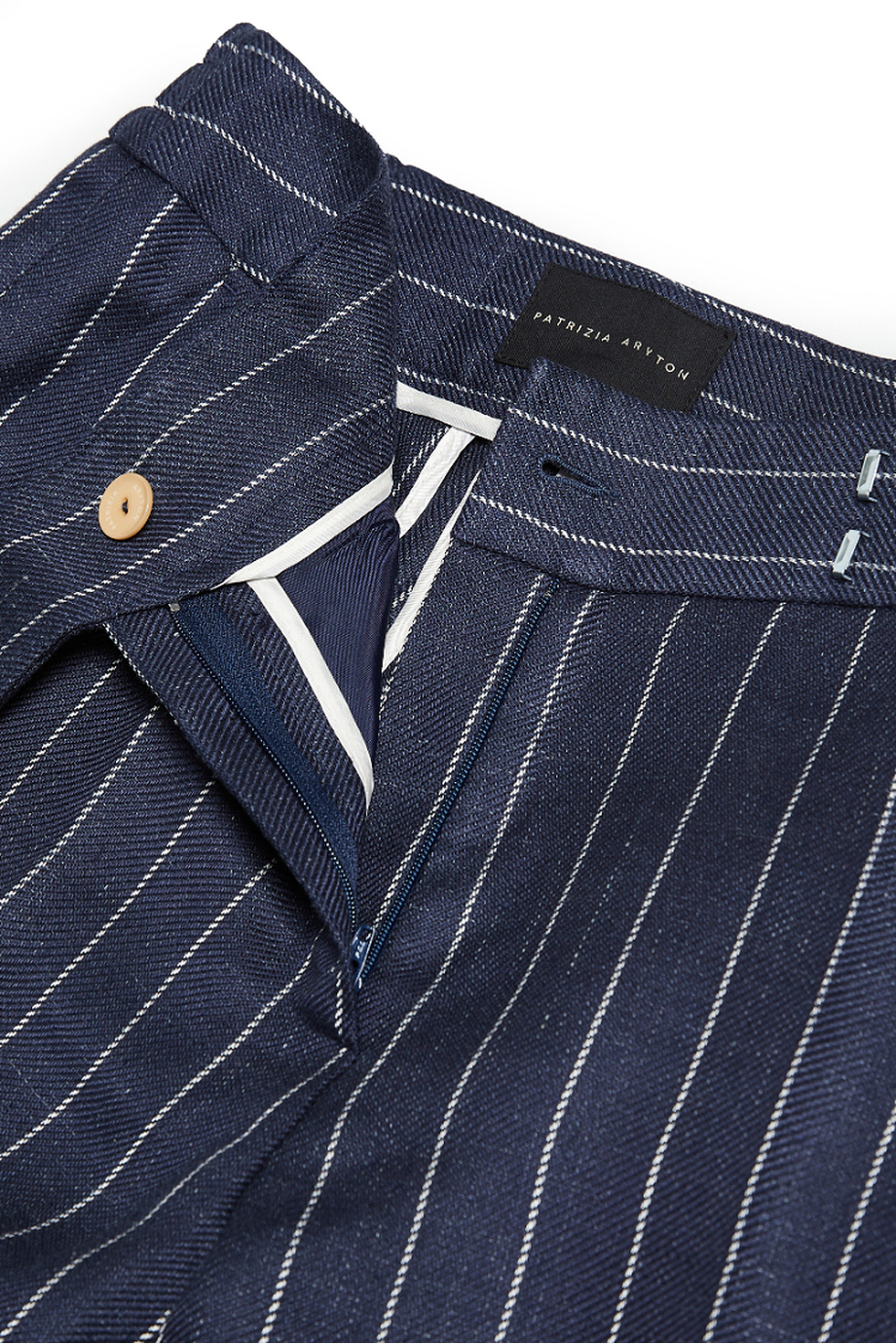 Pantaloni în dungi tenis. Croială ușor conică. Buzunare. Închidere cu fermoar, cârlig și nasture corozo pe interior. Interior cu paspoal decorativ. Buzunare. Culoare: bleumarin. Pentru completarea setului – sacou din aceeași țesătură.