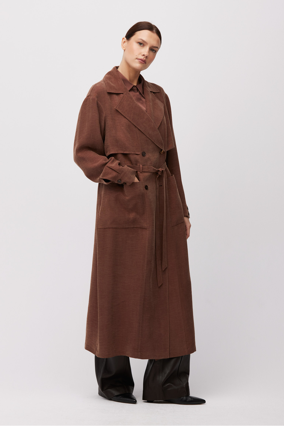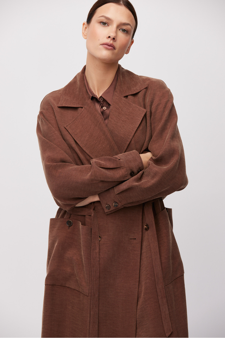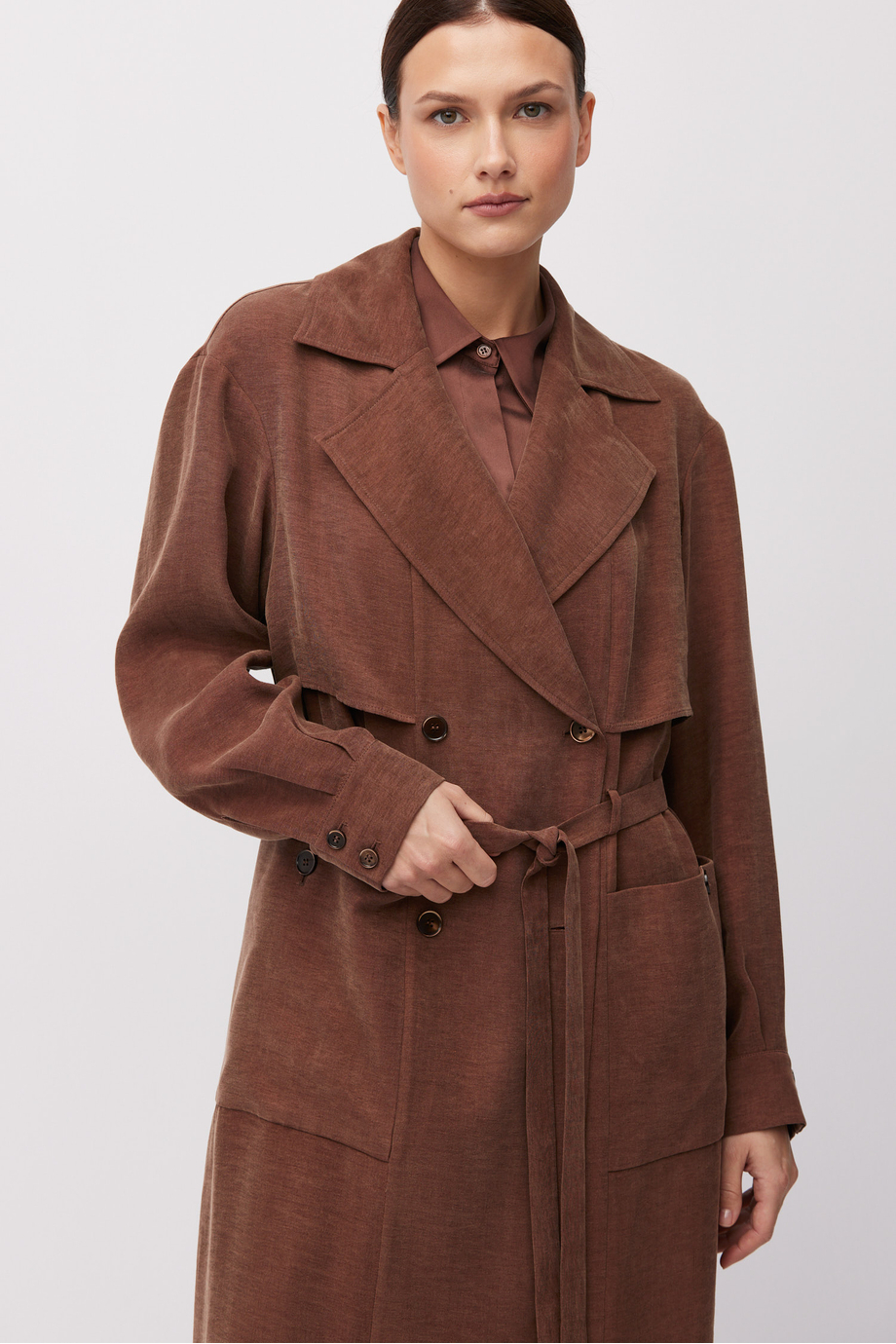 Palton maro din țesătură ușoară – amestec de lyocell și in. Mânecă lungă, guler, buzunare. Închidere cu nasture și cordon. Pe jumătate căptușit, cu finisaje decorative. Fantă la spate.