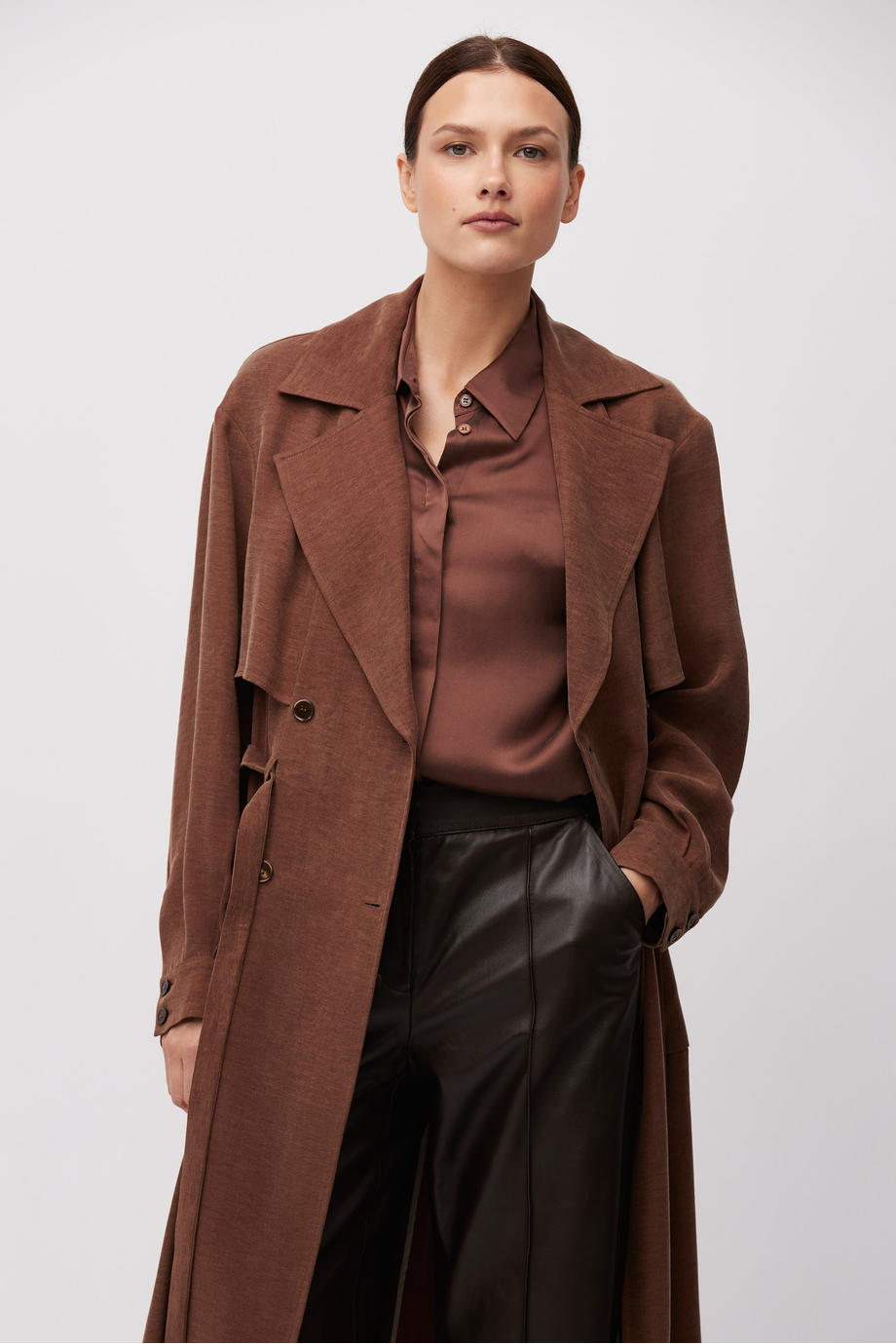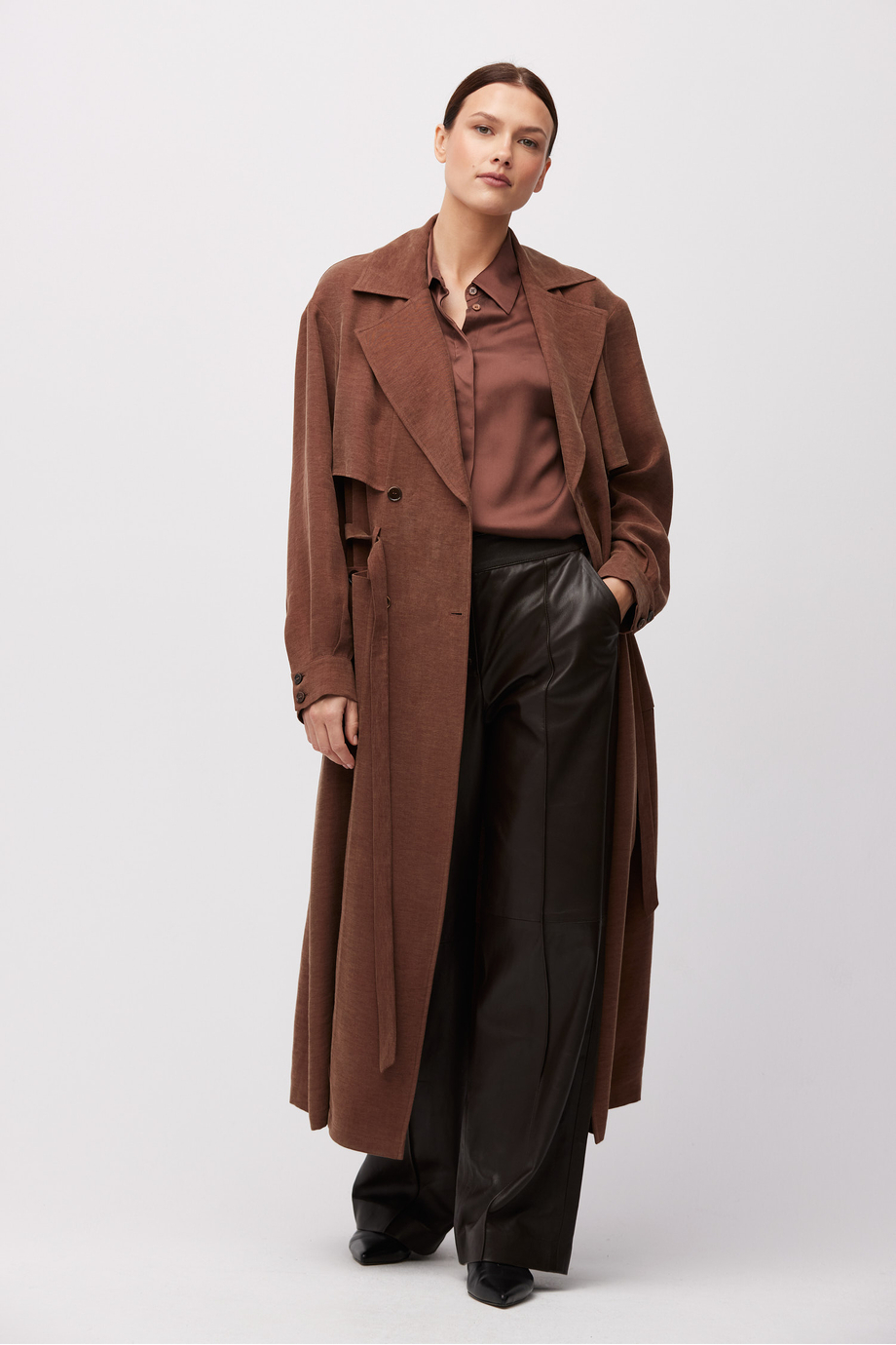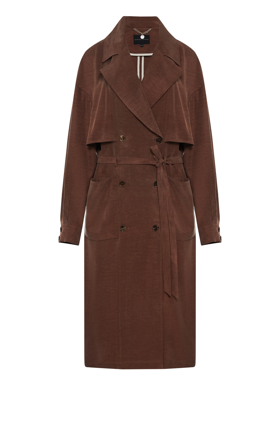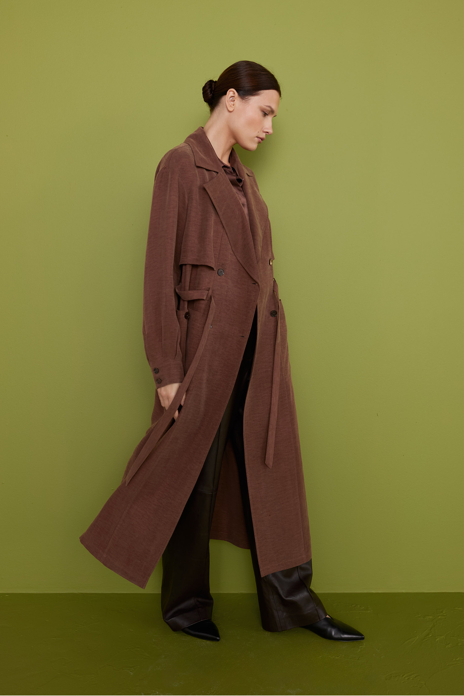 Palton maro din țesătură ușoară – amestec de lyocell și in. Mânecă lungă, guler, buzunare. Închidere cu nasture și cordon. Pe jumătate căptușit, cu finisaje decorative. Fantă la spate.