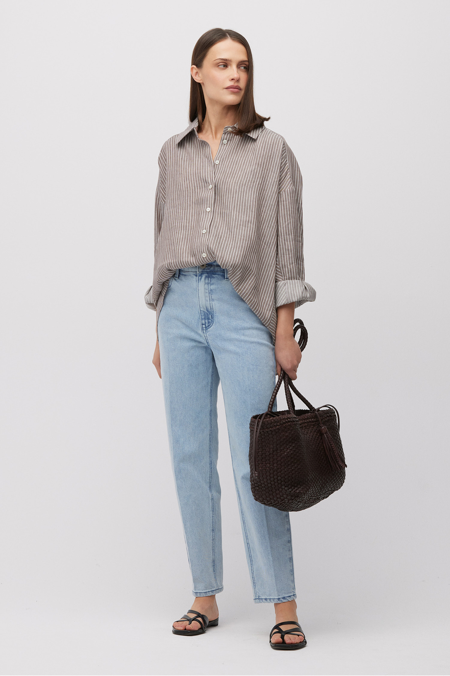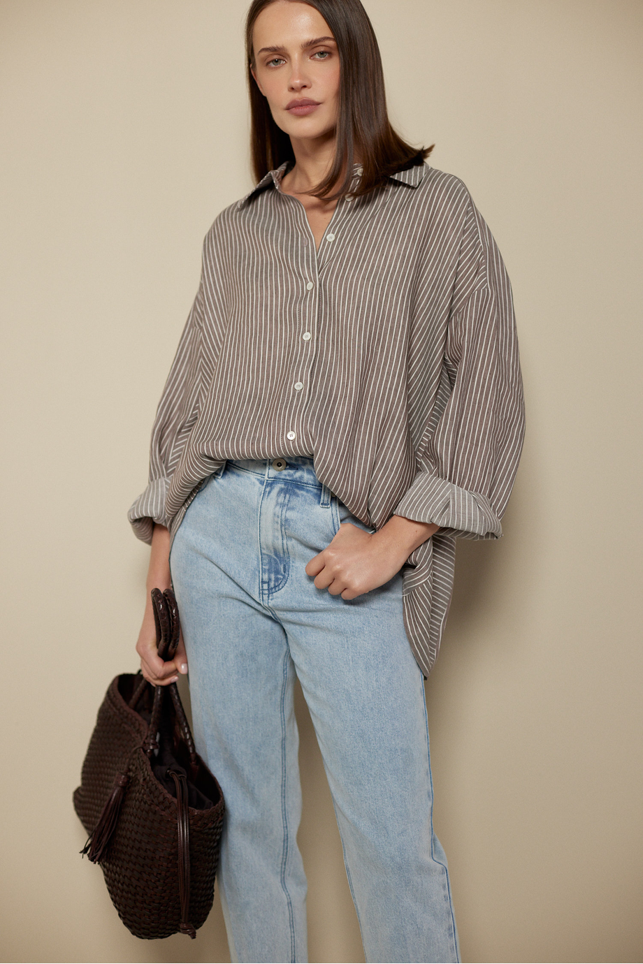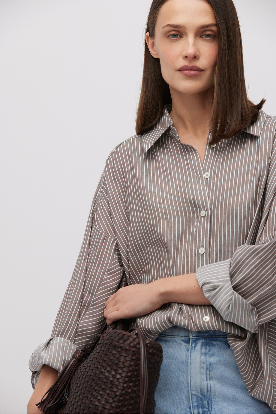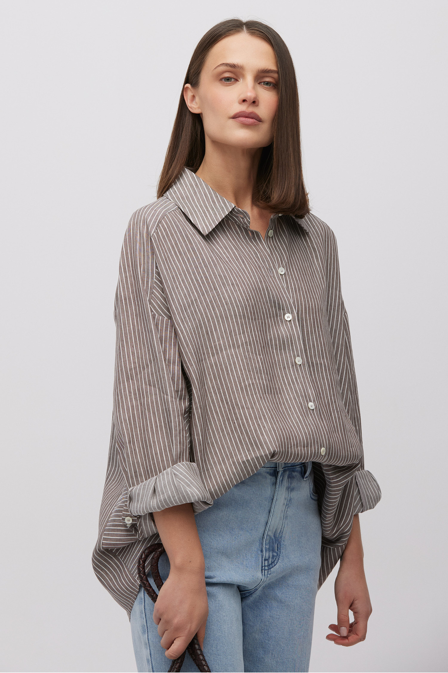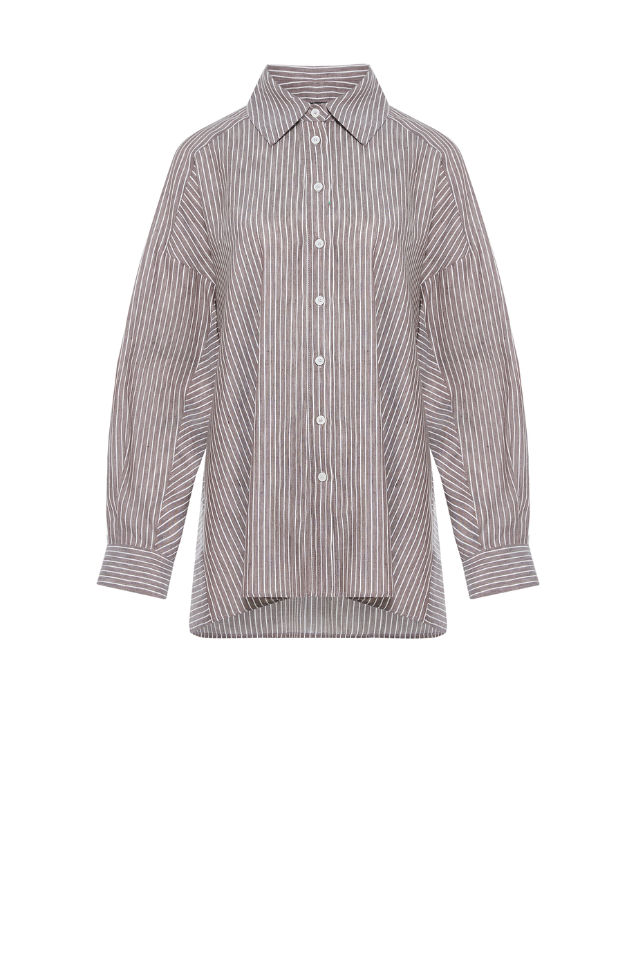 Cămașă în dungi din amestec de in și lyocell. Închidere cu nasturi. Guler, mânecă lungă. Croială lejeră. Culoare: maro.