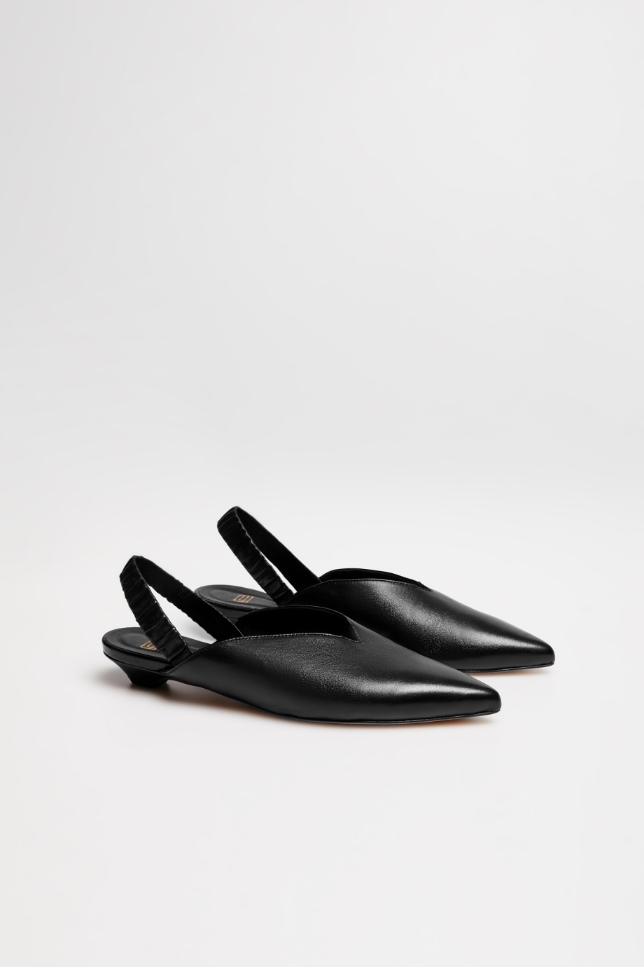 Model tip slingback cu toc jos. Realizați din piele naturală moale de capră și de oaie, de culoare neagră. Vârf migdalat caracteristic și curea elastică. Produși manual într-o manufactură italiană.