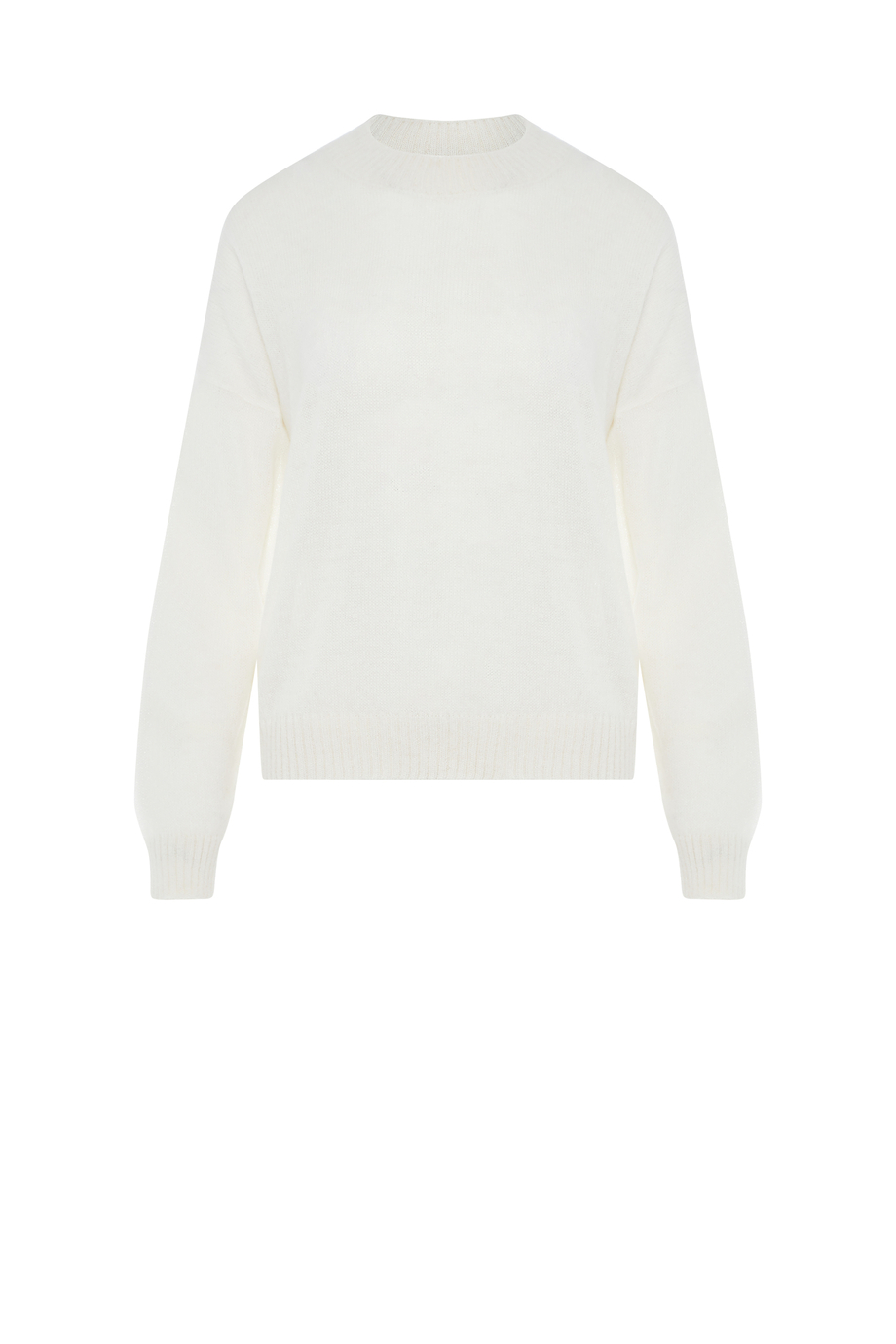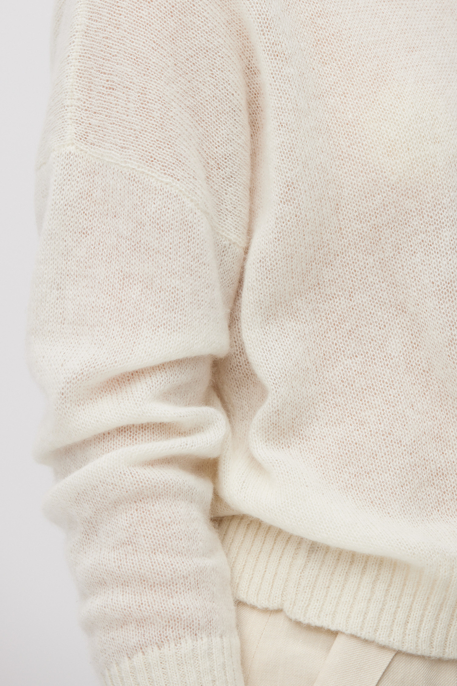 Pulover din amestec de lână baby suri alpaca și lână merinos. Decolteu rotund, mânecă lungă. Croială lejeră, boxy. Tricot moale cu structură lejeră single jersey, realizat pe mașină cu finețe 7 GG. Culoare: alb.
