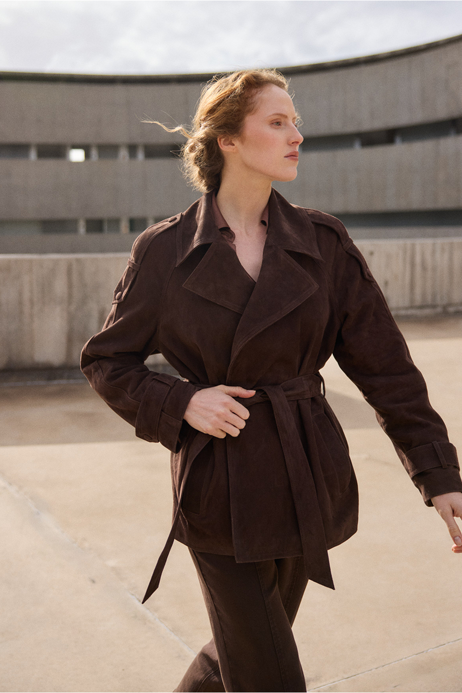 Geacă maro cu curea. Piele naturală de capră, moale. Cu căptușeală. Buzunare. Croială lejeră.