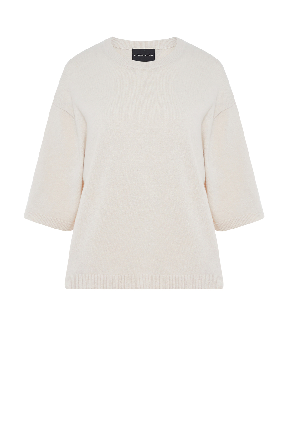 Bluză din lână merinos. Decolteu rotund, mânecă scurtă. Croială lejeră, tip boxy. Tricot moale cu structură fină single jersey, realizat pe mașină de tricotat 12 GG. Culoare gri.