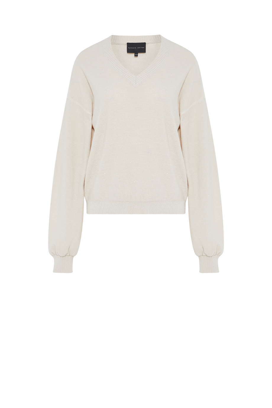 Bluză din amestec de bumbac, mătase și lyocell. Mânecă lungă, decolteu în V. Croială lejeră. Tricot moale cu paiete fin înpletite, realizat pe mașină de finețe 12 GG. Culoare bej.