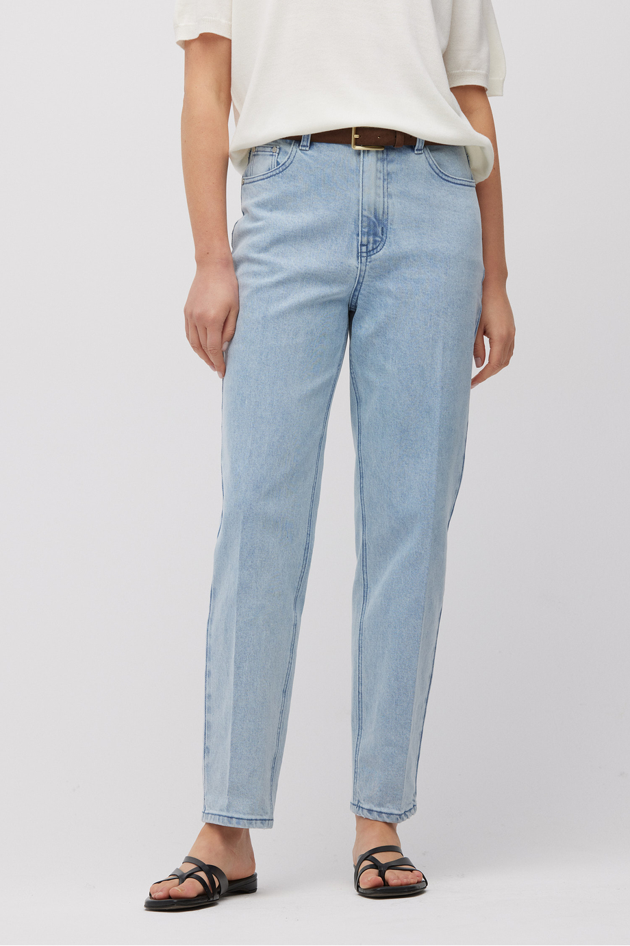 Jeans cu croială conică. Croi clasic cu cinci buzunare. Talie înaltă. Închidere cu fermoar și nasture metalic. Realizați din bumbac cu adaos de elastan – moi și confortabili la purtare. Culoare: bleumarin.