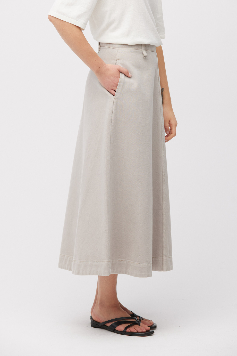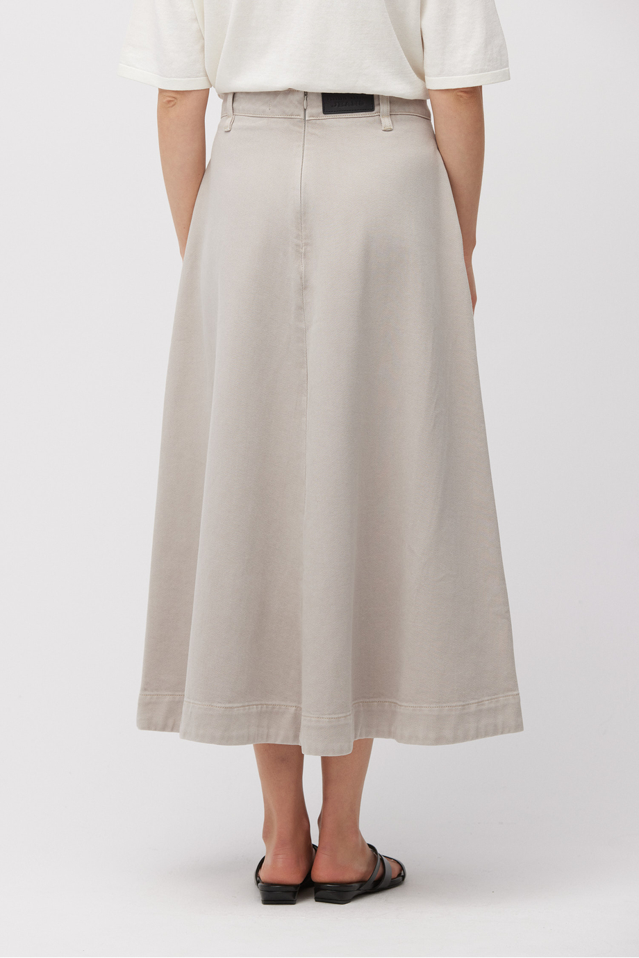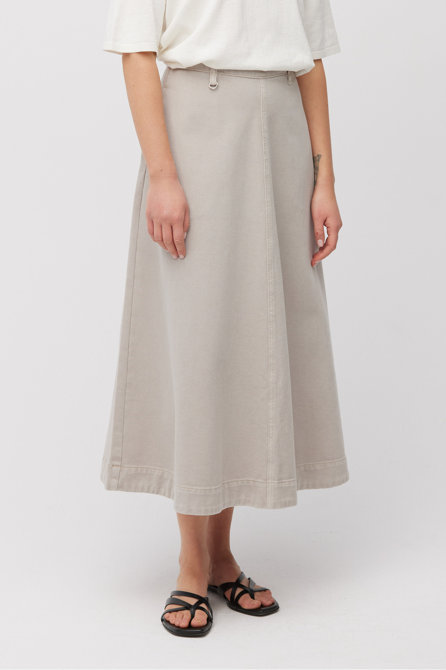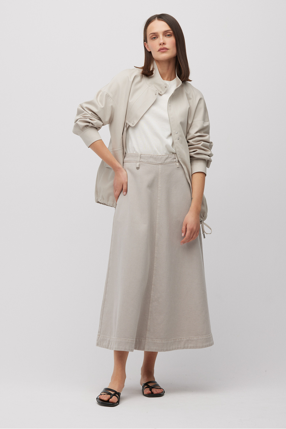 Fustă gri din denim confecționată din amestec de bumbac și lyocell. Gaici pentru curea. Buzunare. Închidere cu fermoar și nasture. Croială lejeră.