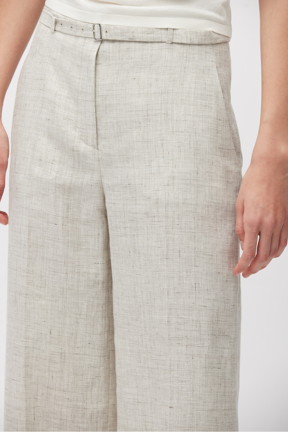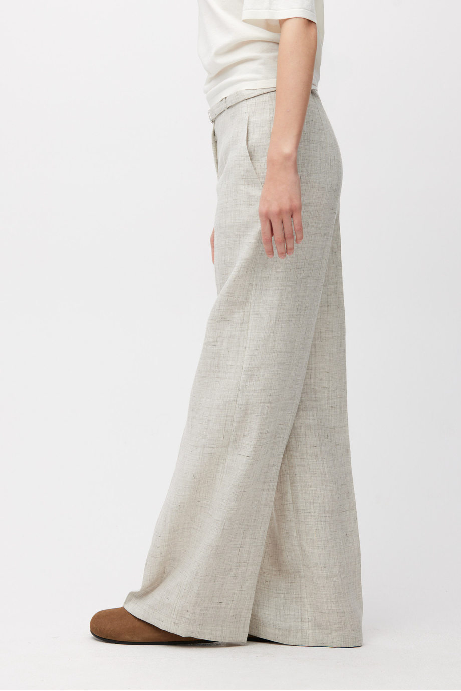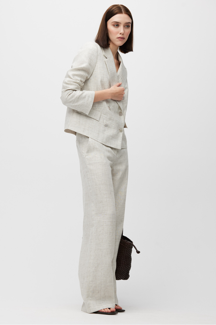 Pantaloni din in cu talie înaltă. Croială cu picior larg, închidere cu fermoar, cârlig și nasture corozo pe interior. Curea din aceeași țesătură. Interior finisat cu bandă decorativă. Buzunare. Culoare bej rece. Pentru completarea setului – sacou din aceeași țesătură.