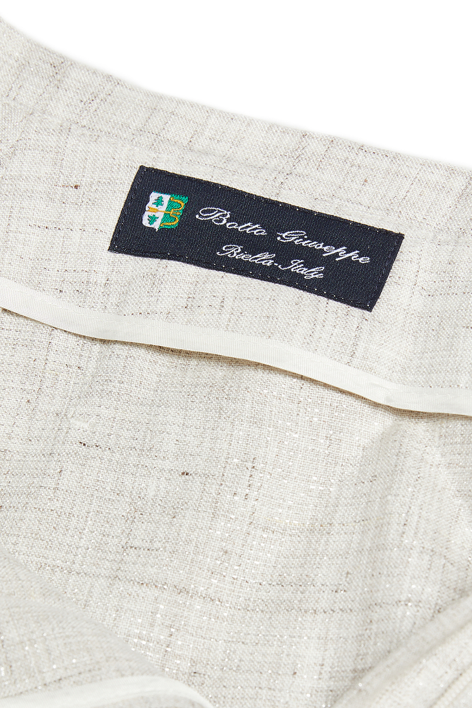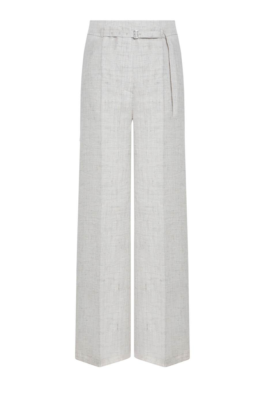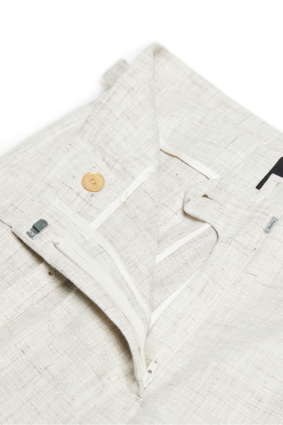 Pantaloni din in cu talie înaltă. Croială cu picior larg, închidere cu fermoar, cârlig și nasture corozo pe interior. Curea din aceeași țesătură. Interior finisat cu bandă decorativă. Buzunare. Culoare bej rece. Pentru completarea setului – sacou din aceeași țesătură.